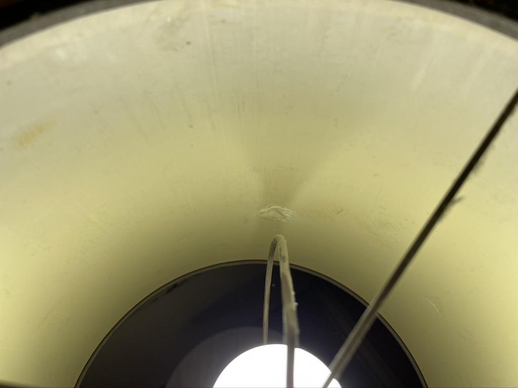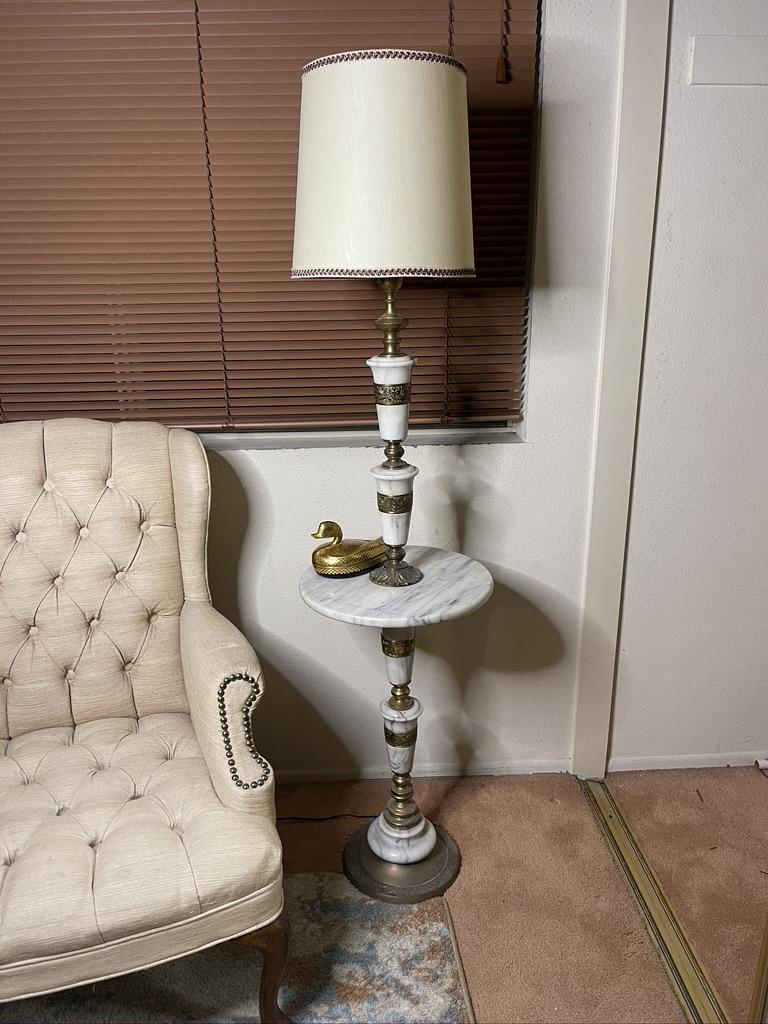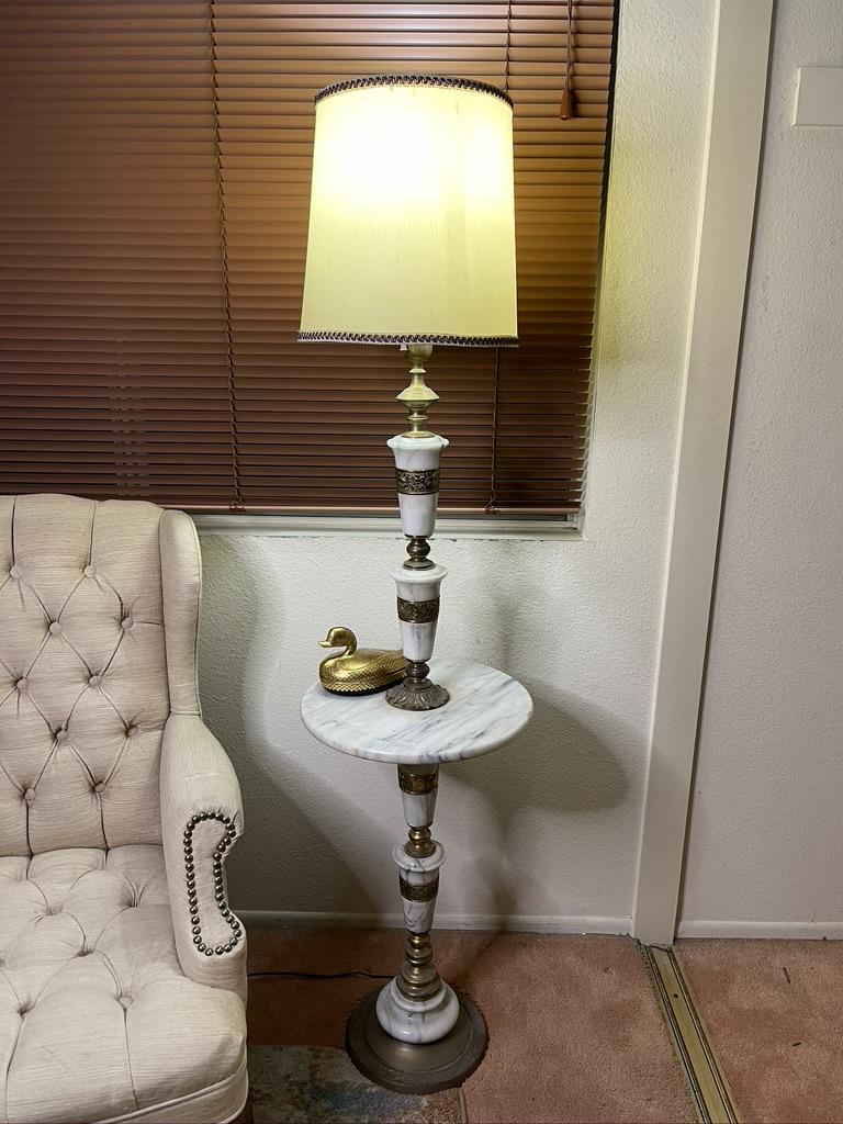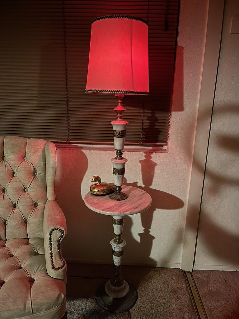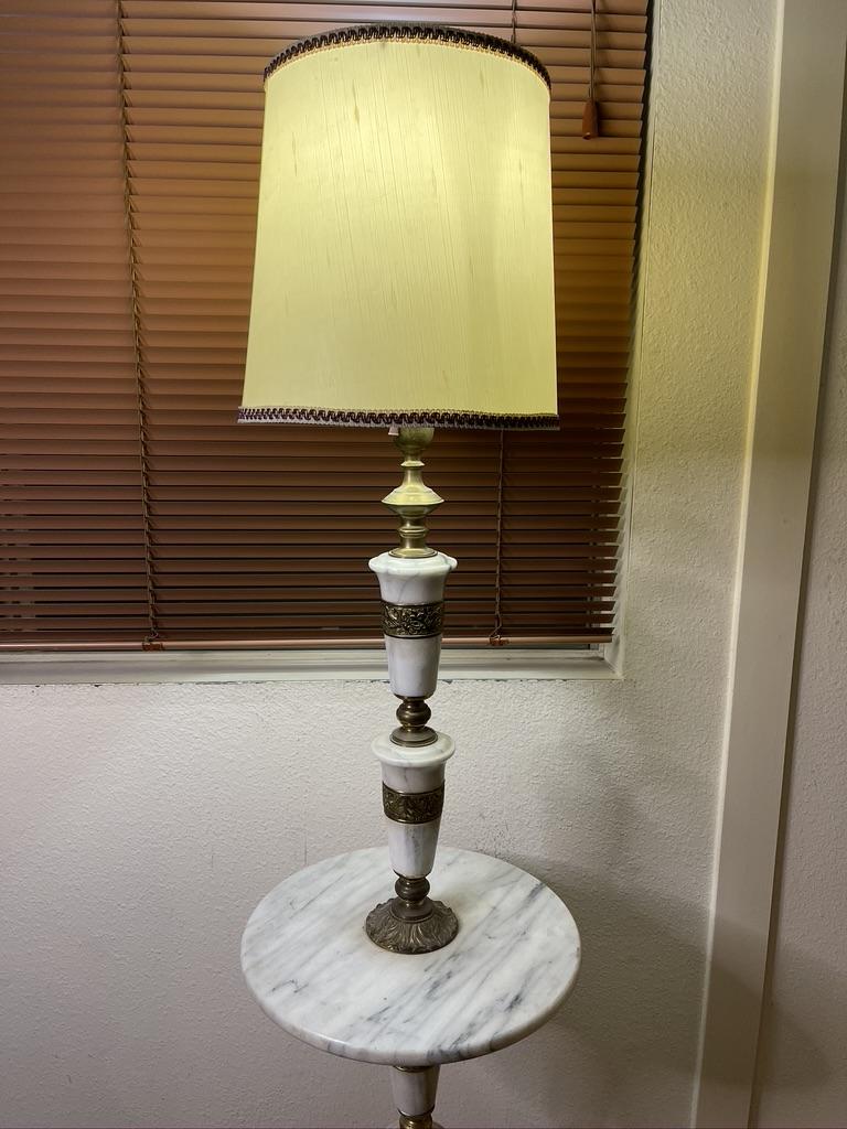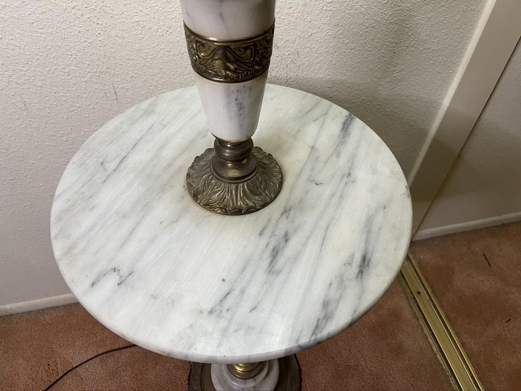 Working marble table lamp with nightlight bulb. Lampshade is damaged due to a hot lightbulb.
