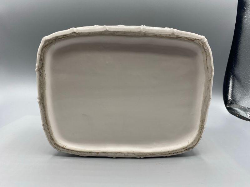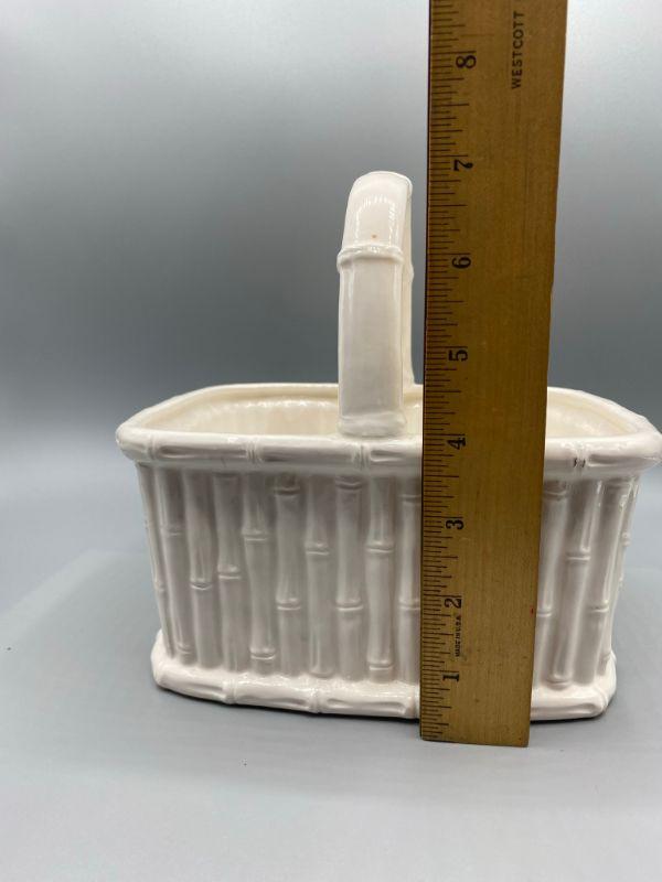 Small white ceramic planter. Has a couple small scuffs on the edge of one side. Stands about 7".