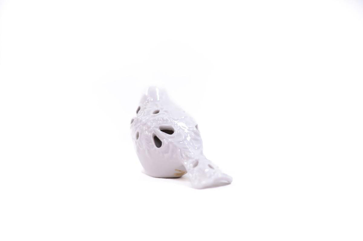 This is a ceramic bird figurine with decorative cutouts. The figurine features a glossy finish and intricate cutouts on its body.