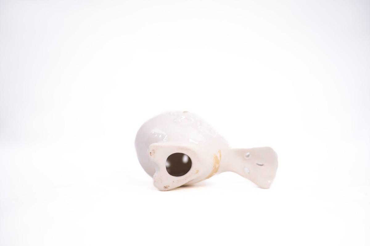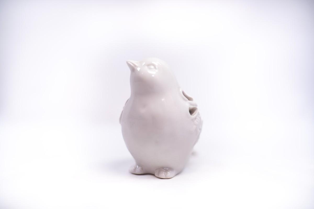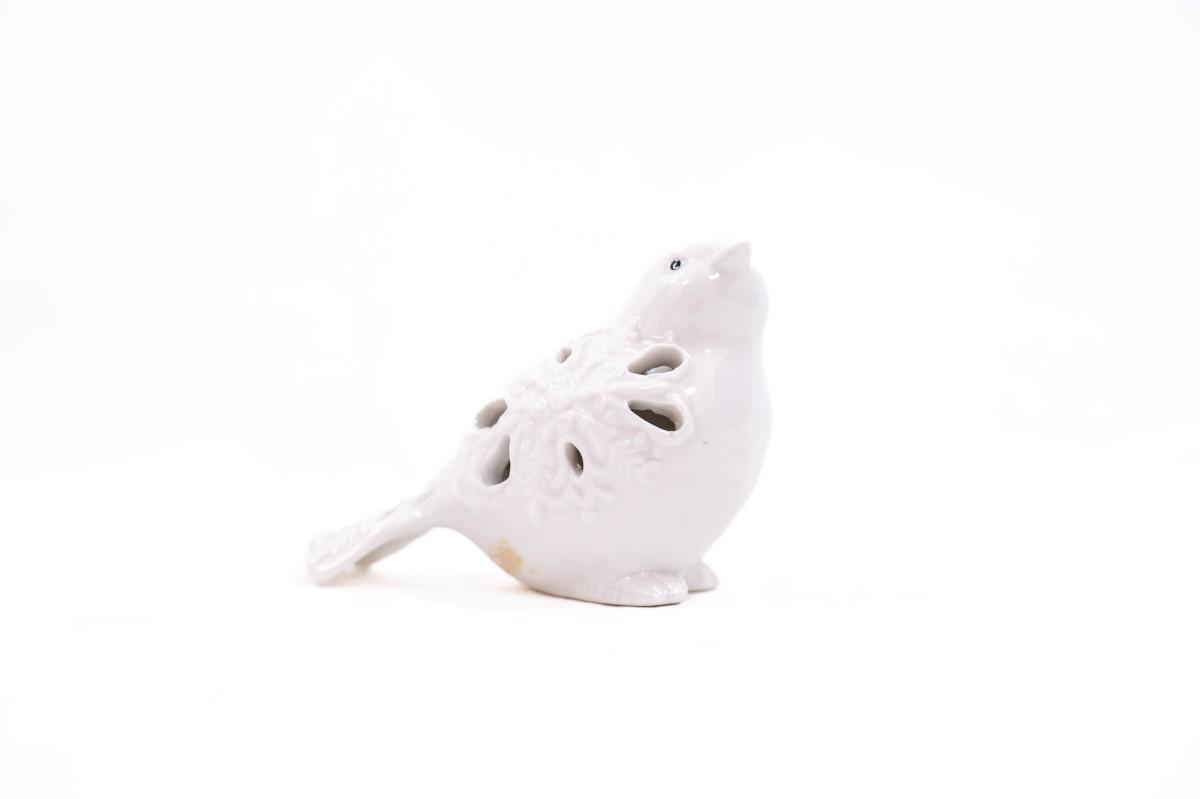 This is a ceramic bird figurine with decorative cutouts. The figurine features a glossy finish and intricate cutouts on its body.