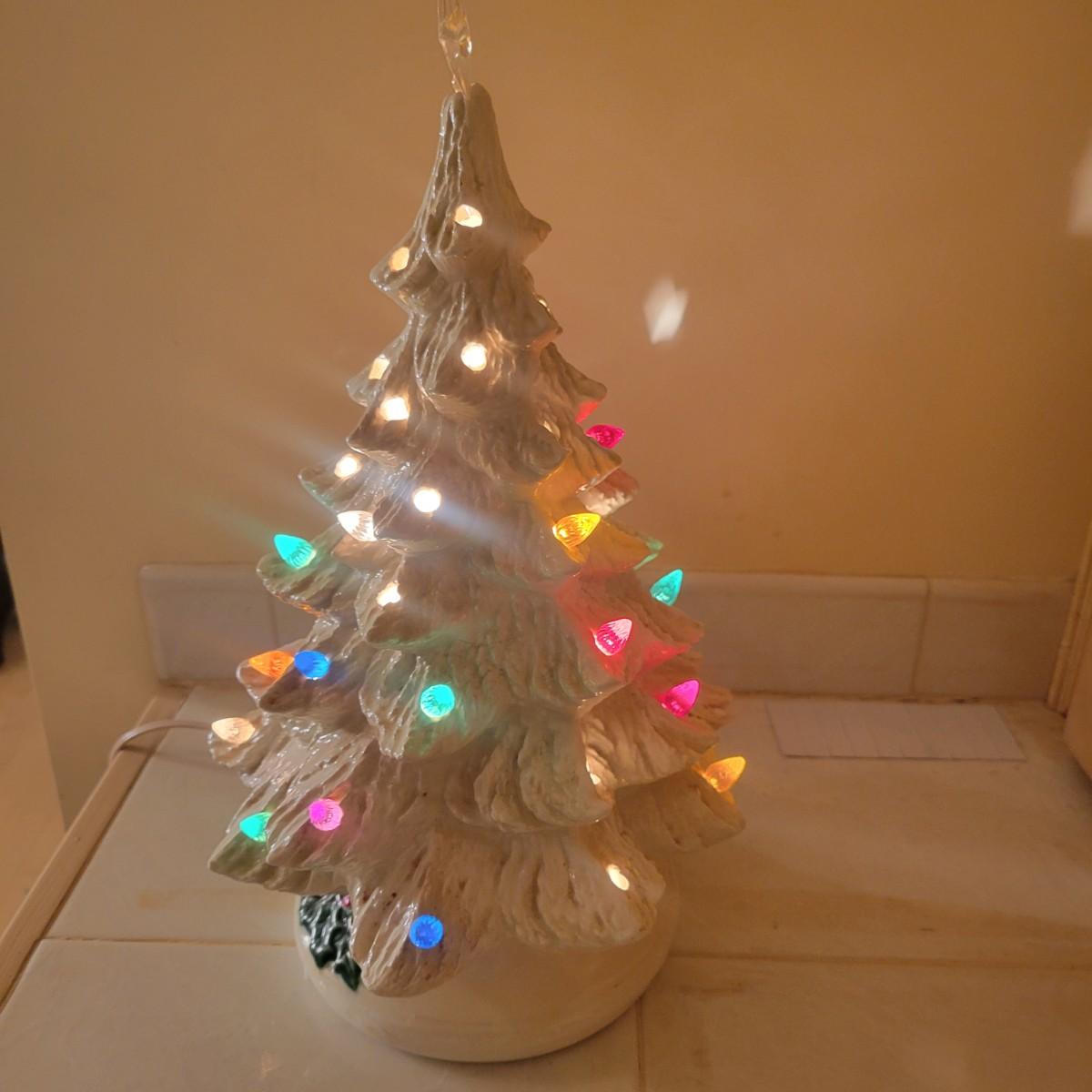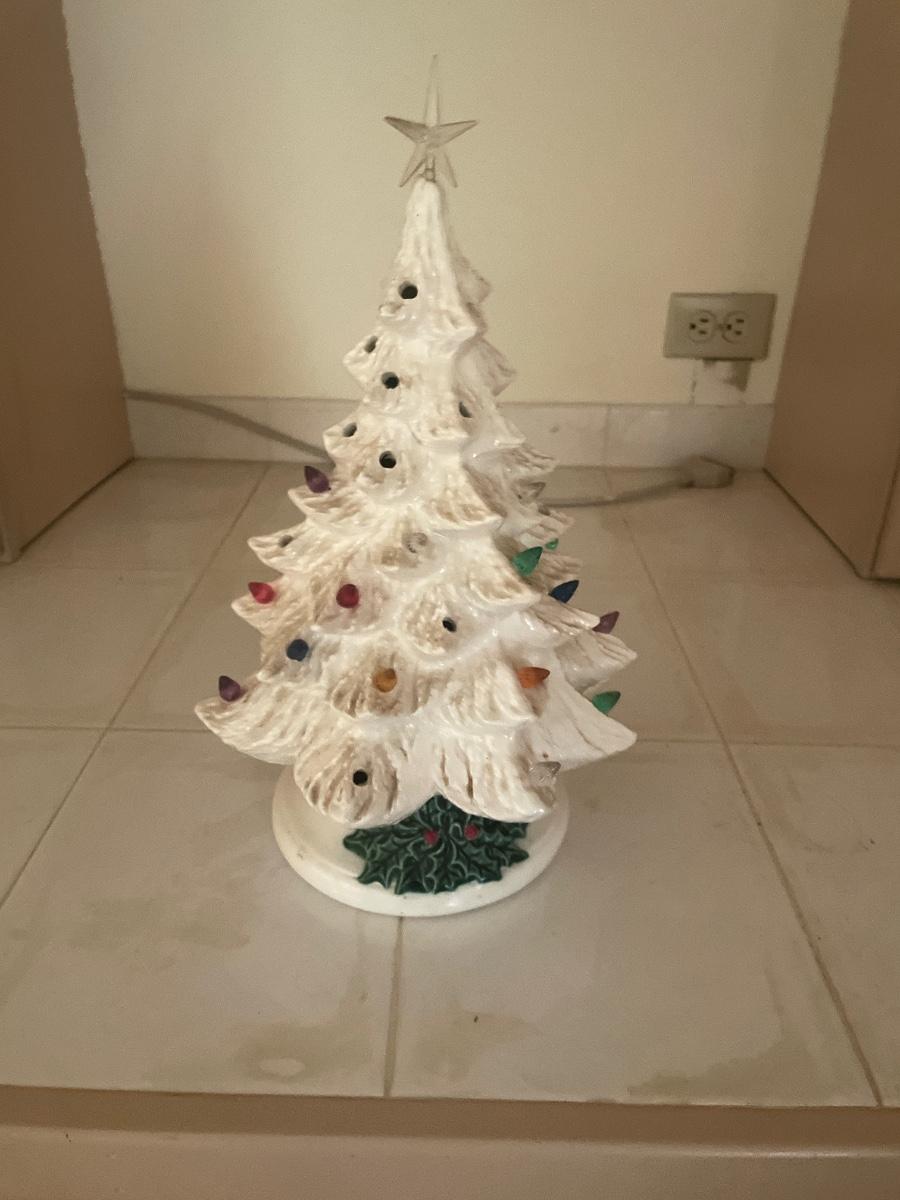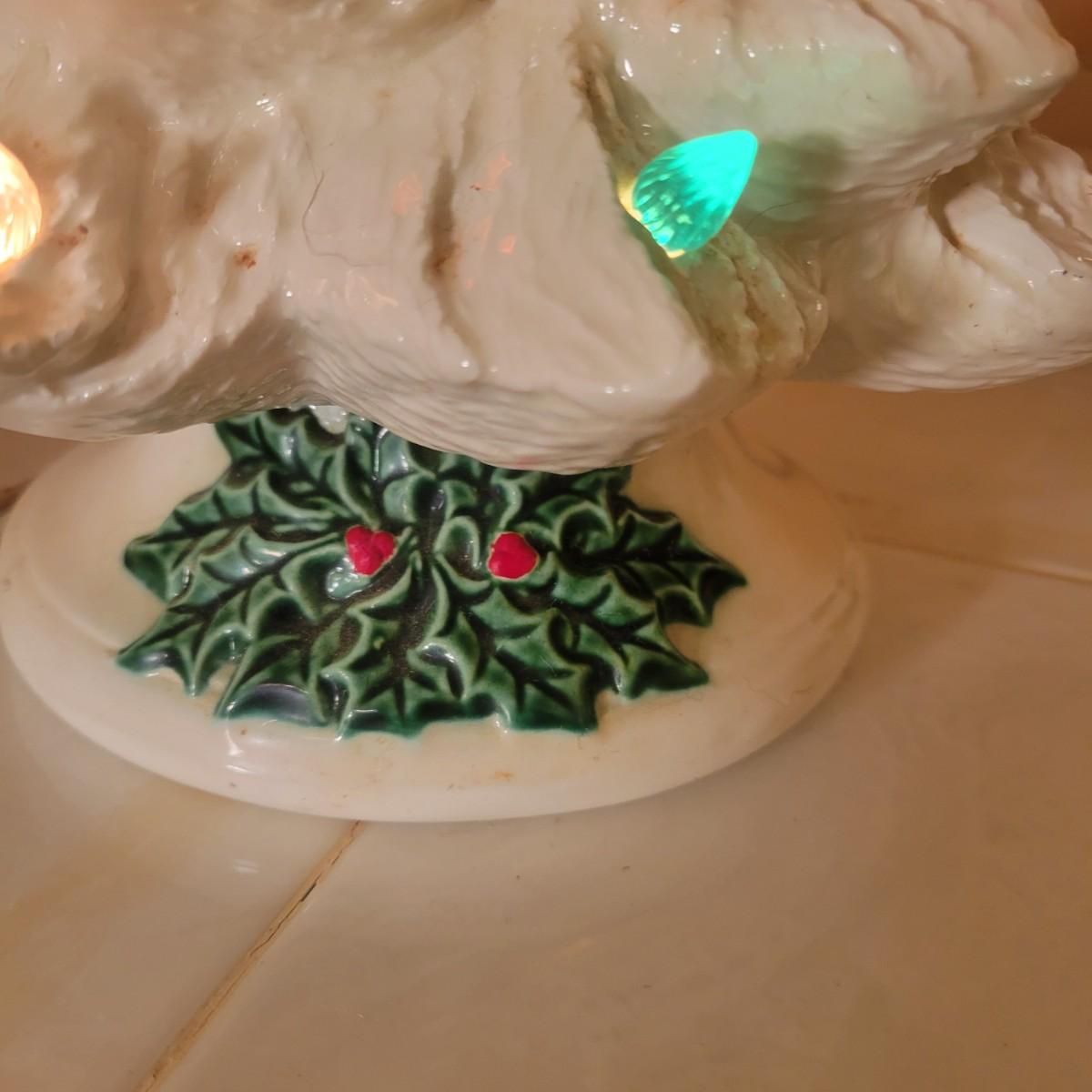 A white ceramic Christmas tree that lights up and has a music box that plays Silent Night that is in good condition. Tree is missing about twenty of its plastic ornaments. Measures approximately 9" x 16" Shipping available