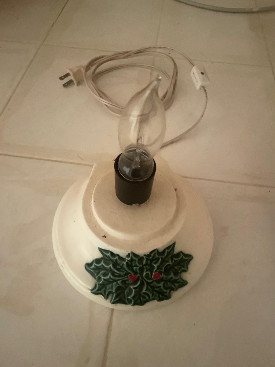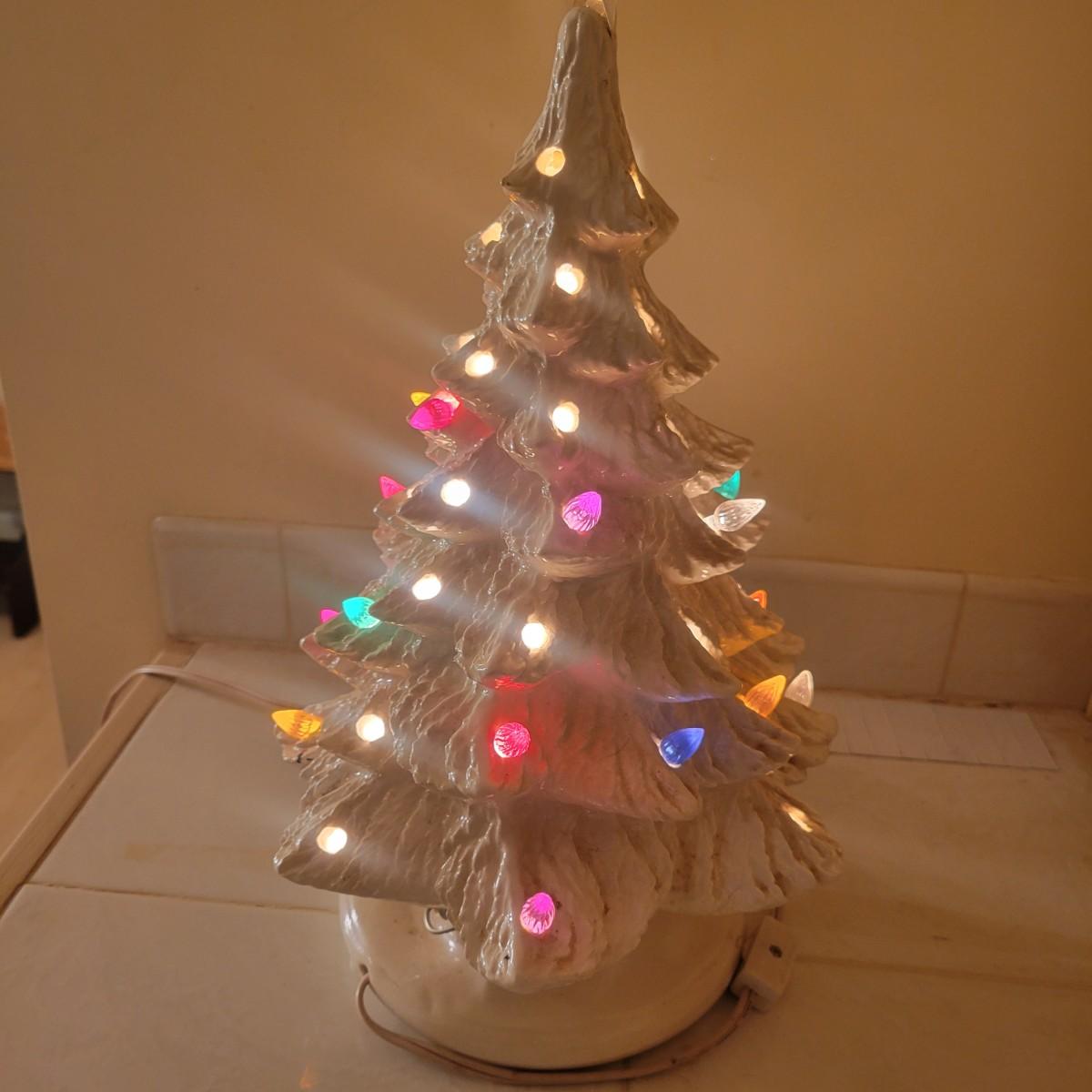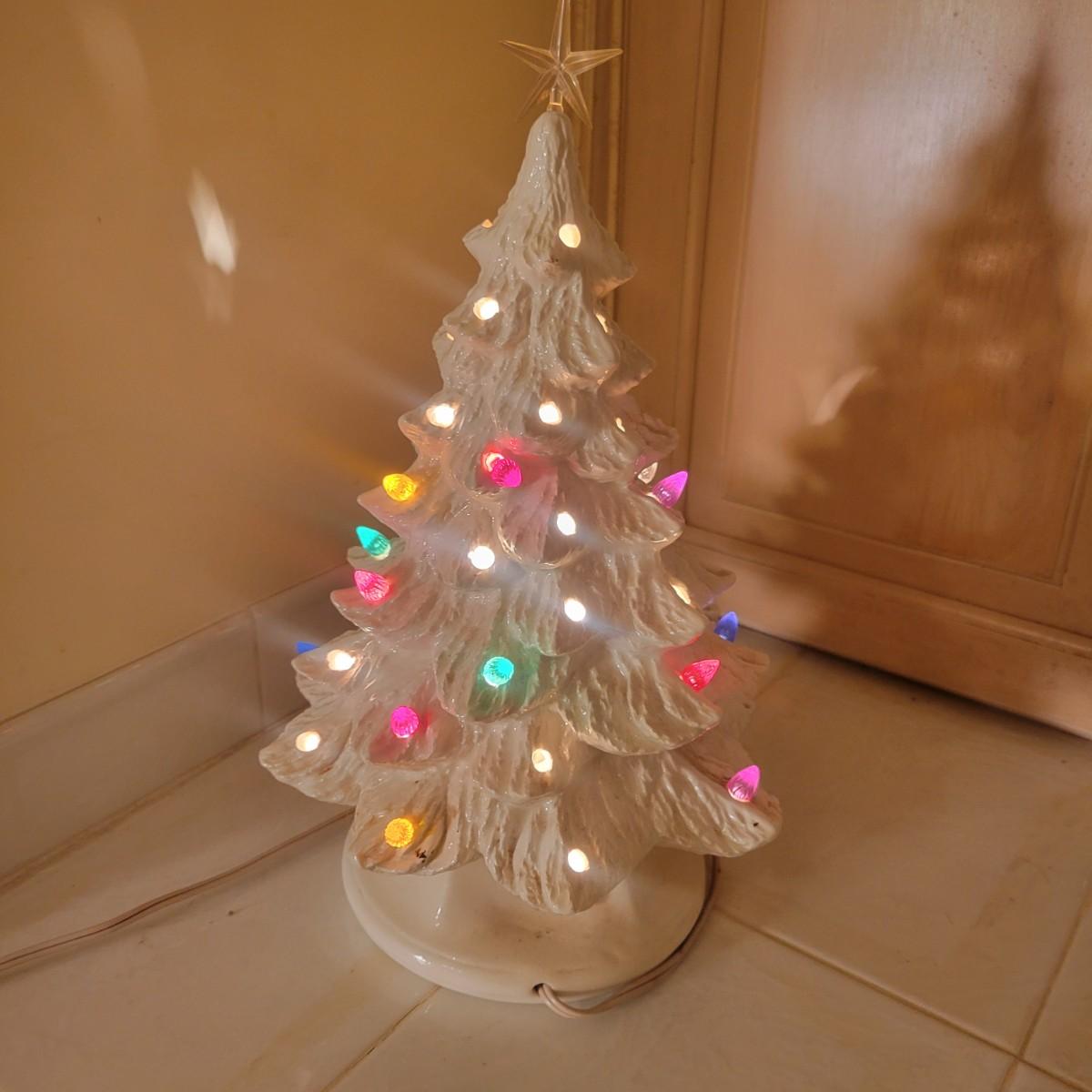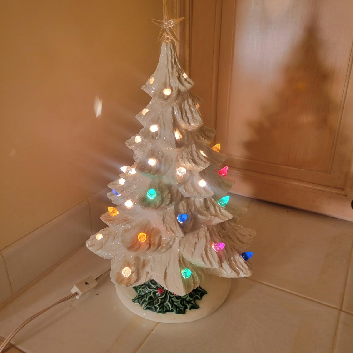 A white ceramic Christmas tree that lights up and has a music box that plays Silent Night that is in good condition. Tree is missing about twenty of its plastic ornaments. Measures approximately 9" x 16" Shipping available