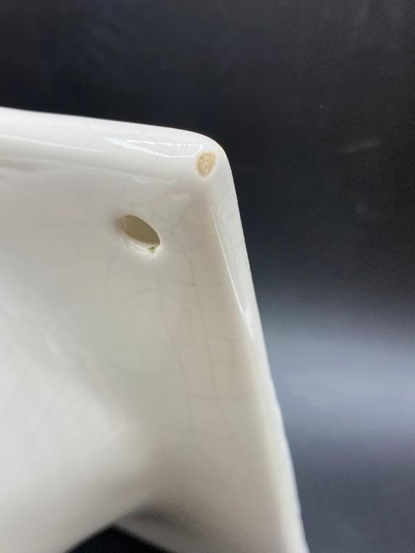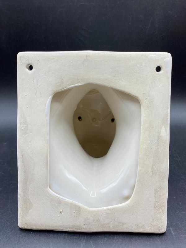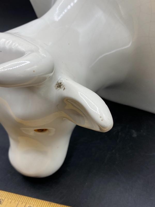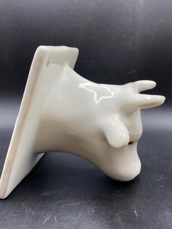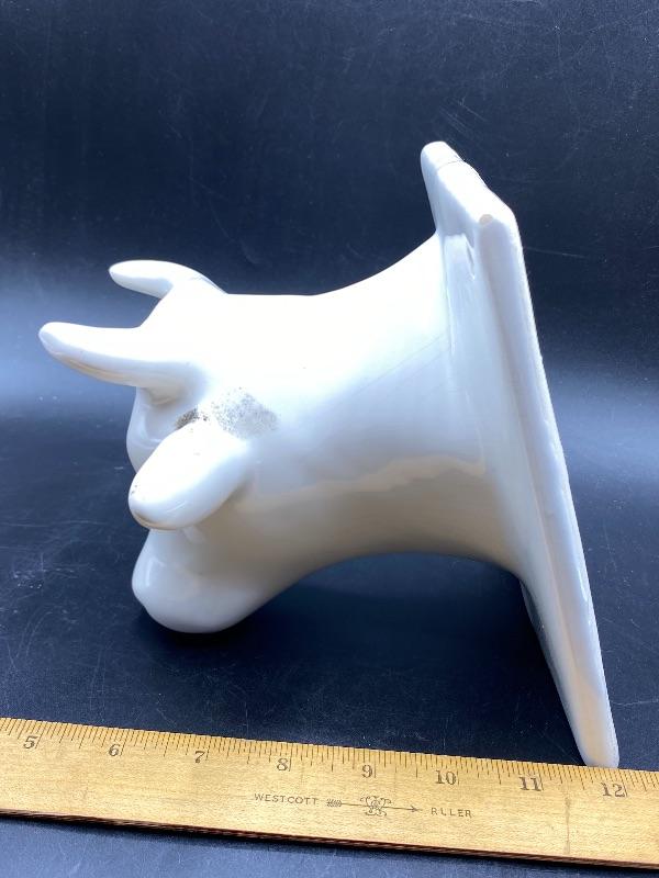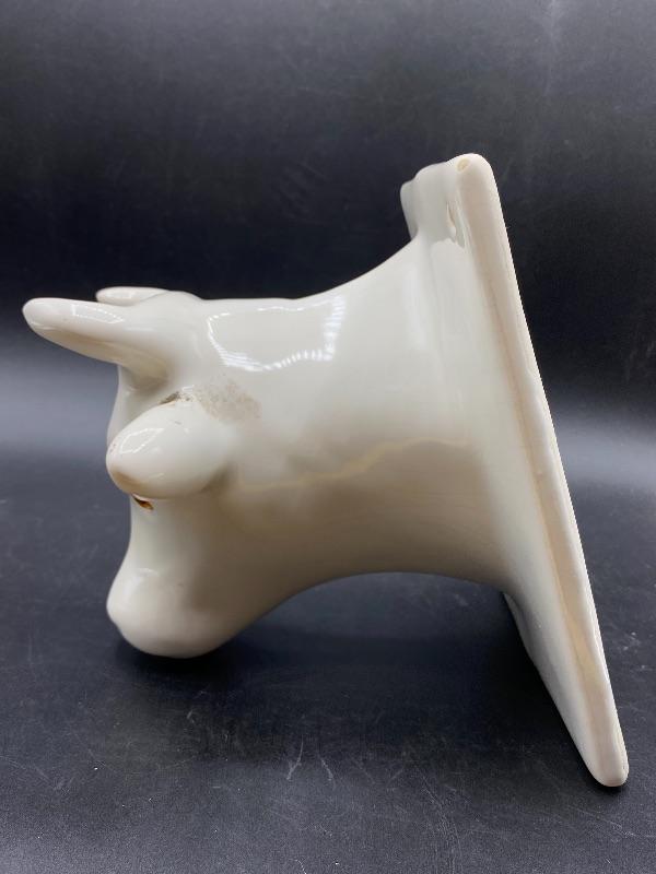 White ceramic cow/ bull wall decor. White finish does have some crazing. Amber orange eyes. About 7" in length. Displays nicely, use as wall decor or as an apron hook.
