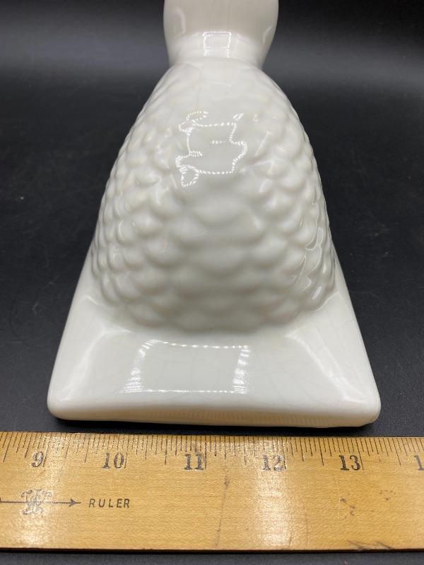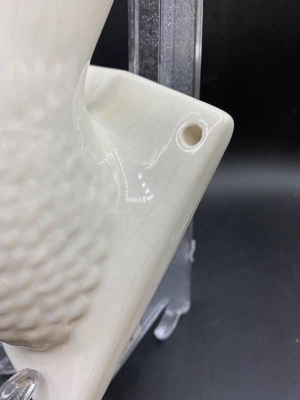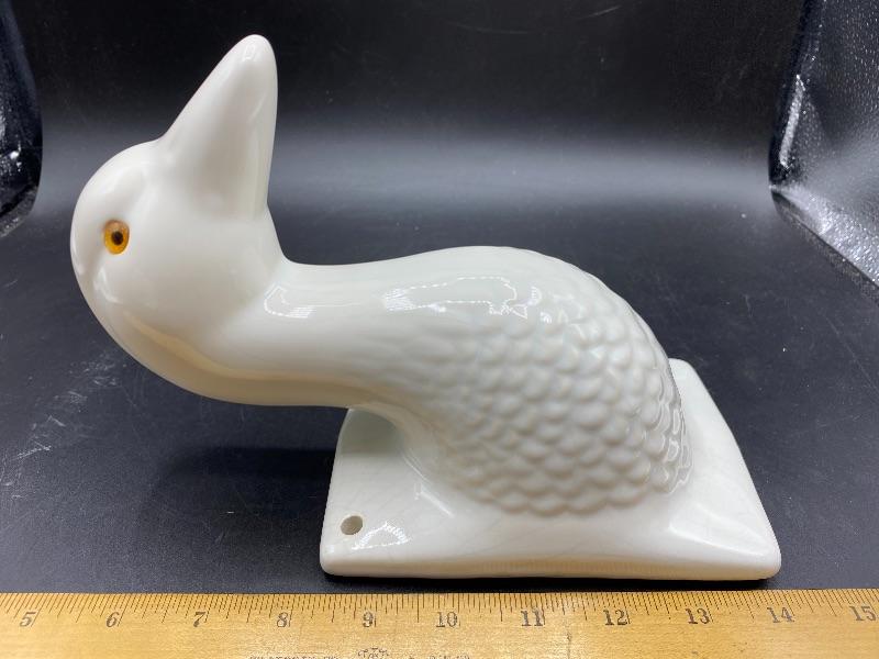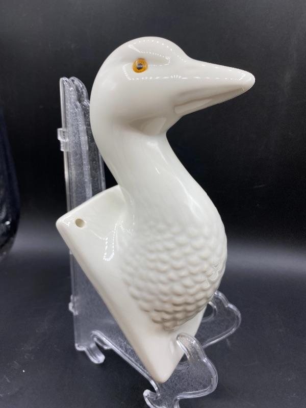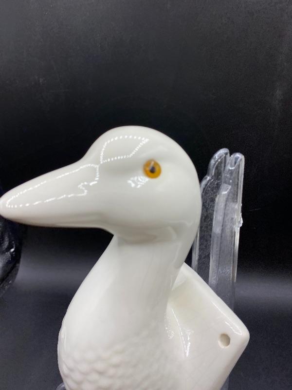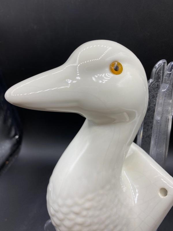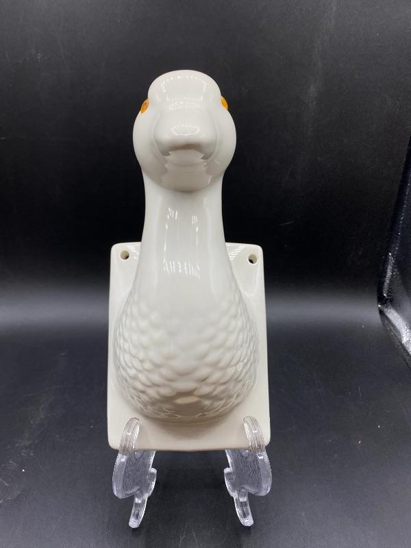 White ceramic duck wall hook apron holder. White finish does have crazing. Amber orange eyes. Great addition to any farmhouse decor. About 9" length.