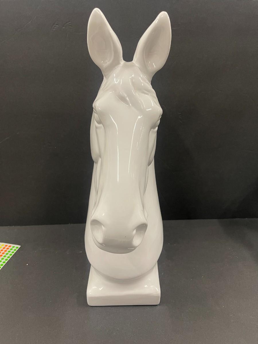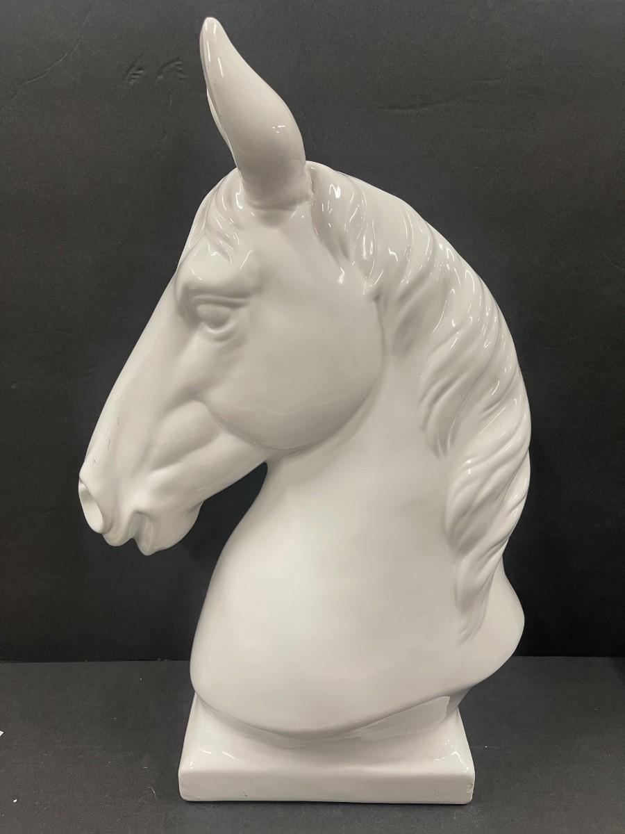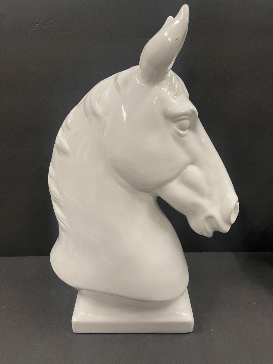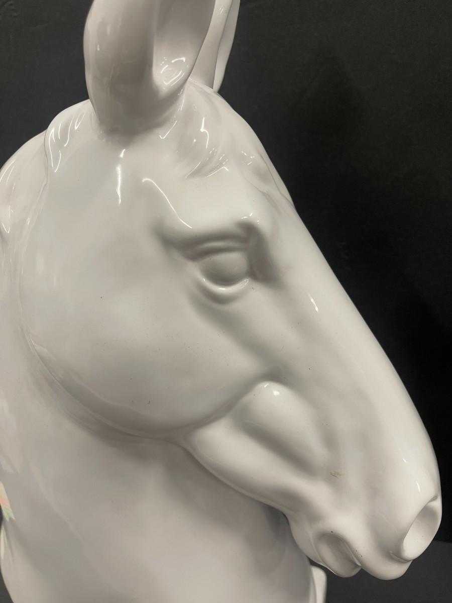 White ceramic horse head figure. Very good condition, no cracks, chips or crazing. 18" high x 11" wide.