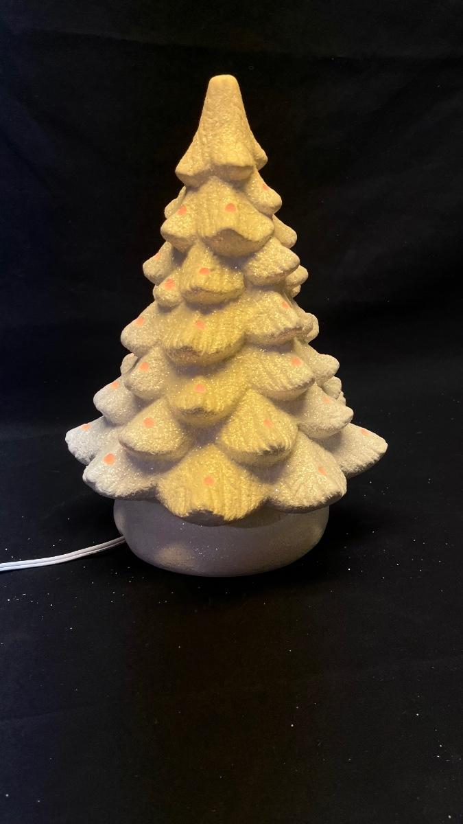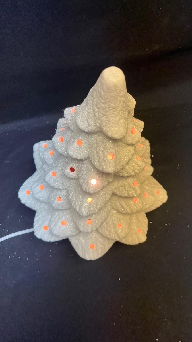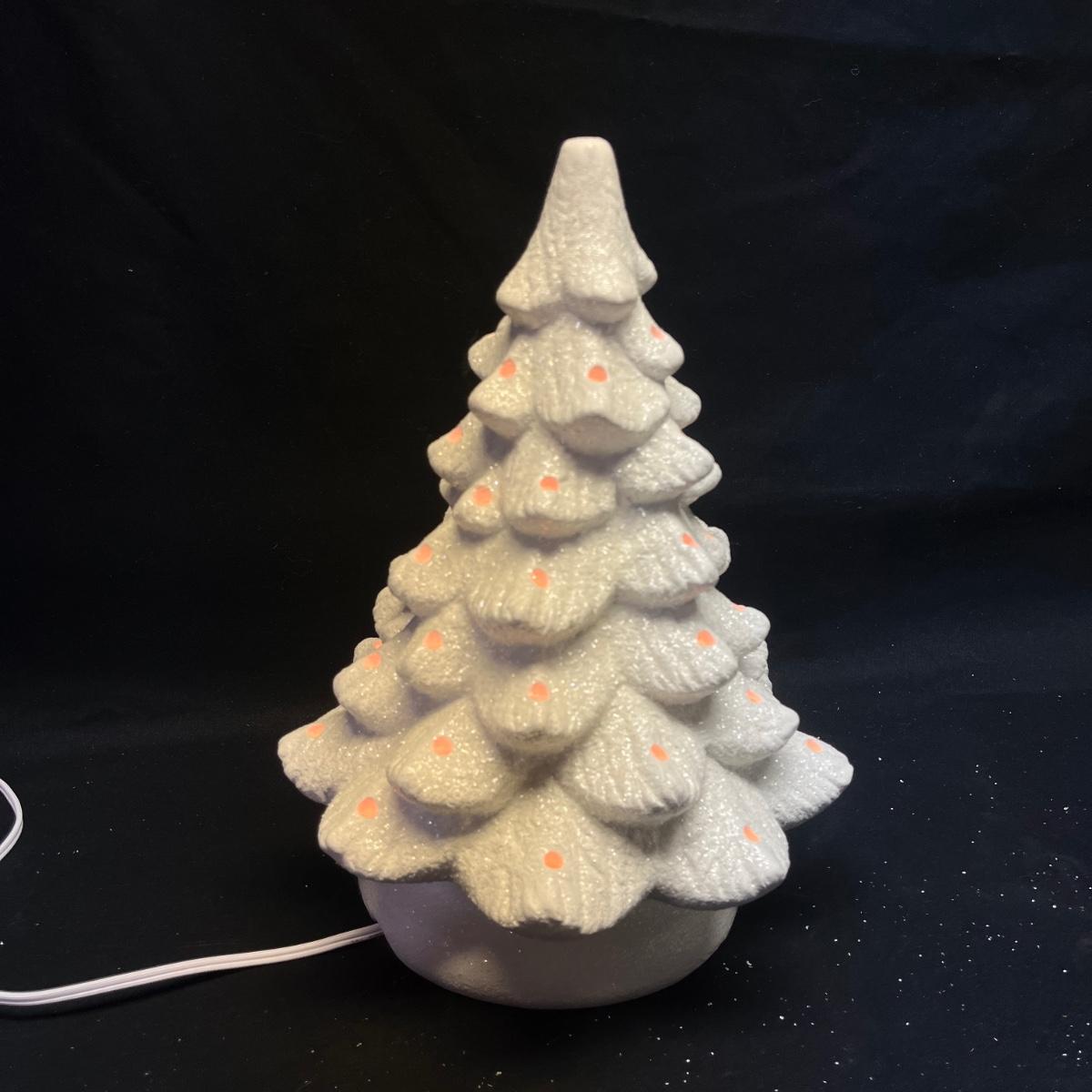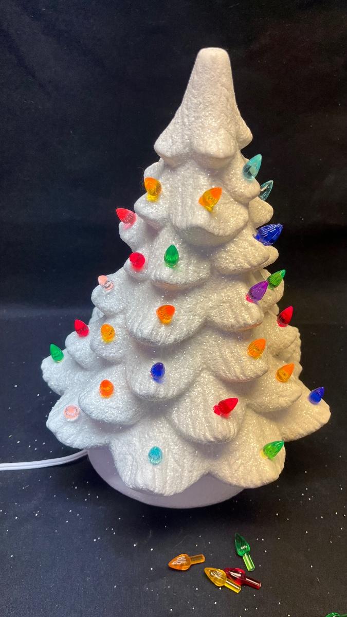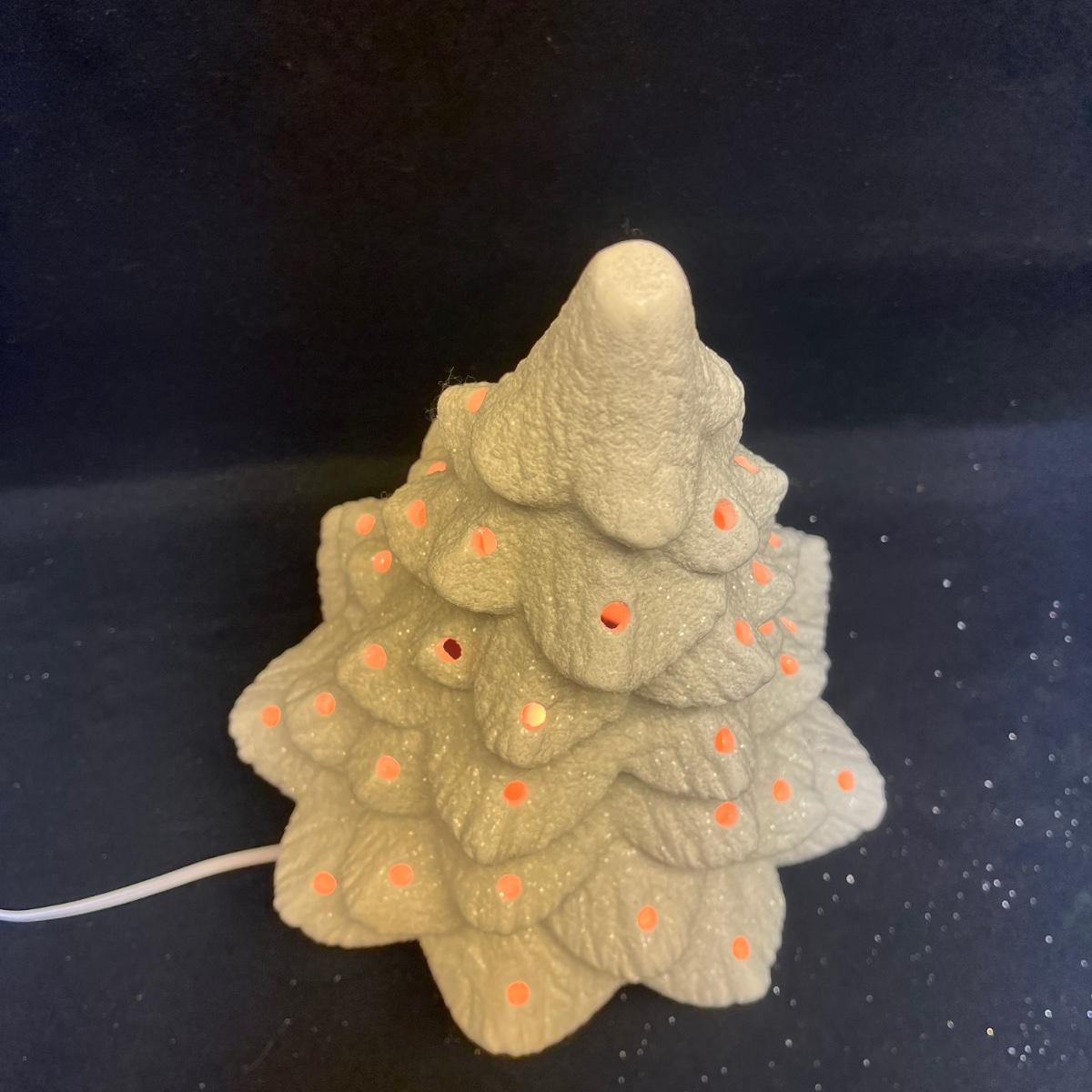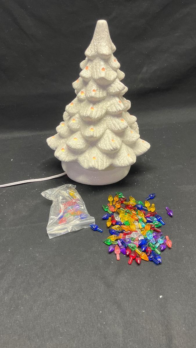 Lot includes a lighted white ceramic Christmas tree with extra plastic colored pieces. Tree powered on when plugged in and has inline on off switch. Tree measures 9"D x 13"H.