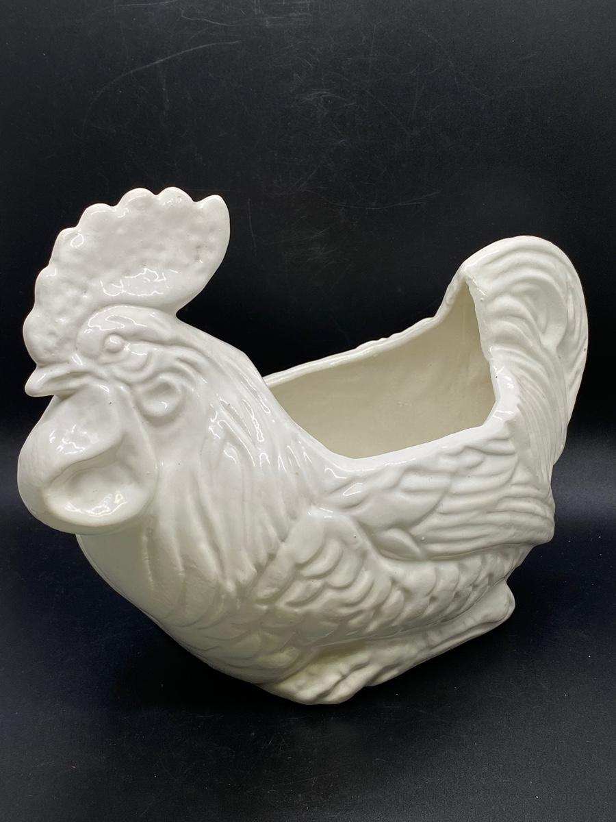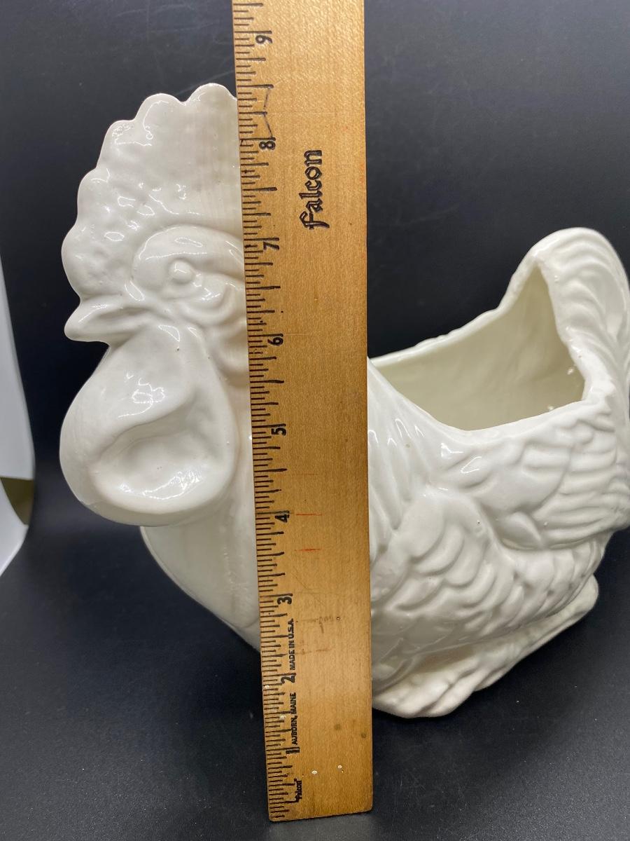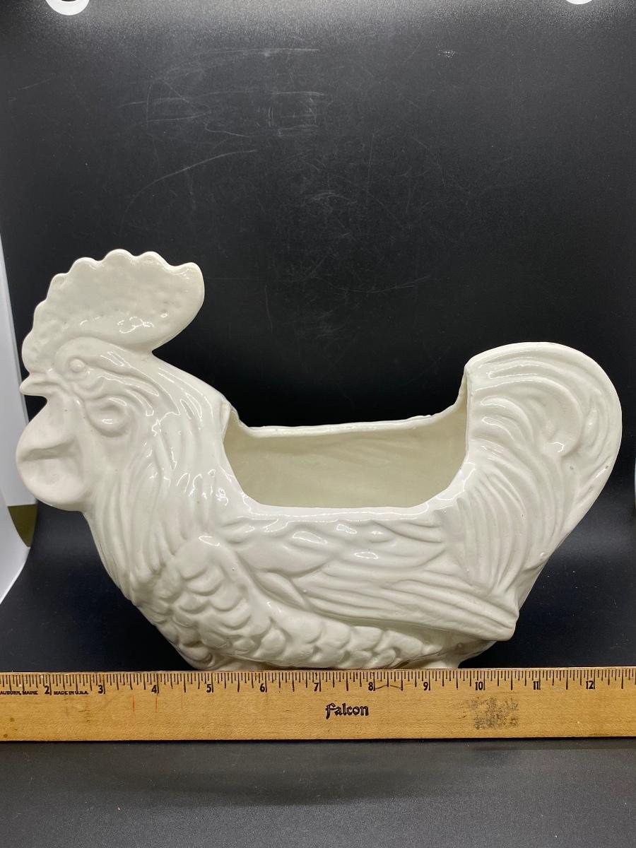 White ceramic rooster planter. Good condition, no chips. About 12" length. No maker marks.