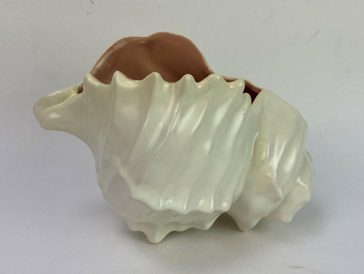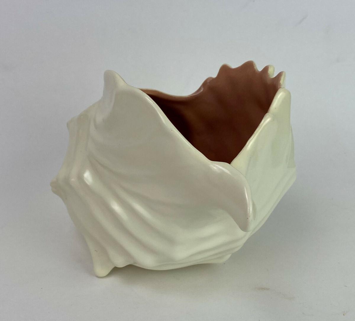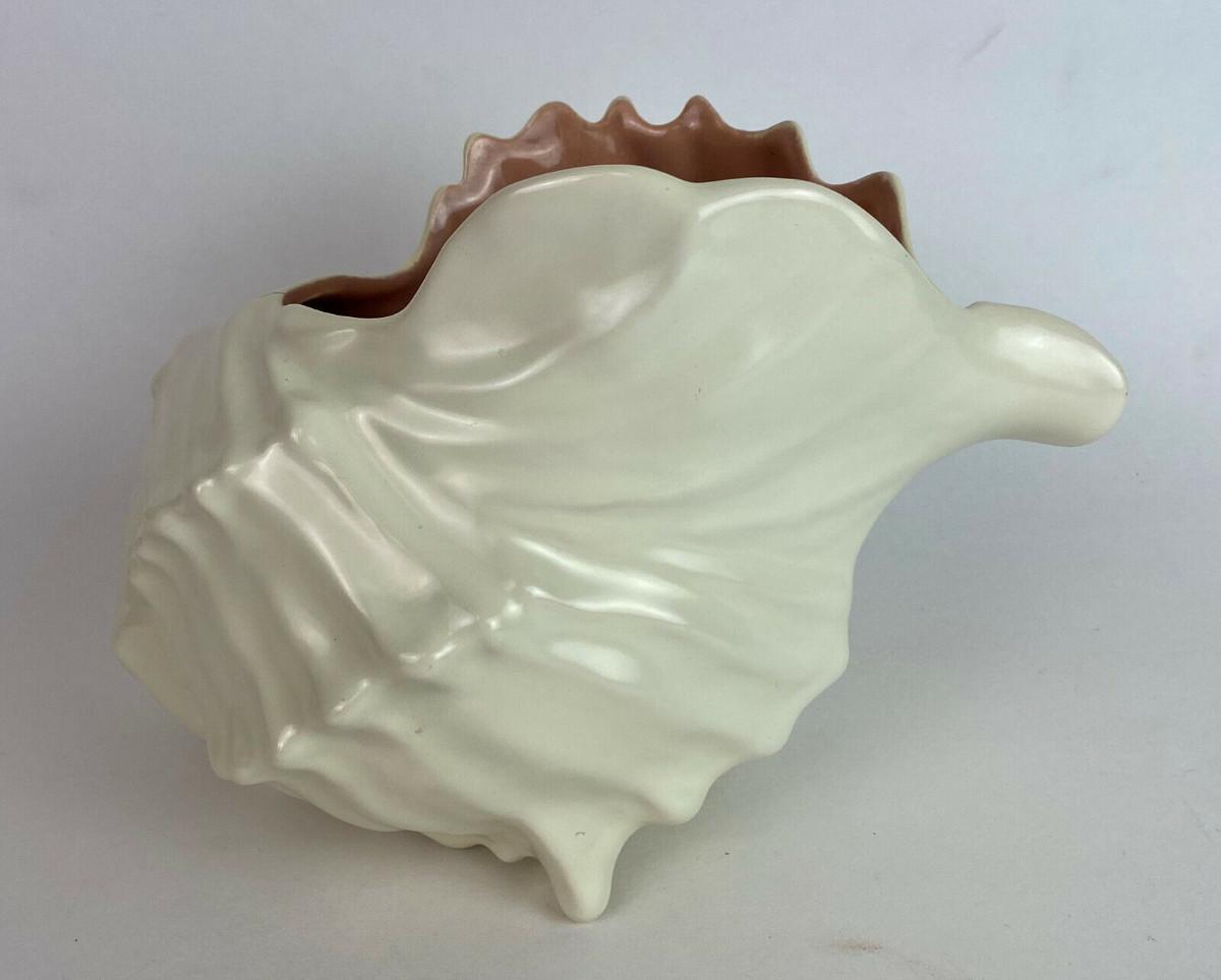 Here is a vintage piece of American made art pottery circa 1940's-50's..Unknown maker? Possibly Haeger? At any rate this naturalistic planter is in the shape of a seashell..Matte white glaze exterior..glazed interior...Measures approx 6" x 8"...No chips or cracks..Good condition.