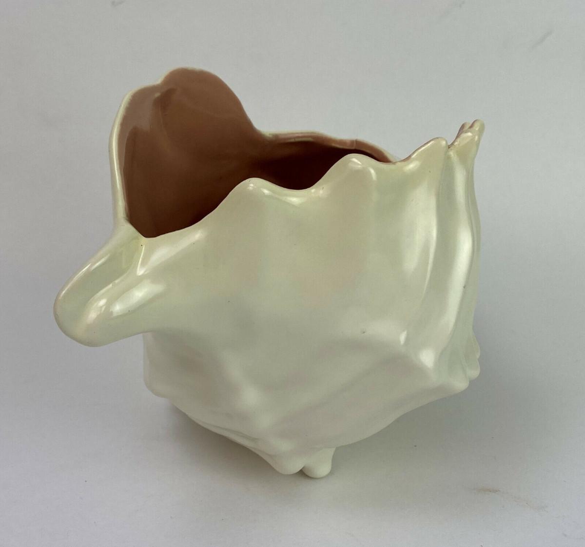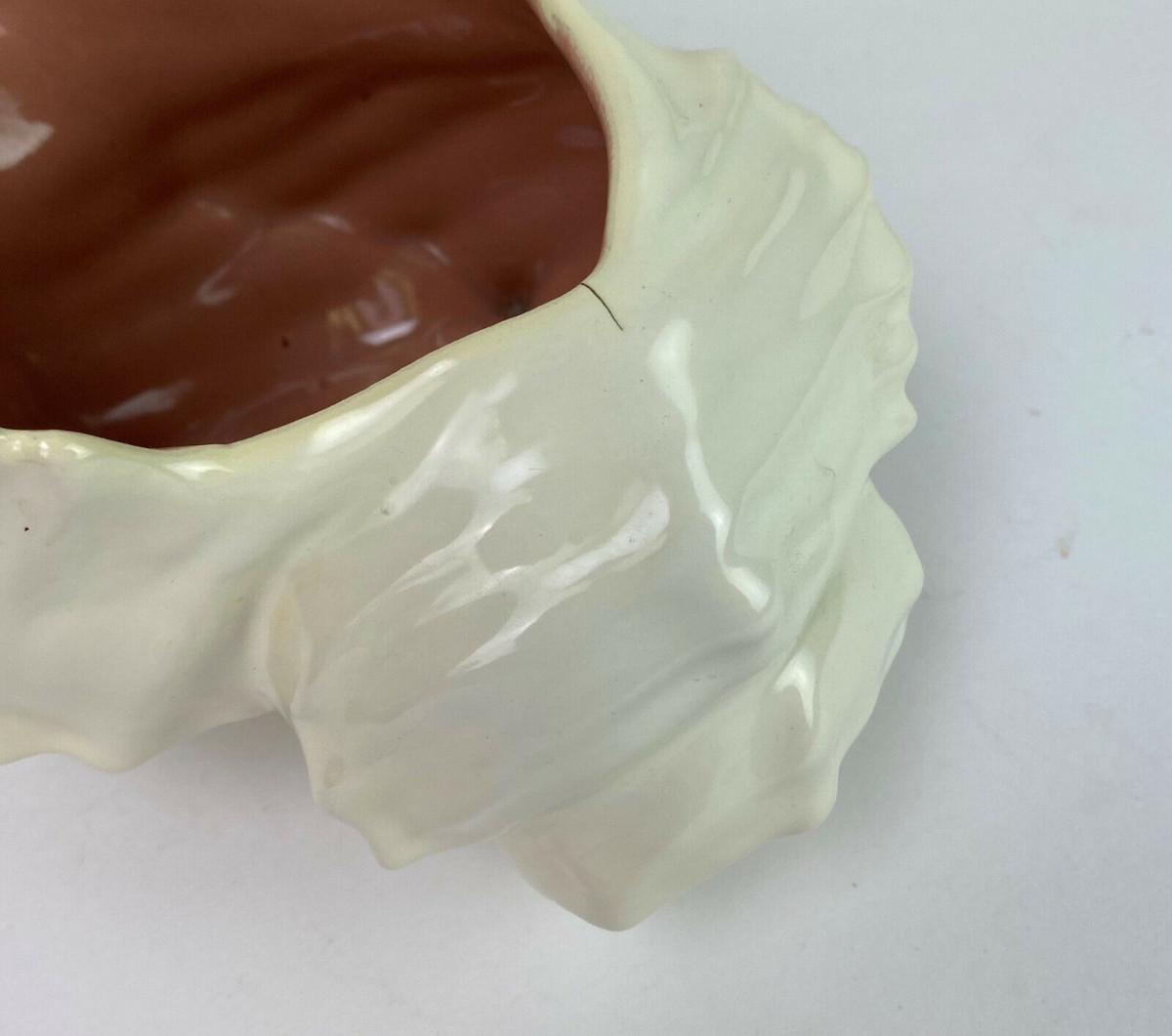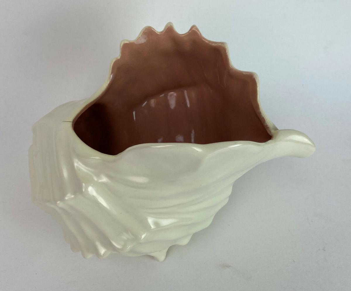 Here is a vintage piece of American made art pottery circa 1940's-50's..Unknown maker? Possibly Haeger? At any rate this naturalistic planter is in the shape of a seashell..Matte white glaze exterior..glazed interior...Measures approx 6" x 8"...No chips or cracks..Good condition.