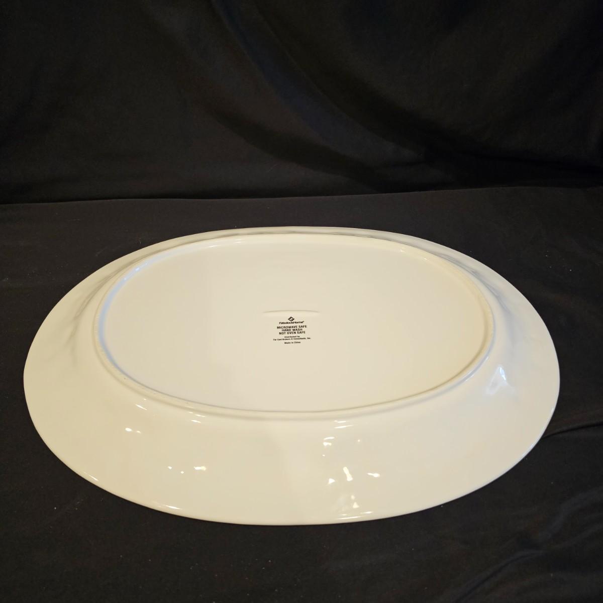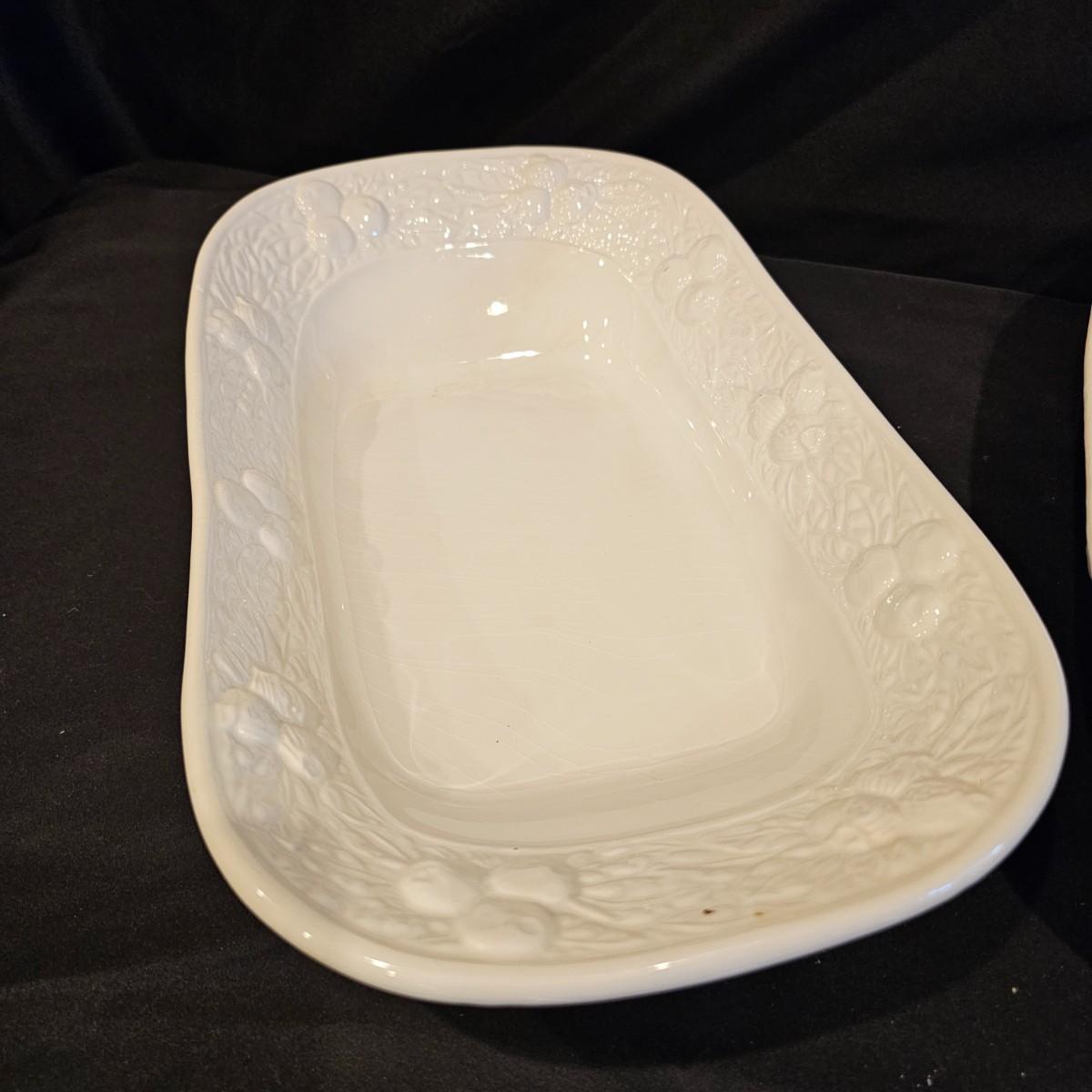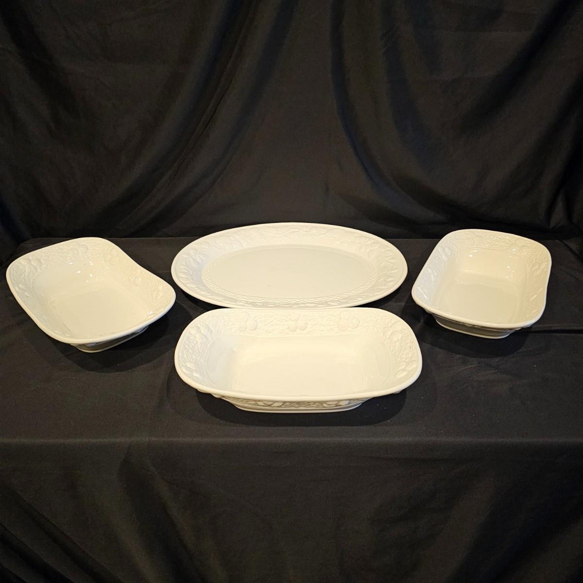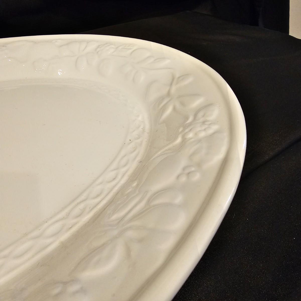 Four lovely white china serving platters. One large meat/turkey platter with decorative pattern. Plate is 18.5" x 14". Three deep oval serving dishes, made in Italy 14" x 8" x 3"H. Some crackle in glaze on inside. See photos for details. Local pickup only.