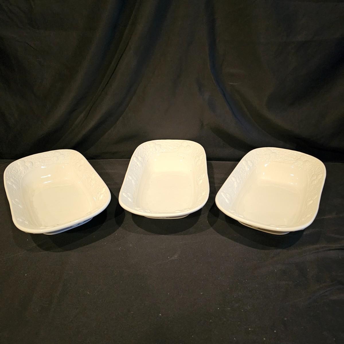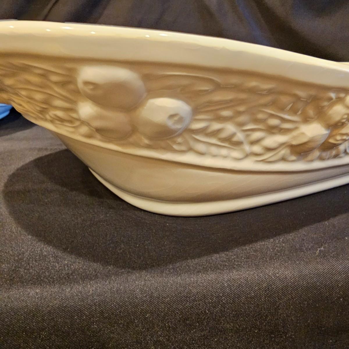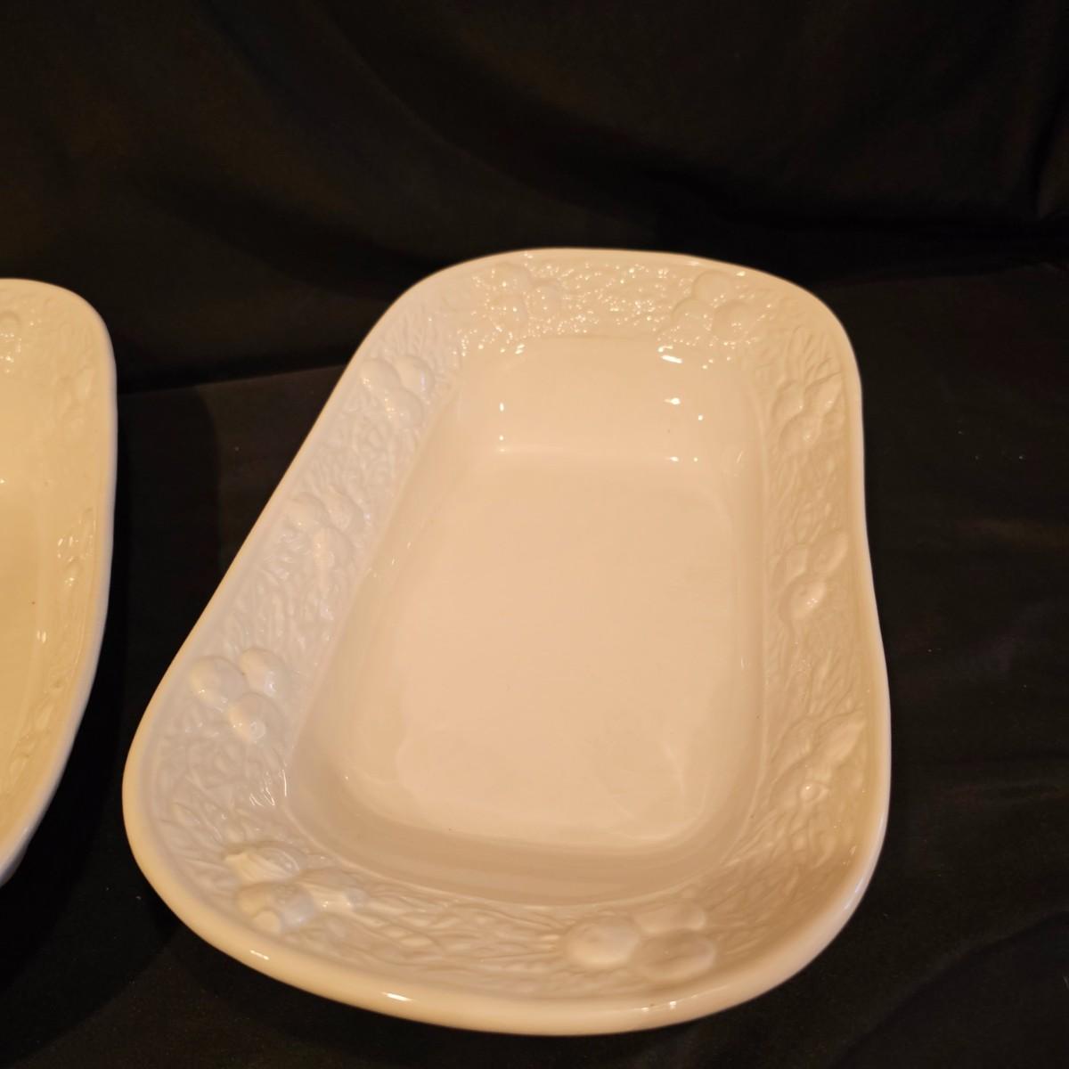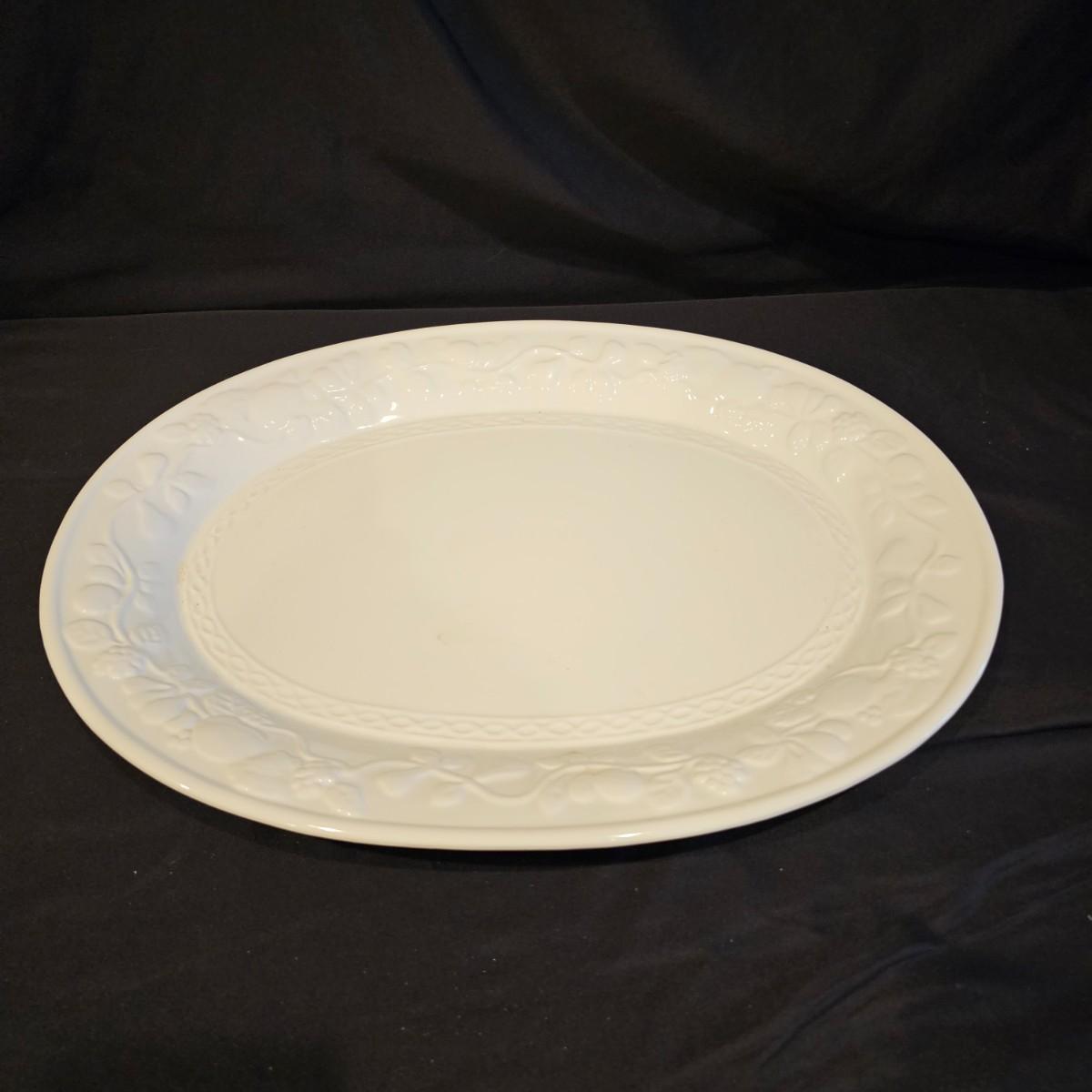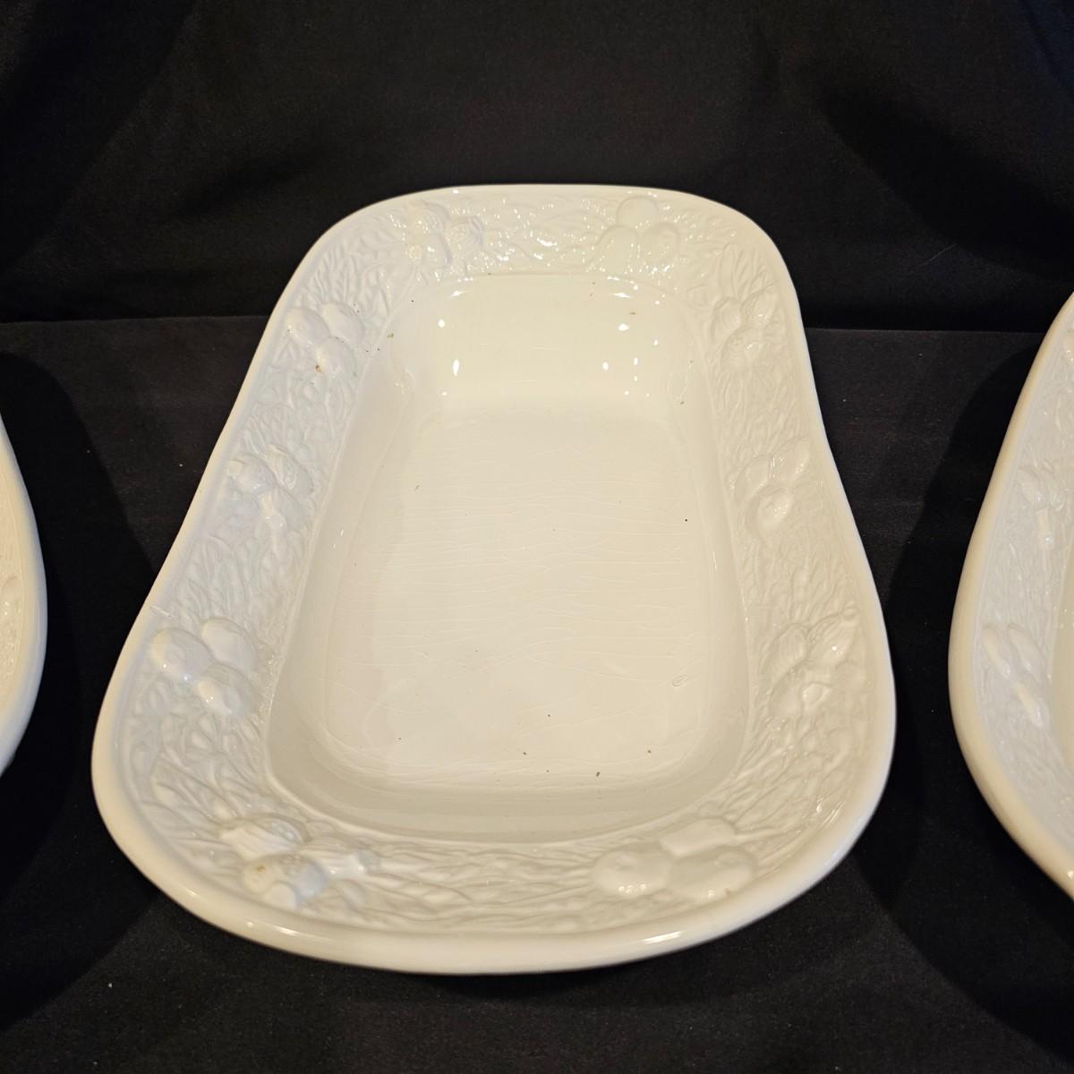 Four lovely white china serving platters. One large meat/turkey platter with decorative pattern. Plate is 18.5" x 14". Three deep oval serving dishes, made in Italy 14" x 8" x 3"H. Some crackle in glaze on inside. See photos for details. Local pickup only.