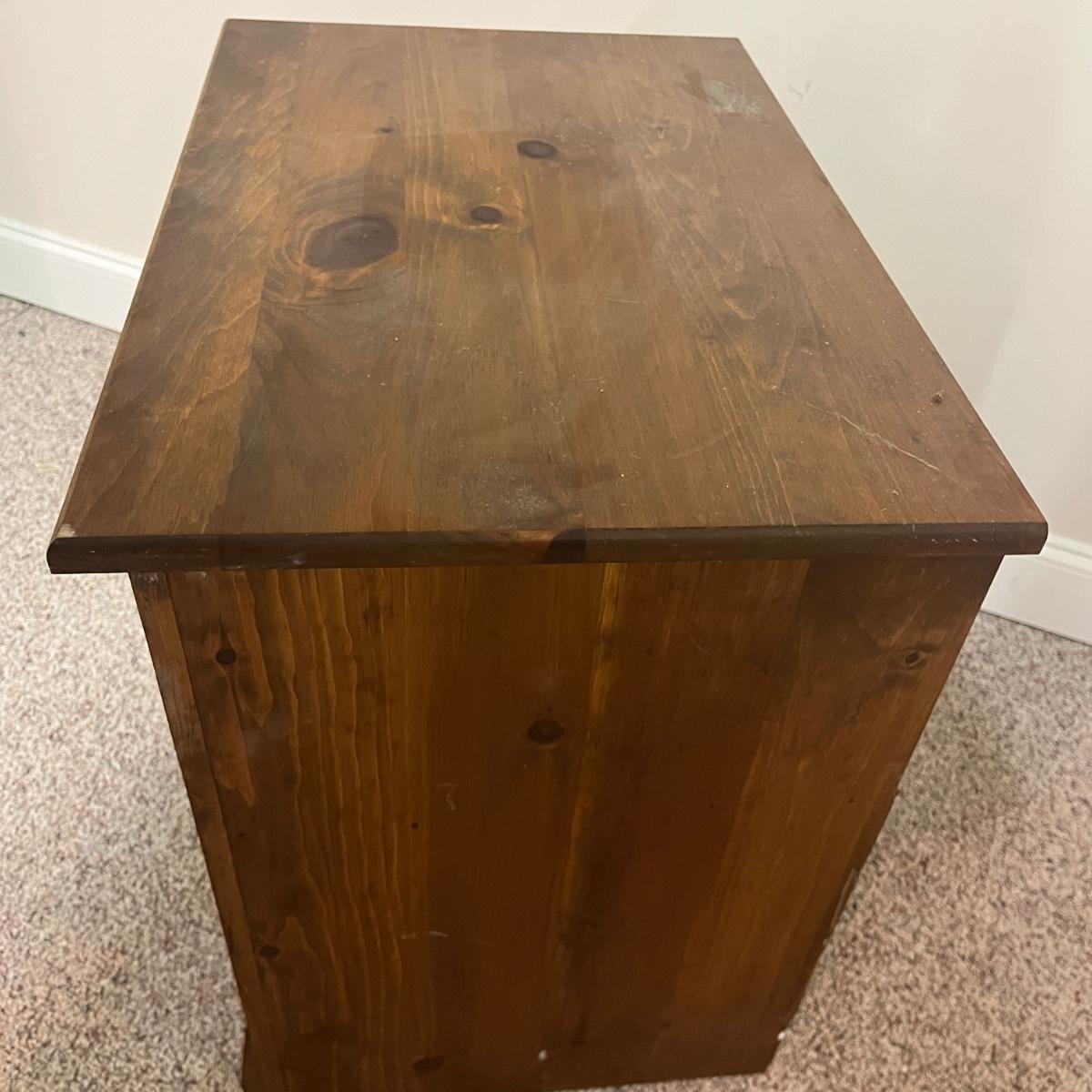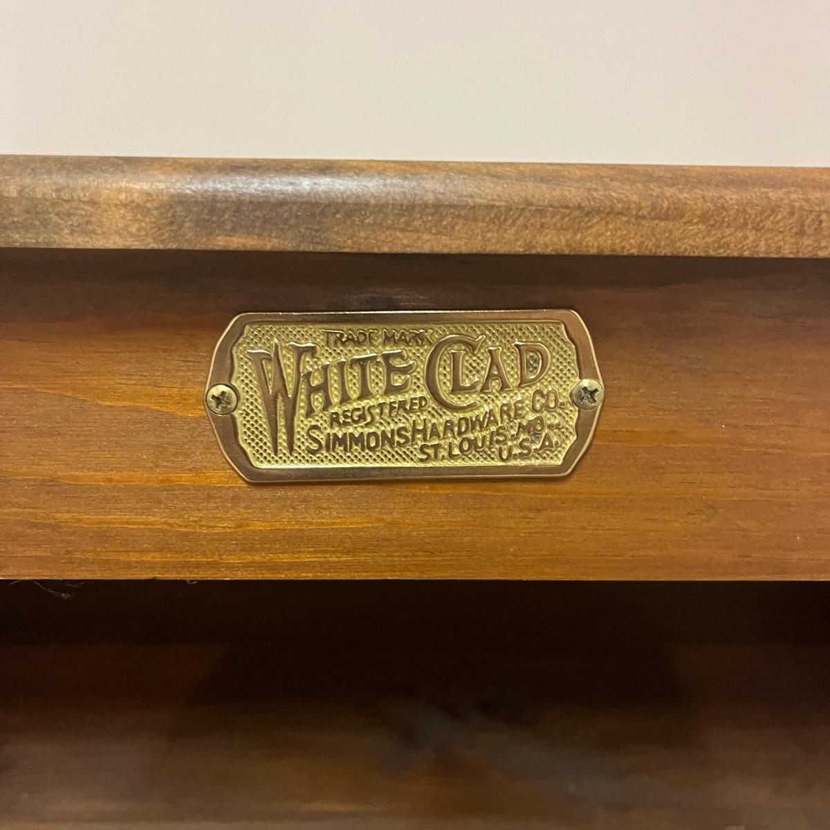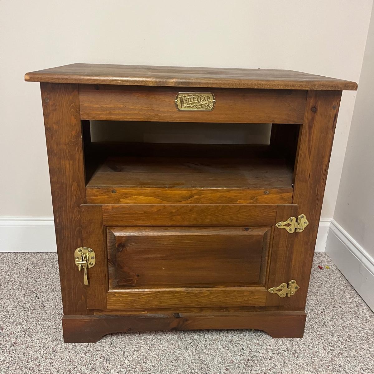 This White clad wooden end table is made to look like an old school icebox and has brass latch and hinges. Table measures 26.5” x 18" x 26.5”H. Table has one chip on corner and top has discoloration, see pictures.
