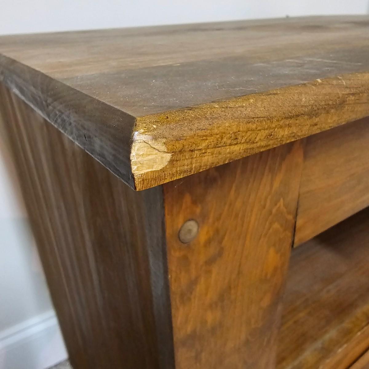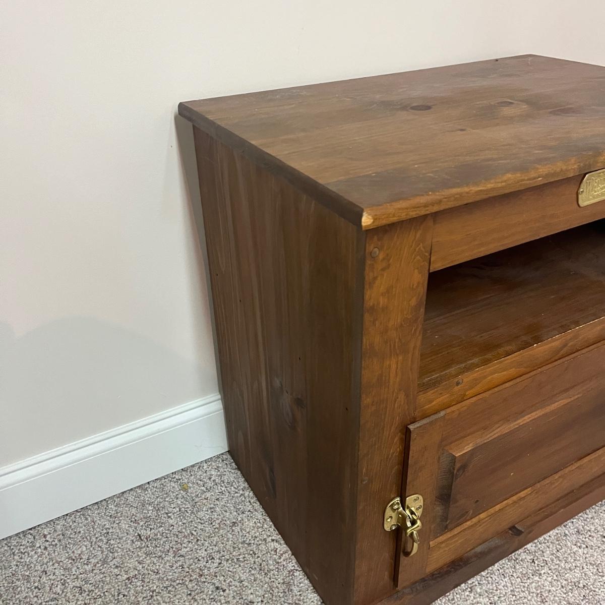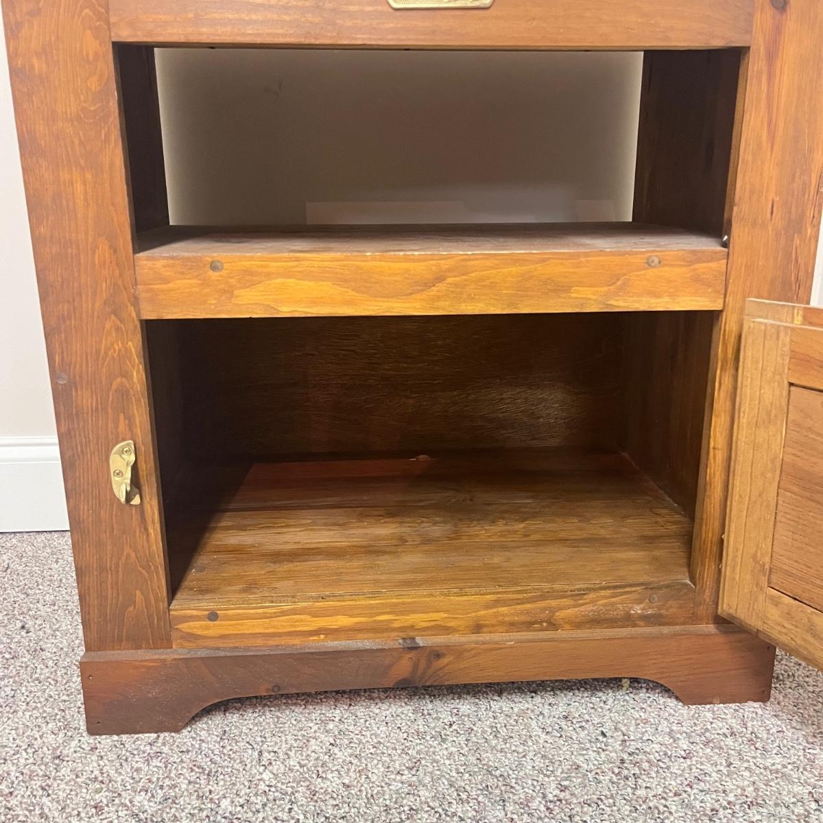 This White clad wooden end table is made to look like an old school icebox and has brass latch and hinges. Table measures 26.5” x 18" x 26.5”H. Table has one chip on corner and top has discoloration, see pictures.