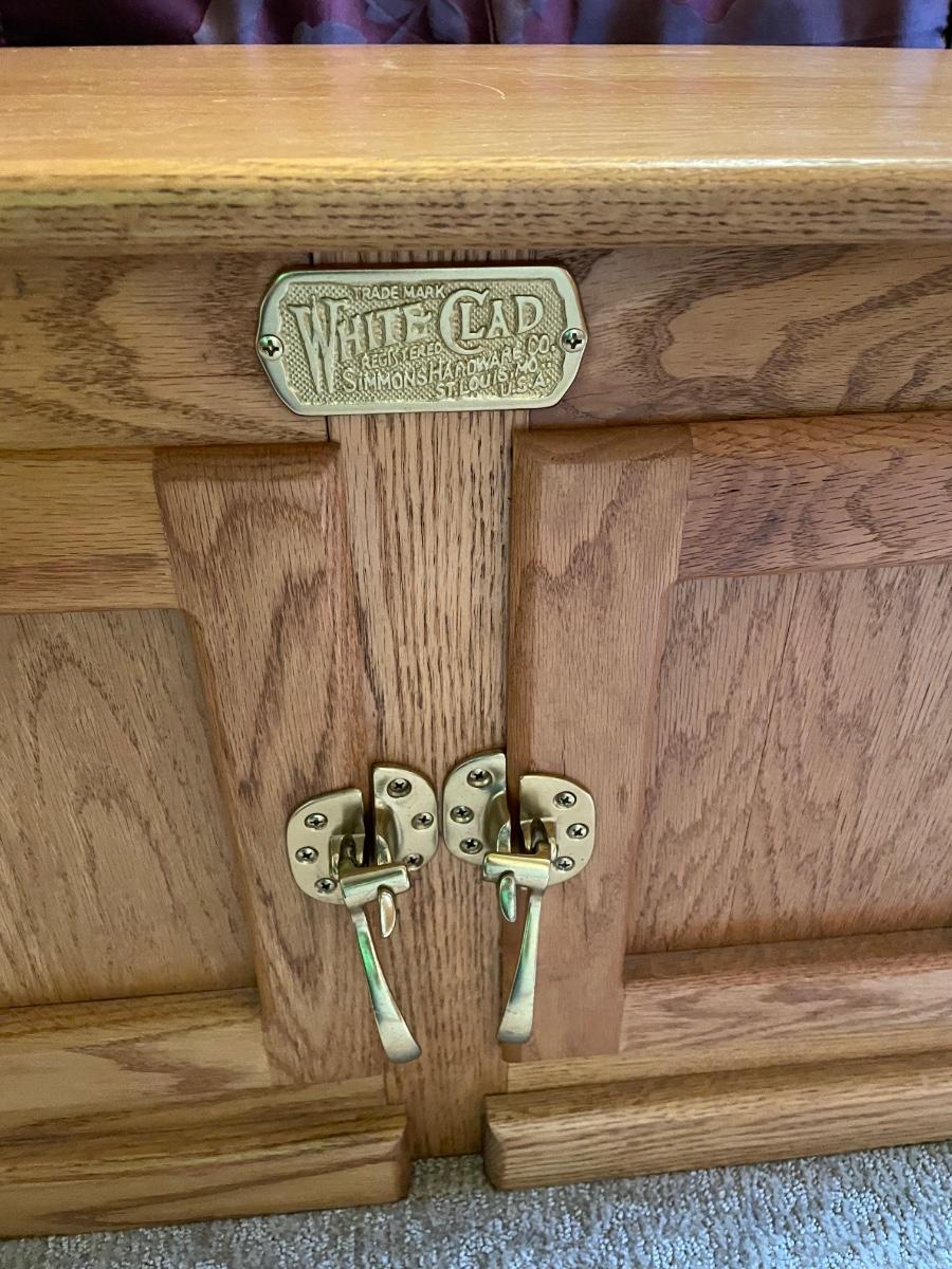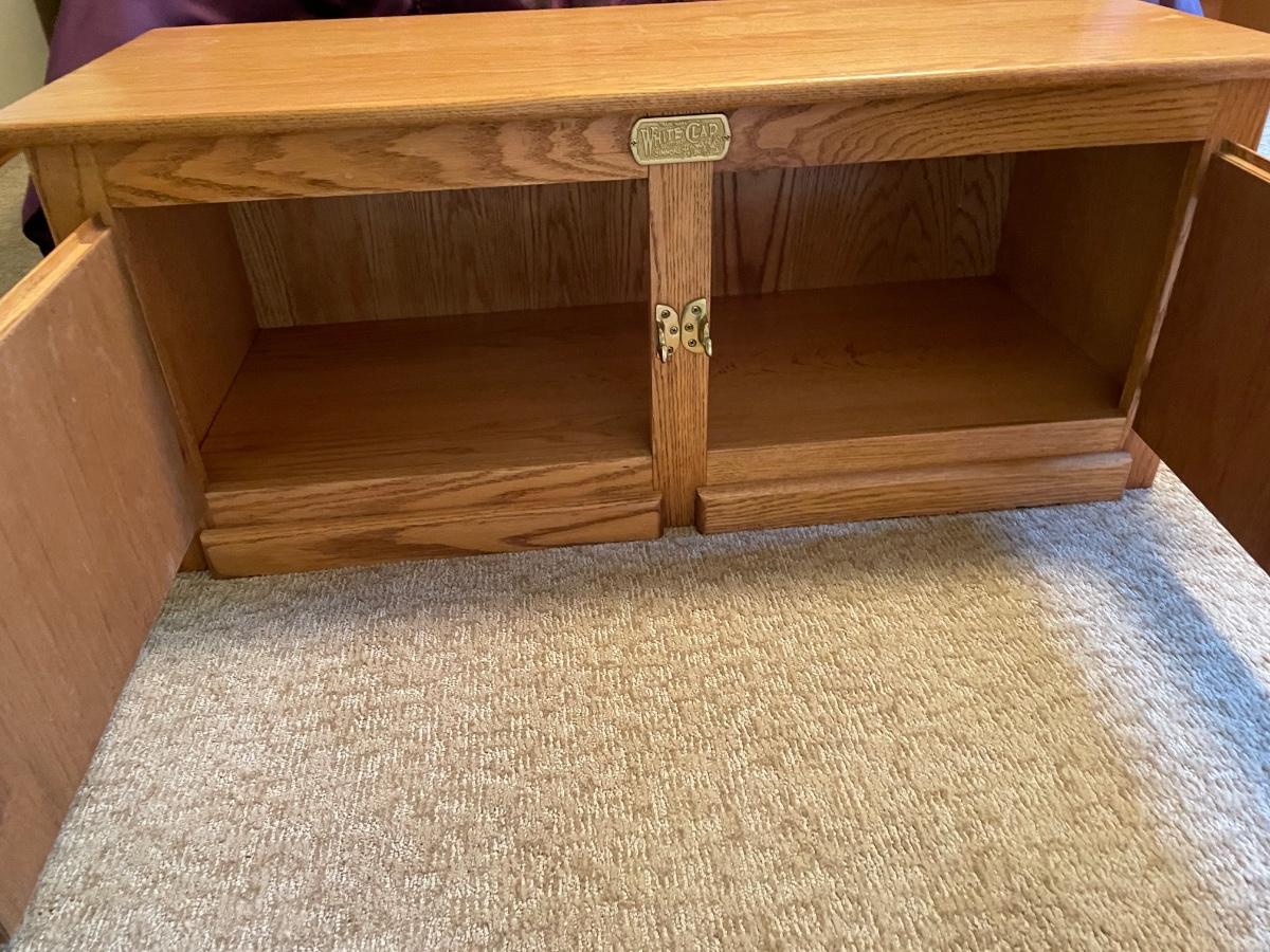 White Clad wooden storage cabinet. Dimensions 44”x18”x19”