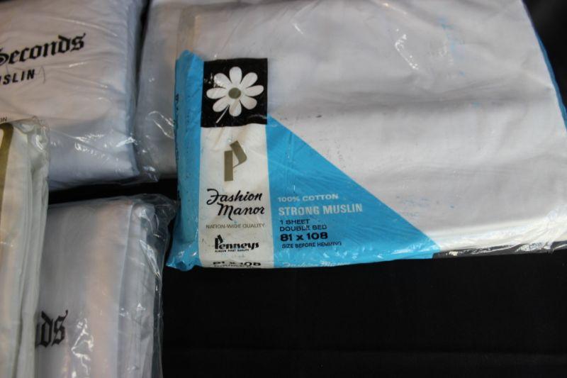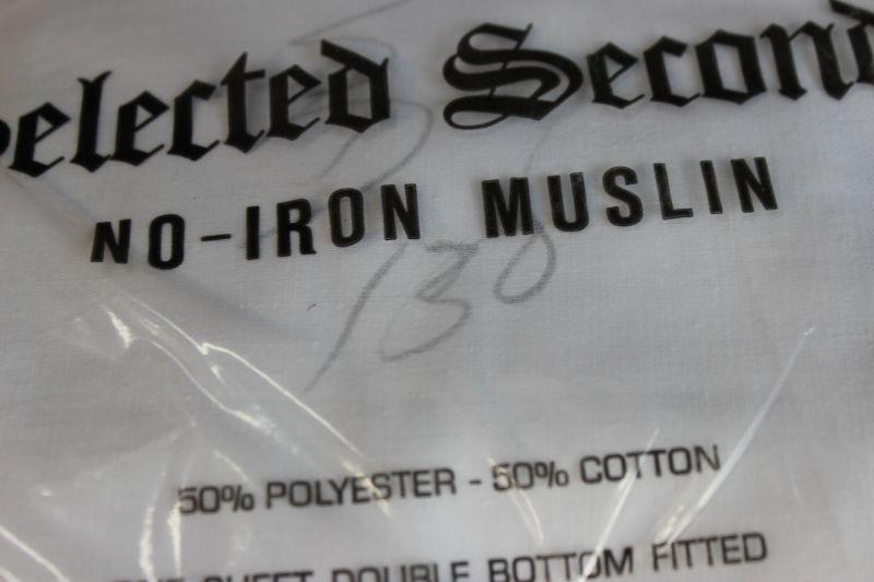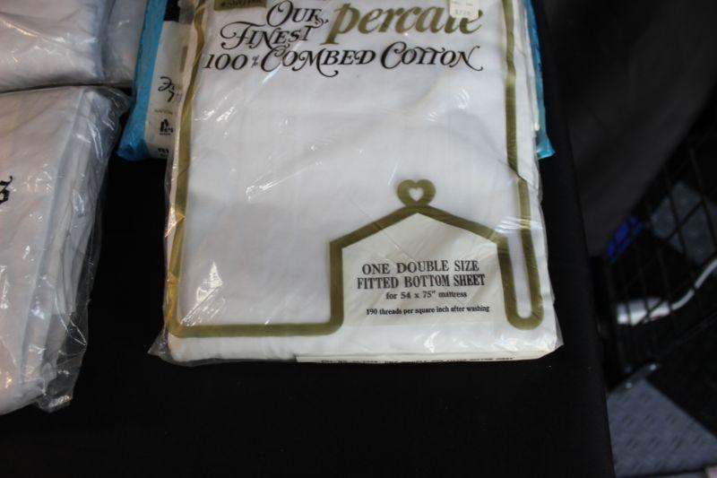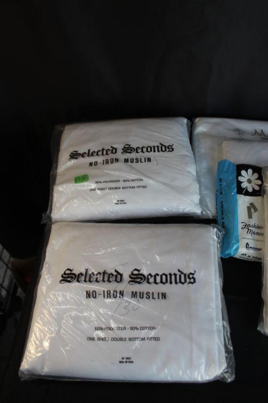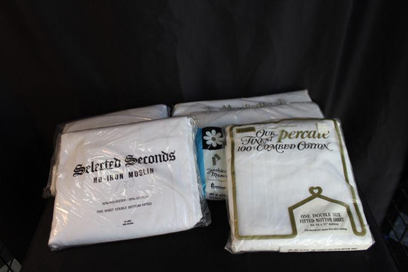 5 packages of white sheets. Three are new in package. The selected seconds are repackaged and have been written on prior to repackage. Unsure if writing will come out, would think it would. made for a double/ full size bed.