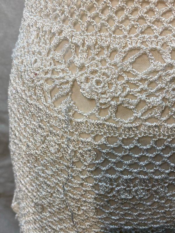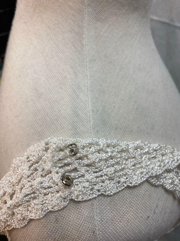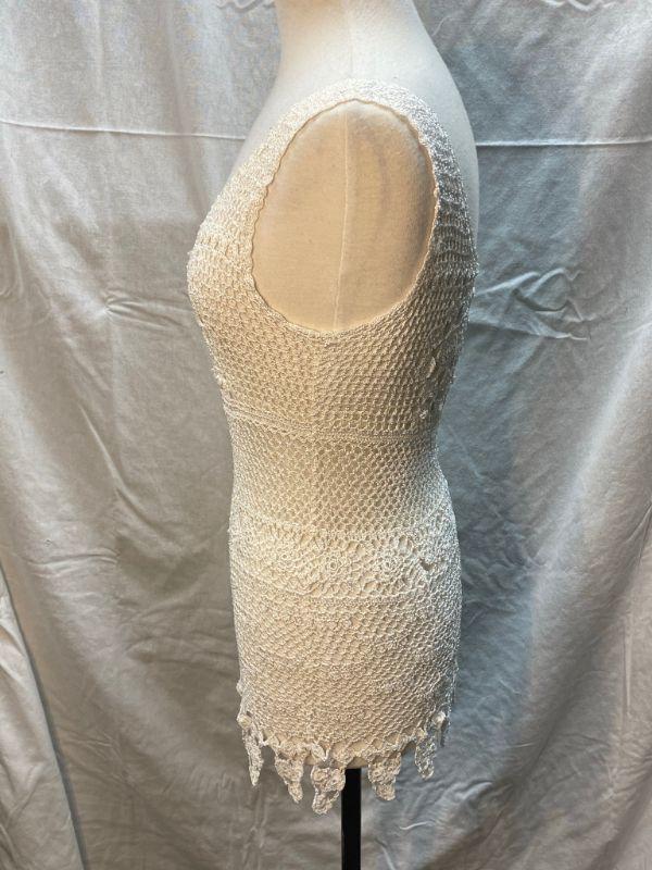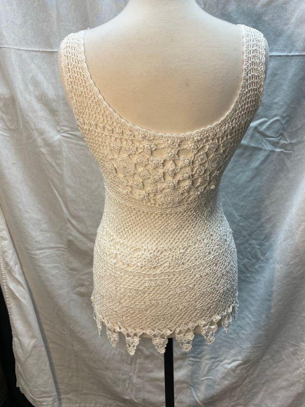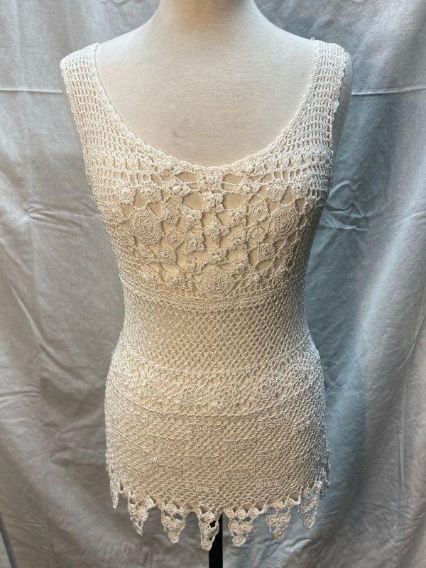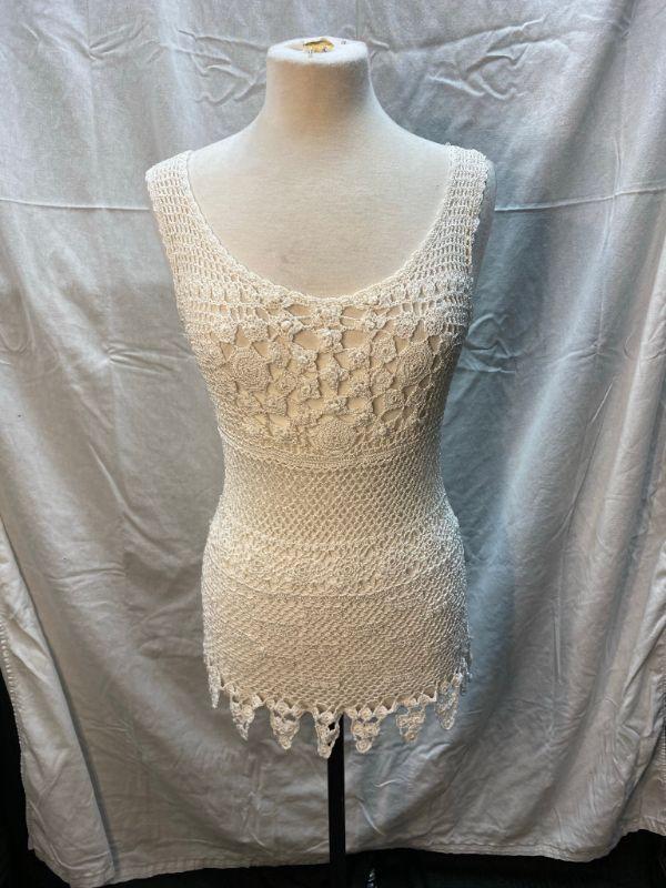 White crochet tank. Has small snaps at the shoulder on the inside, probably had a spaghetti tank underneath at one time. No tags. Unsure of exact size, probably closer to a large, maybe medium by the way it fits the mannequin. There is a loose thread hole, can be stitched/pulled closed to make it unnoticeable. No spots.