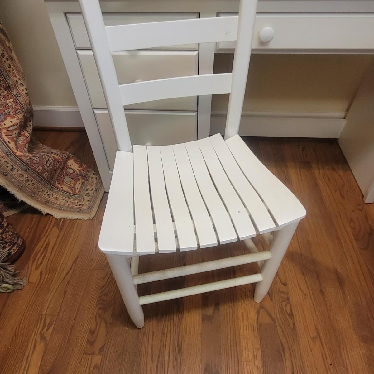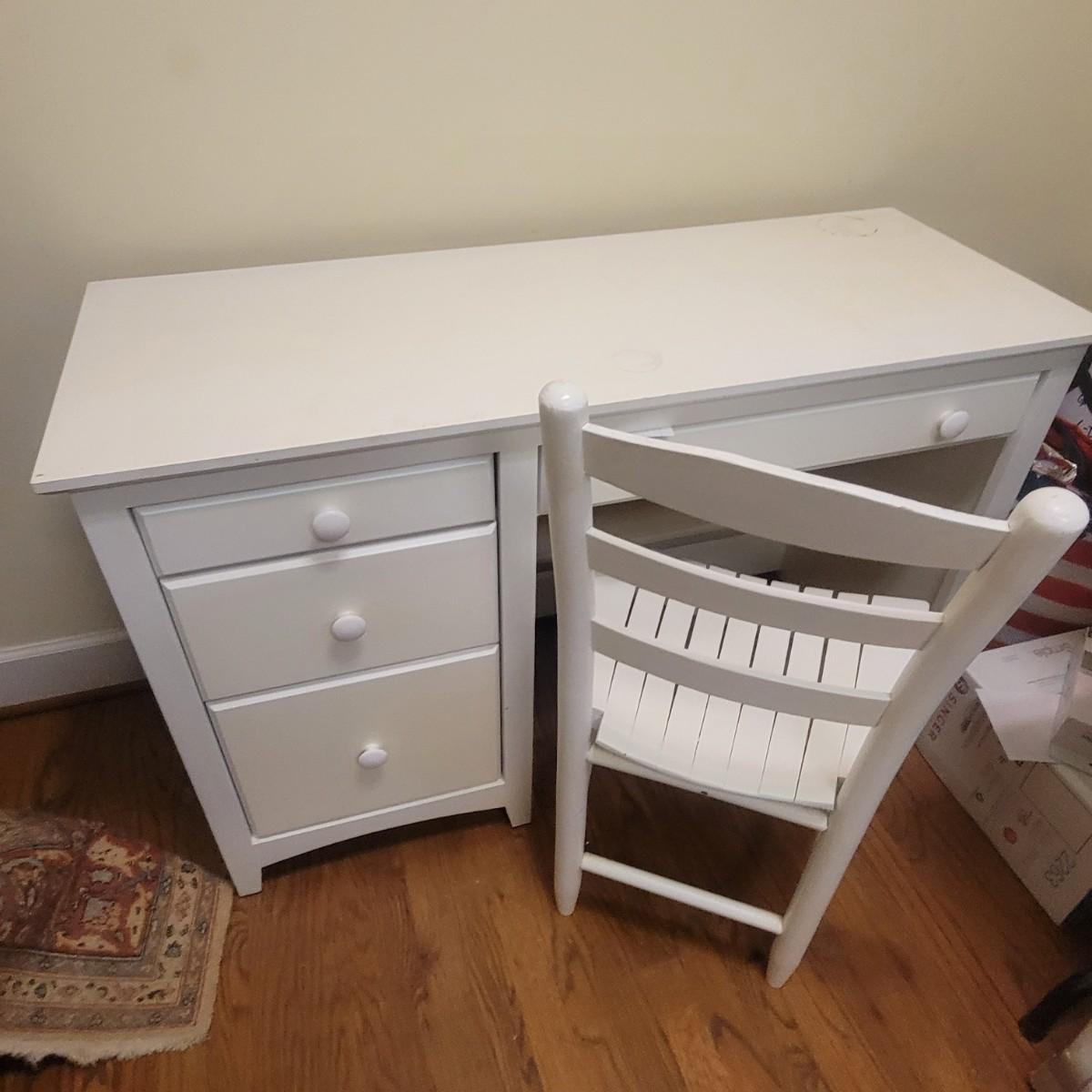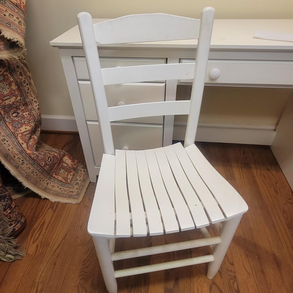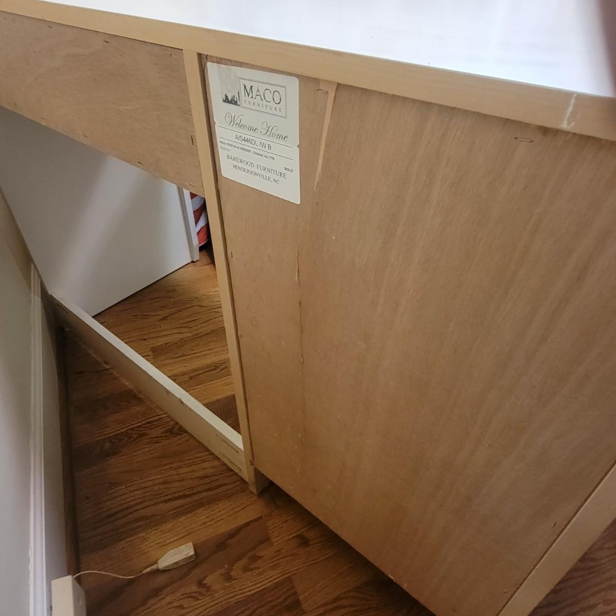 White desk with 4 drawers. Appears to be solid wood except for backing. Desk top does show some blemishes, see pictures. Manufactured by Maco Furniture. Measures approximately 46.5" x 18" x30". Chair is approximately 17" x 15" x 35". Seat height is 17". Local pickup only