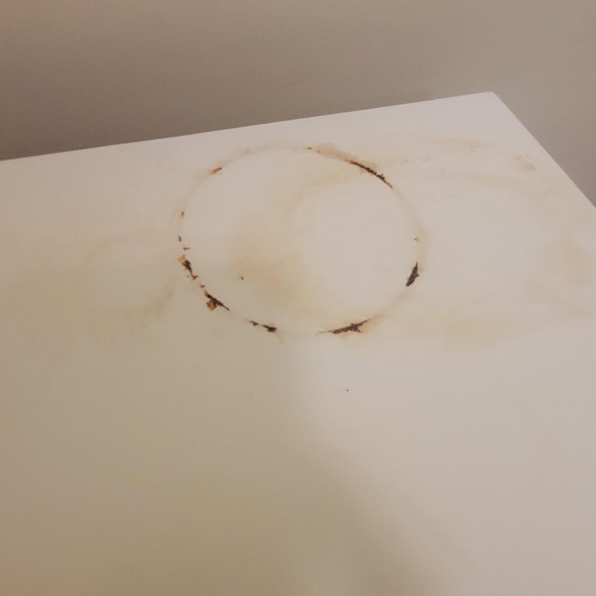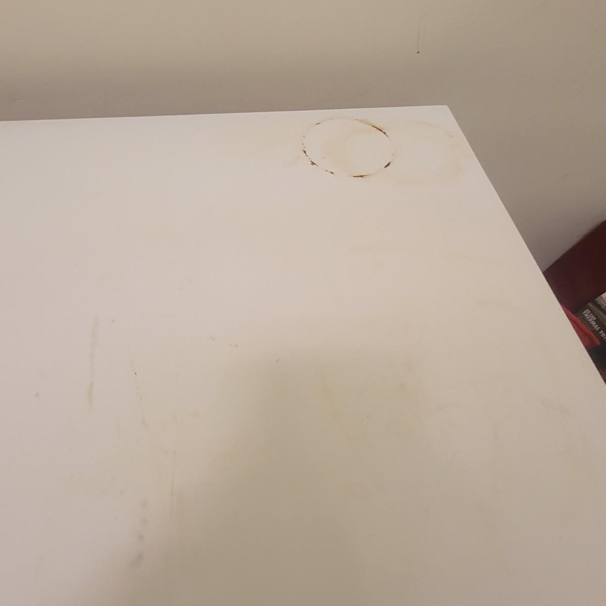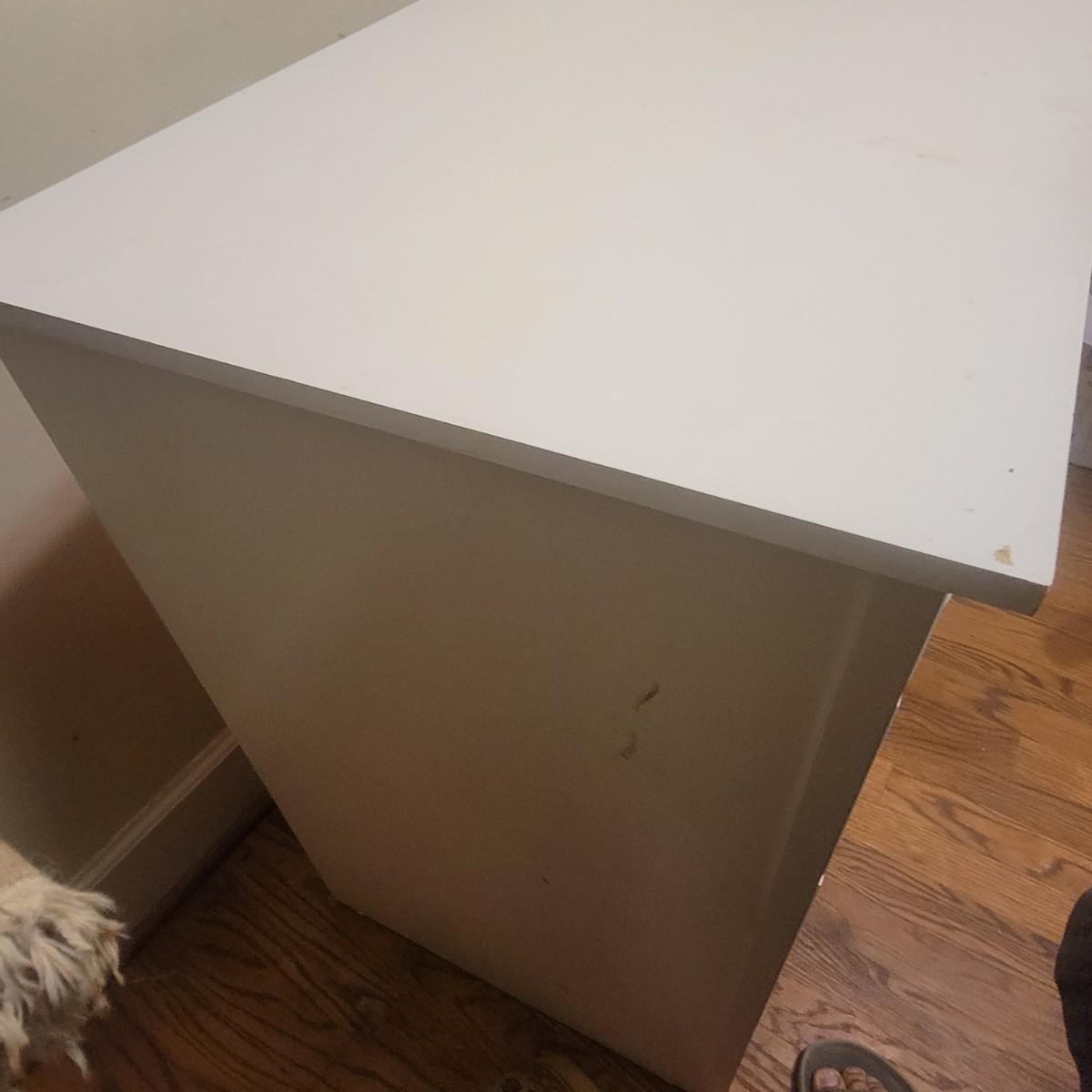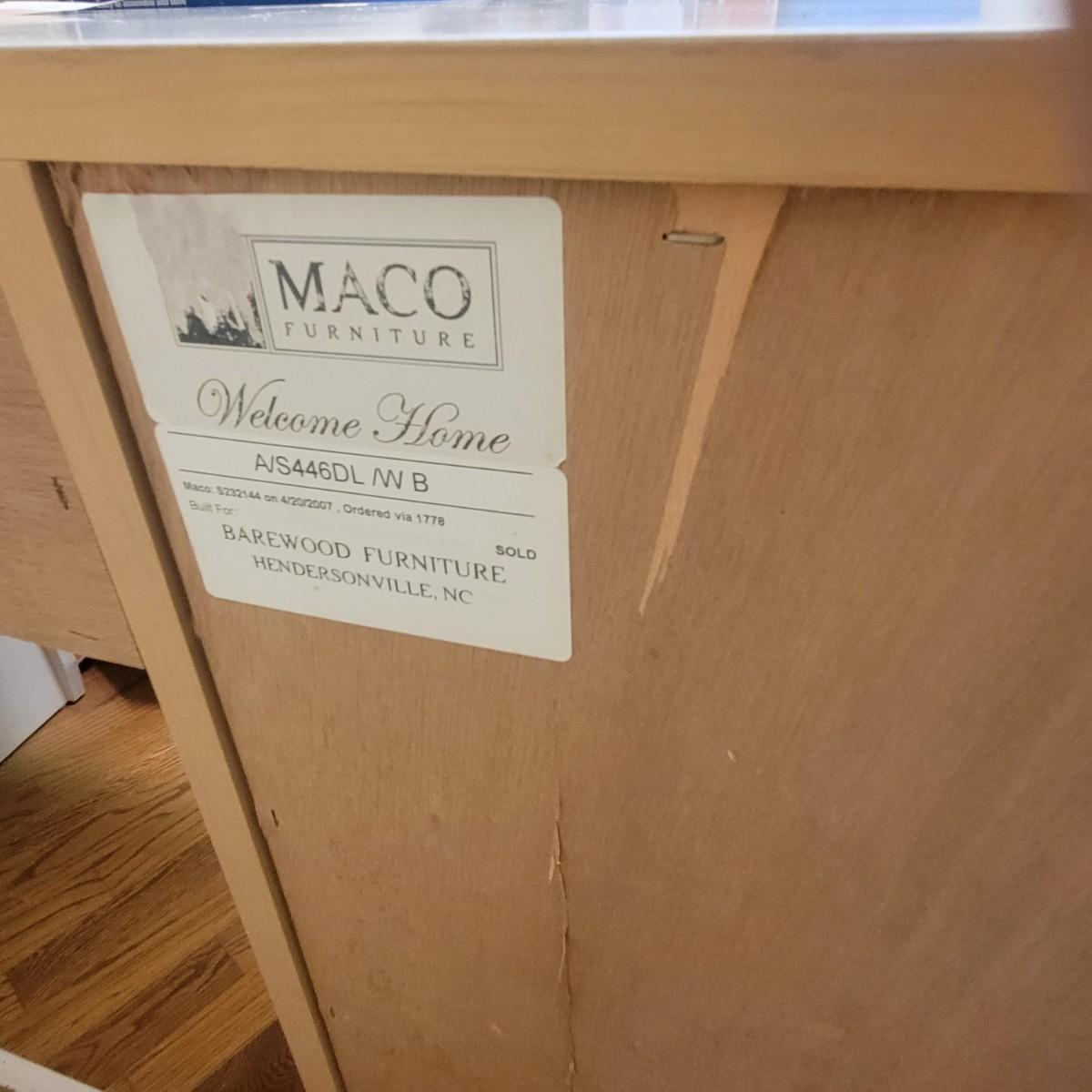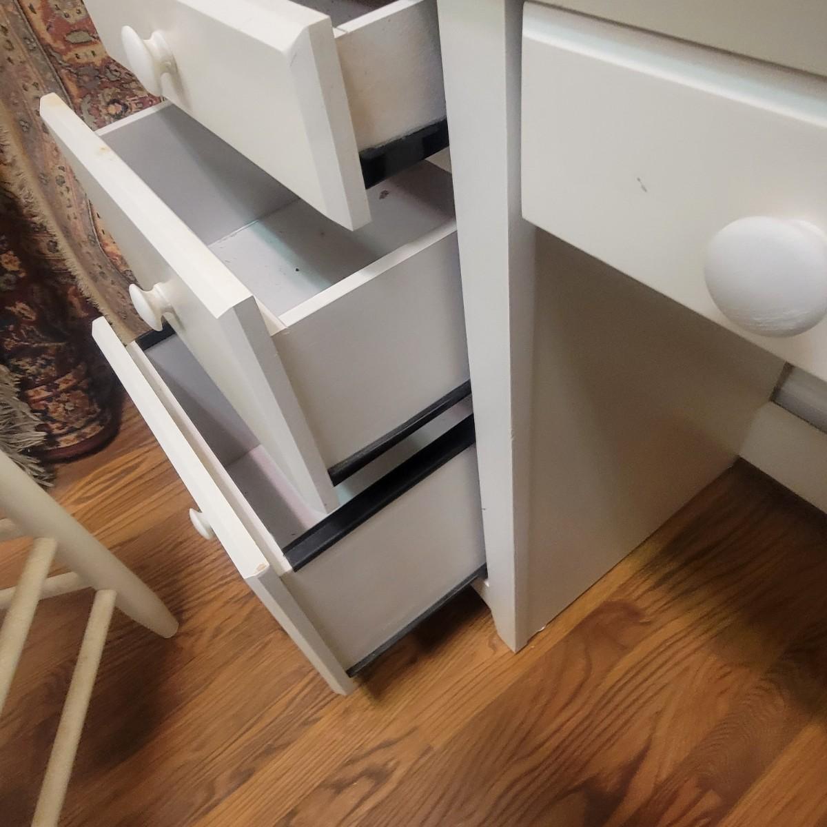 White desk with 4 drawers. Appears to be solid wood except for backing. Desk top does show some blemishes, see pictures. Manufactured by Maco Furniture. Measures approximately 46.5" x 18" x30". Chair is approximately 17" x 15" x 35". Seat height is 17". Local pickup only