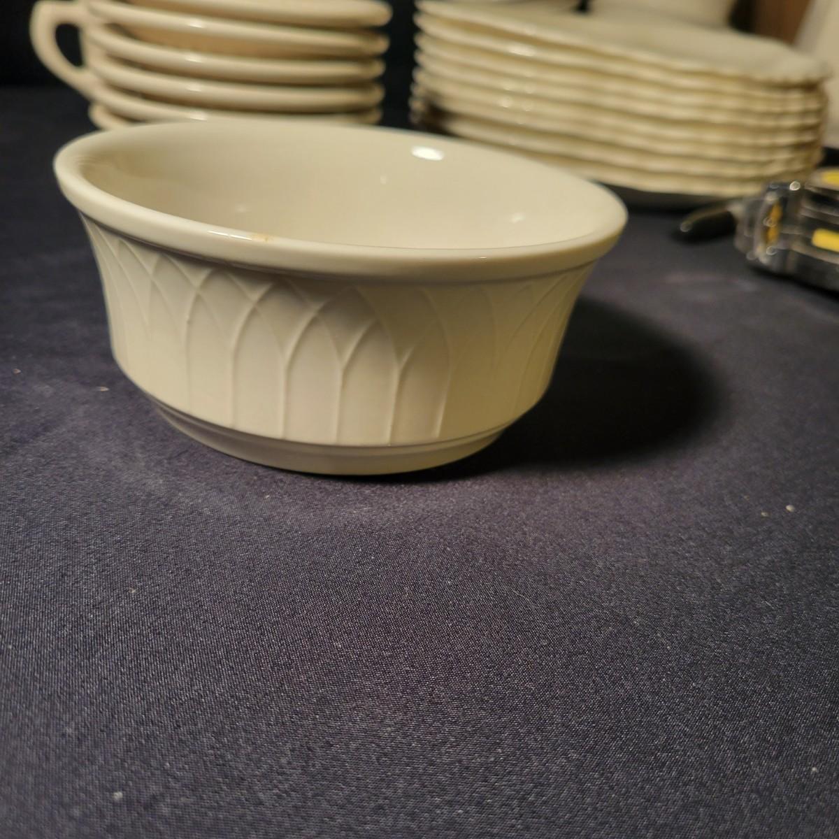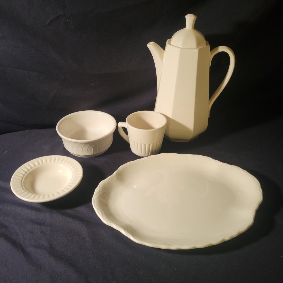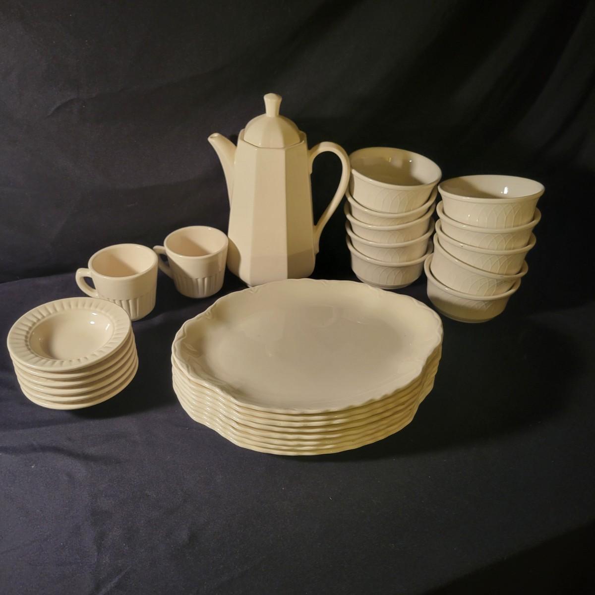 A collection of 27 pieces of white dinnerware in good condition with no notable damage. Note their are multiple brands, see images. Included eight dinner plates, ten bowls, six saucers, two coffee cups and a coffee carafe. Carafe measures approximately 6" x 11" Shipping available. Shipping can be costly please call UPS store at 828-252-6930 for quote