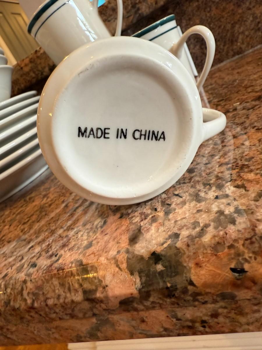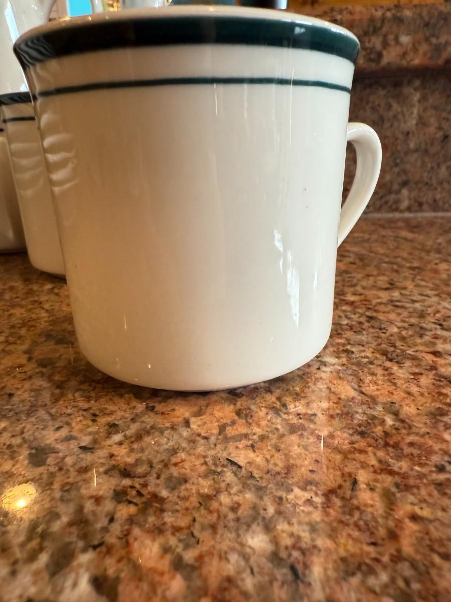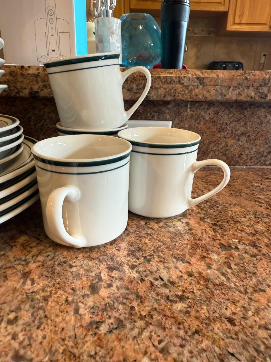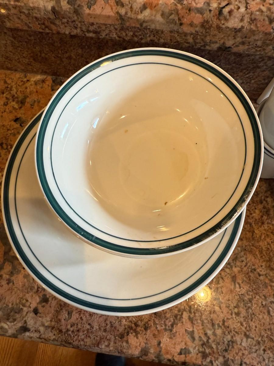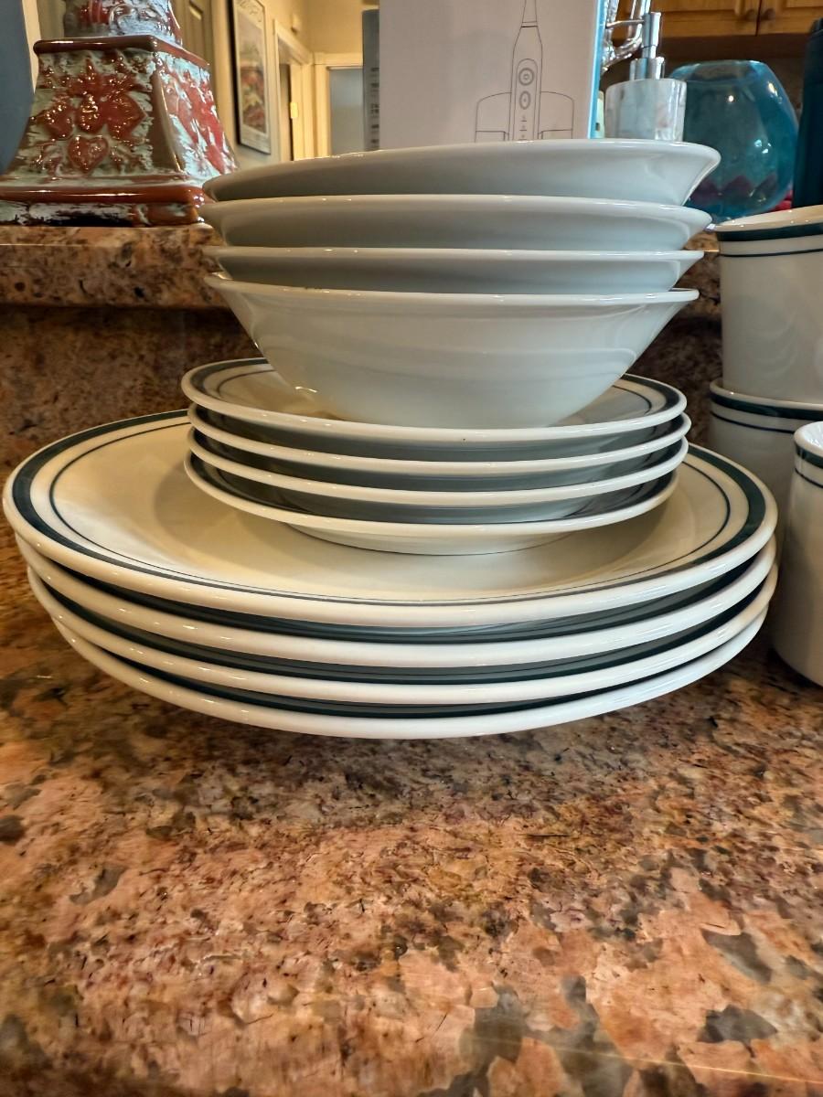 lassic white ceramic dishes with a blue rim. Includes dinner plates and shallow bowls—great for everyday use or adding to an existing set