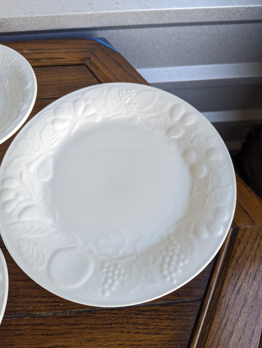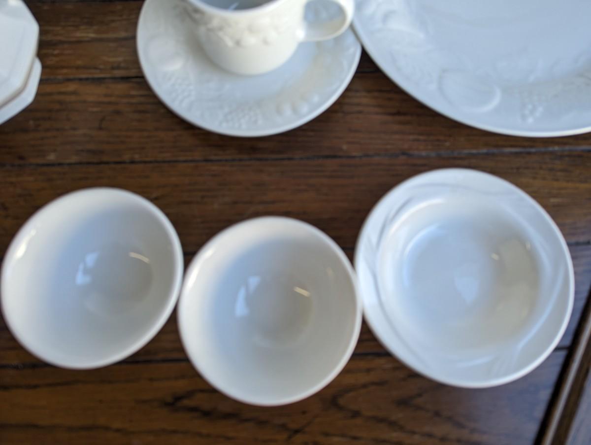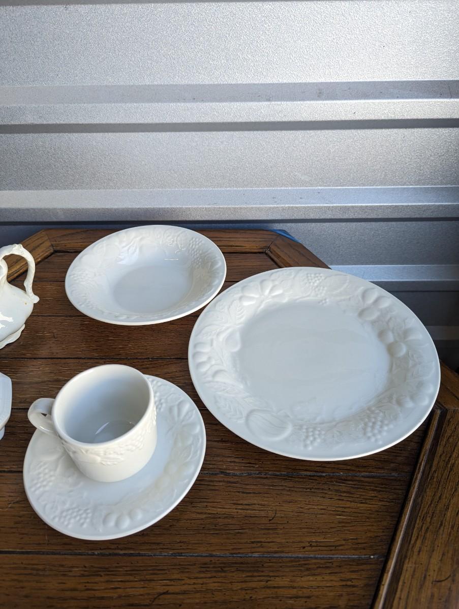 Nice set of white dishes with fruit pattern. Cream and sugar are not matching.