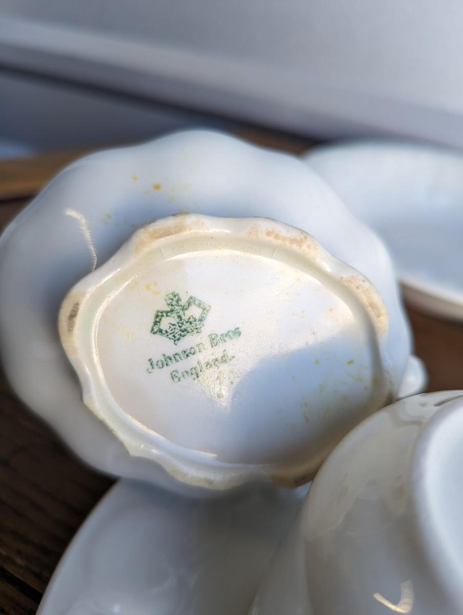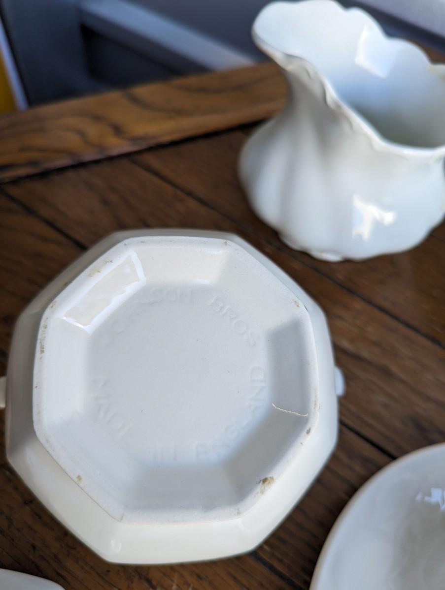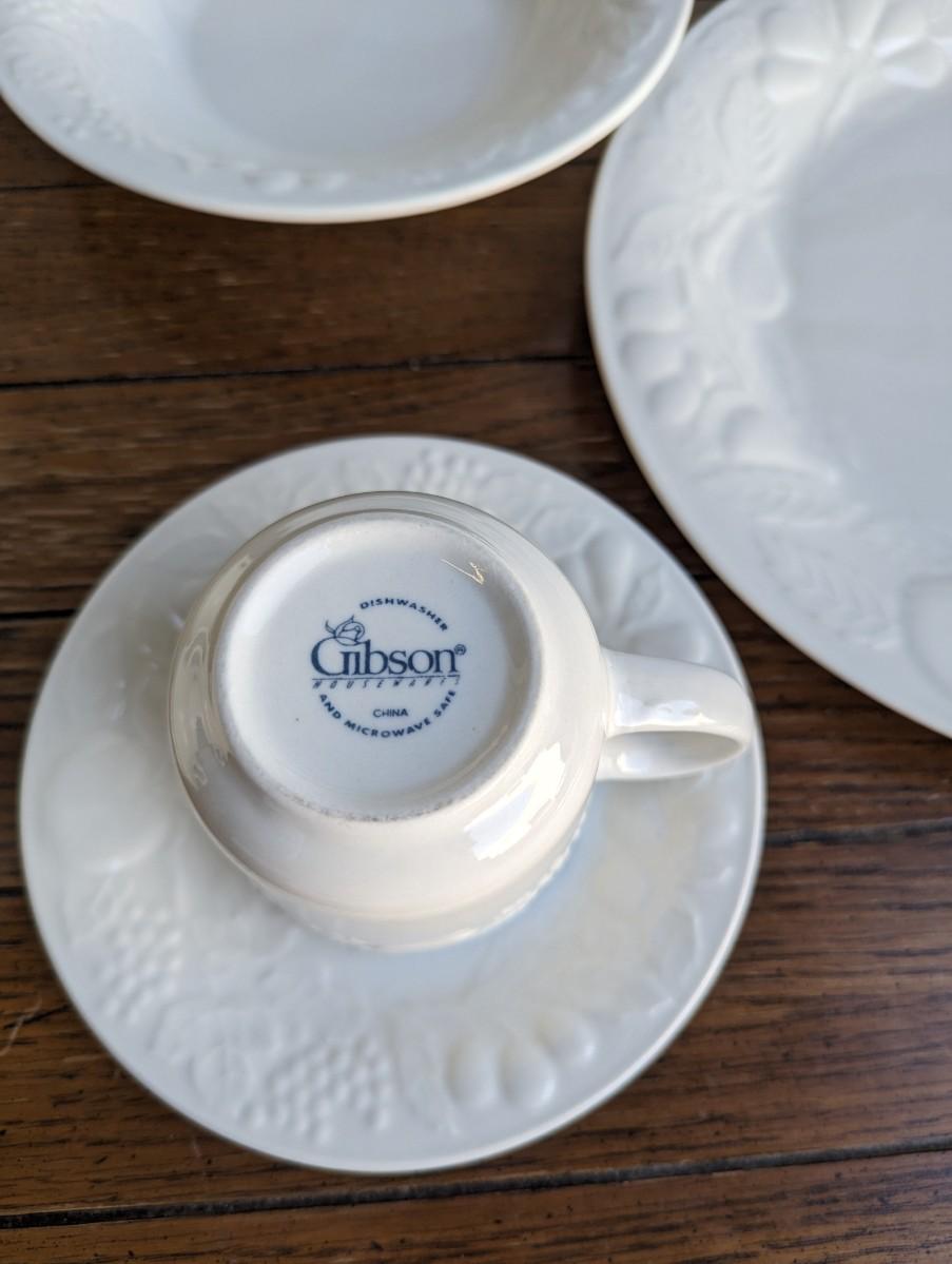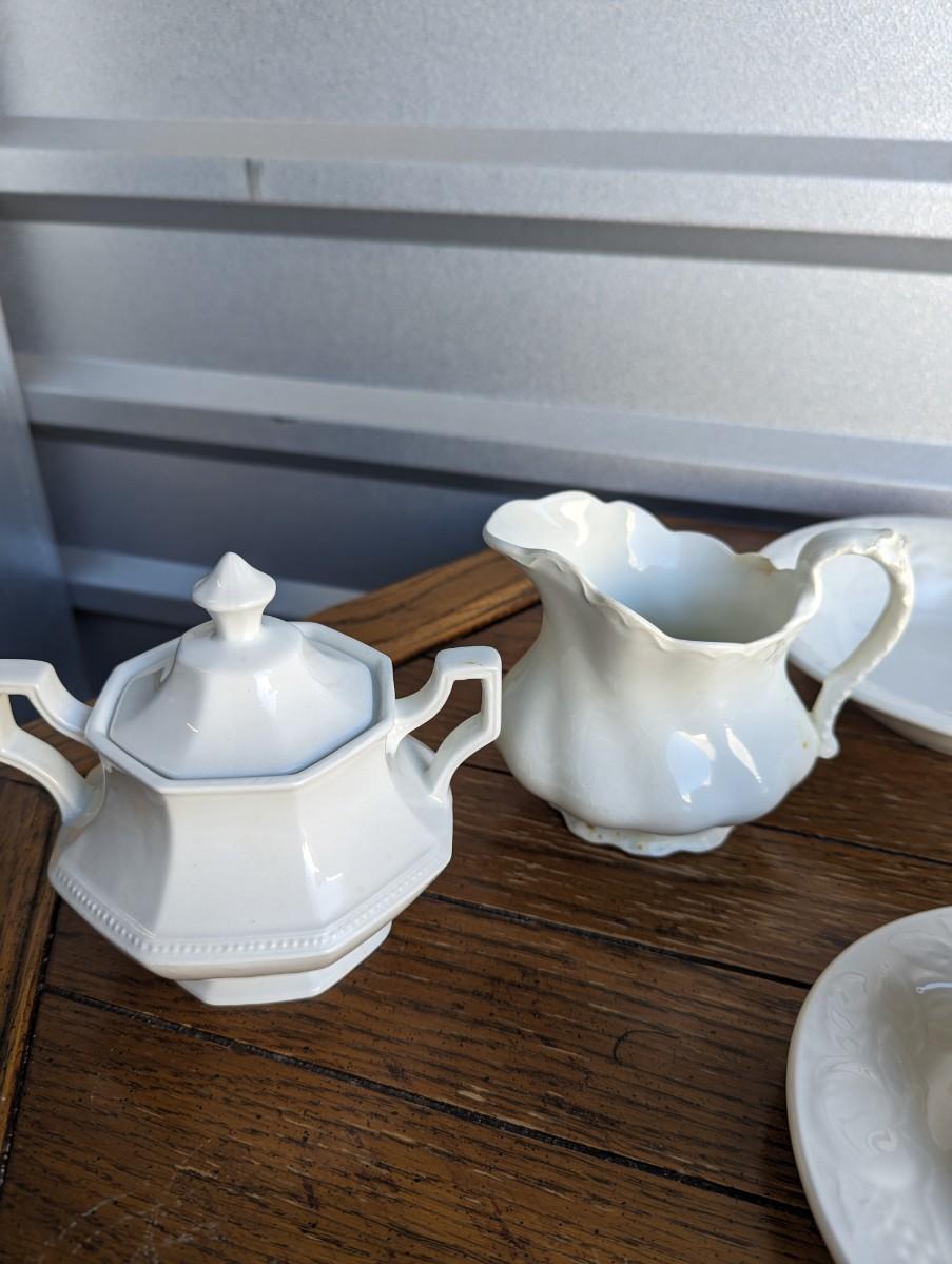 Nice set of white dishes with fruit pattern. Cream and sugar are not matching.