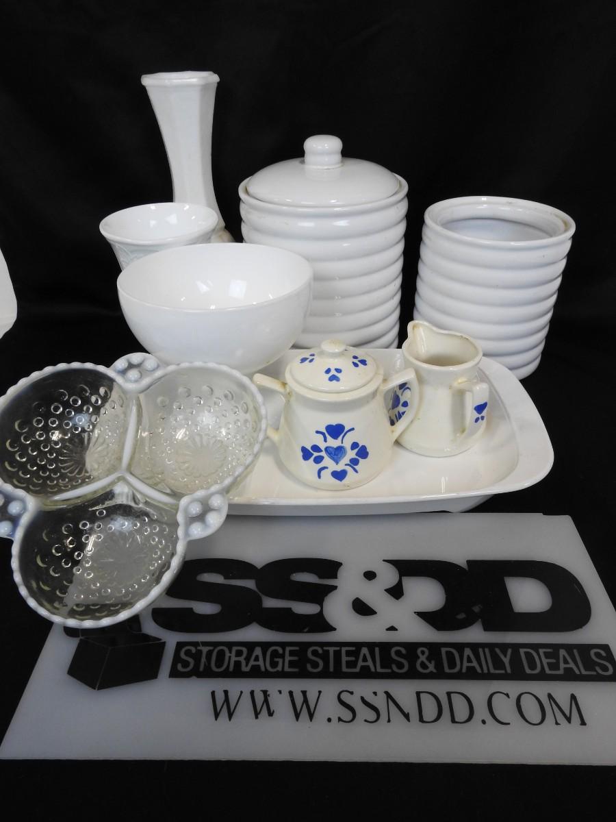 White Dishes/Decor Lot: Canisters, Vase, Tray,Section Serving Dish, Some VINTAGE