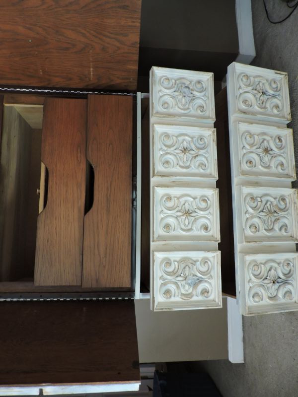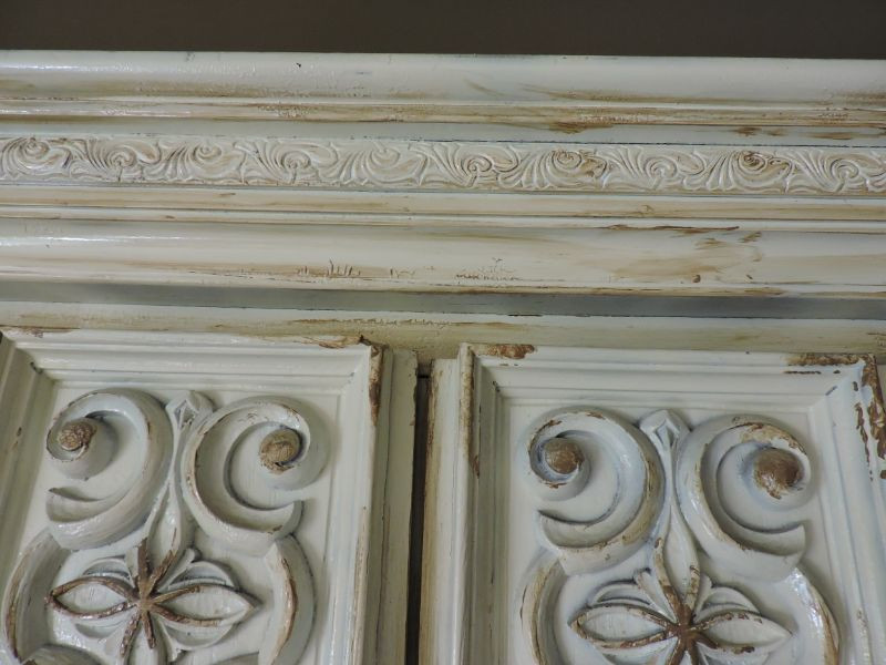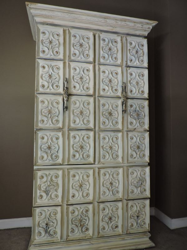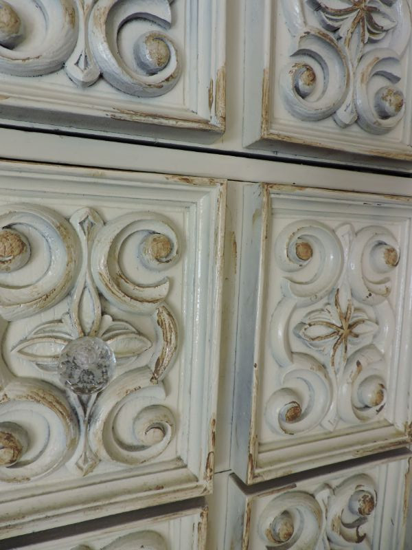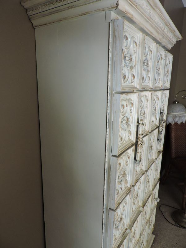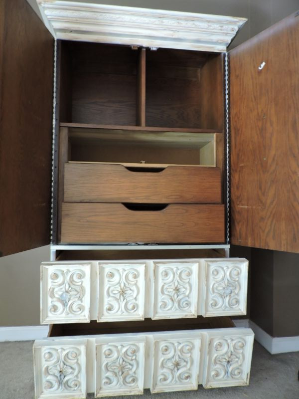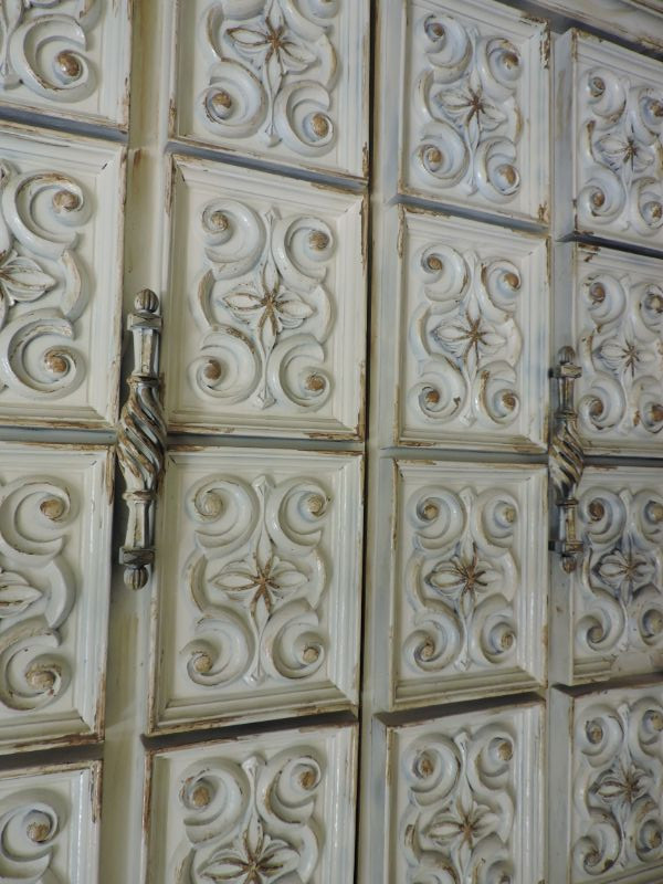 What a statement piece! This 34”x70”x19” white distressed armoire has carved wood panels on the front. There are two doors with shelves and drawers inside, and two large bottom drawers. Not only beautiful, but functional!