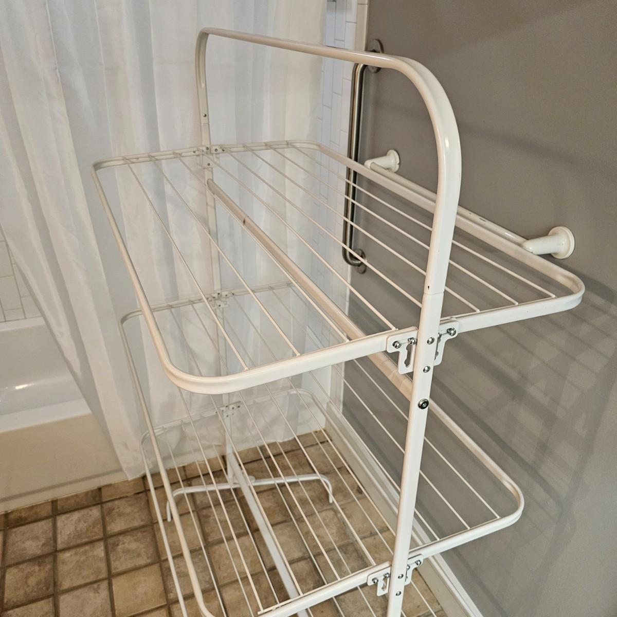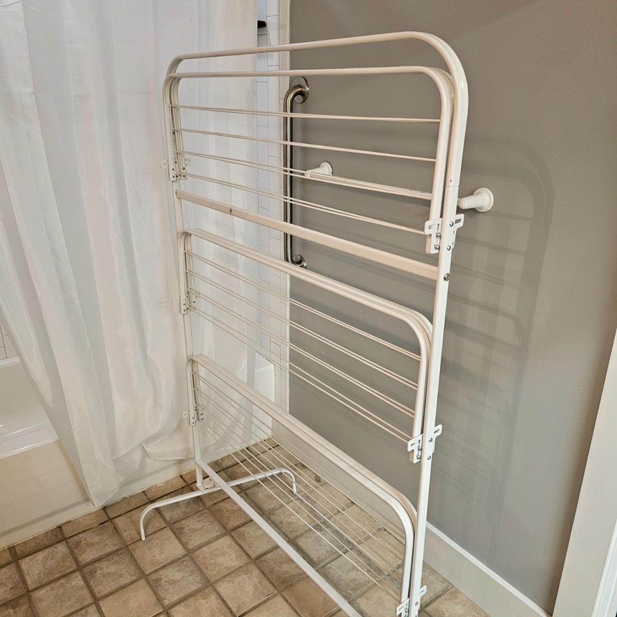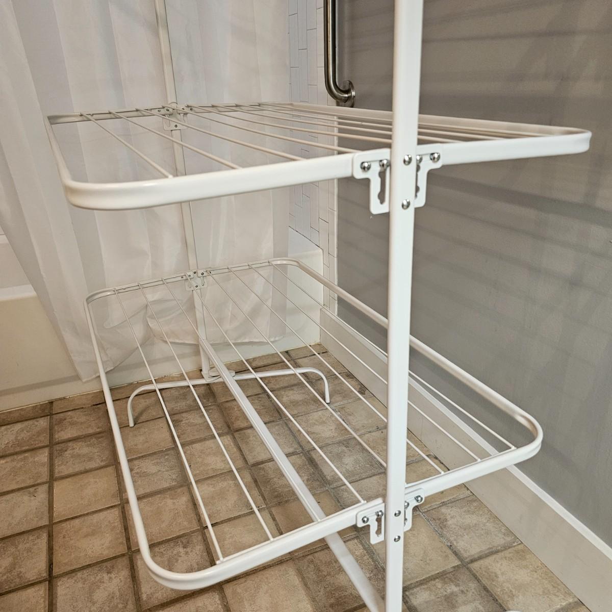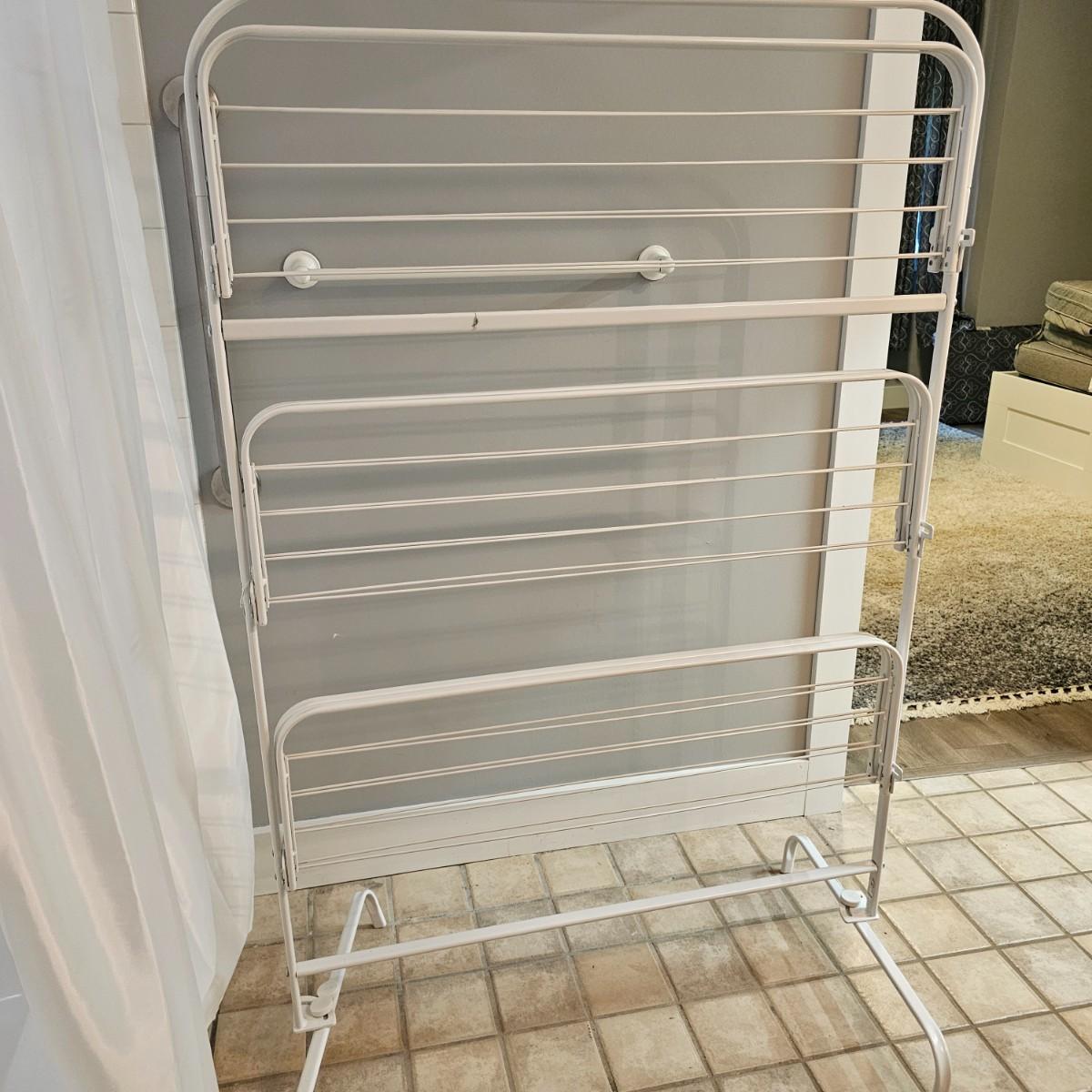 An adjustable, collapsible metal drying rack. Unit has six arms/shelves that fold out for use. Entire piece folds flat for easy storage: 39" x 23" x 61"H. See photos for details. Local pickup only.