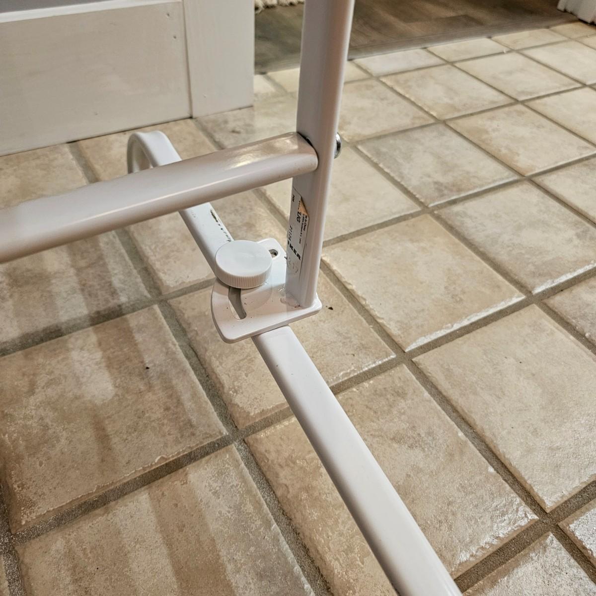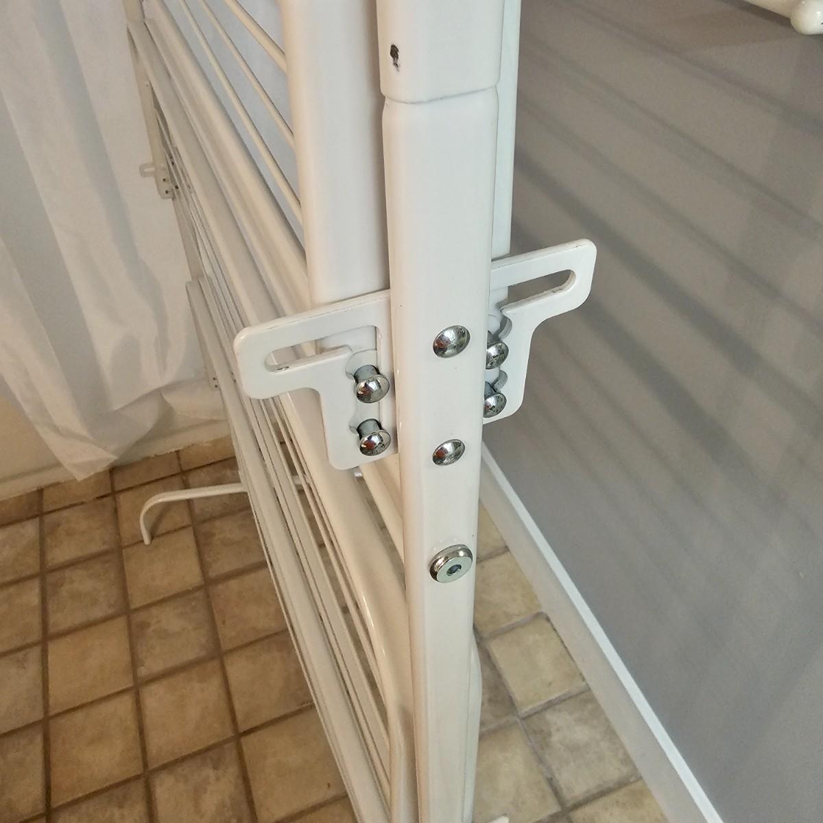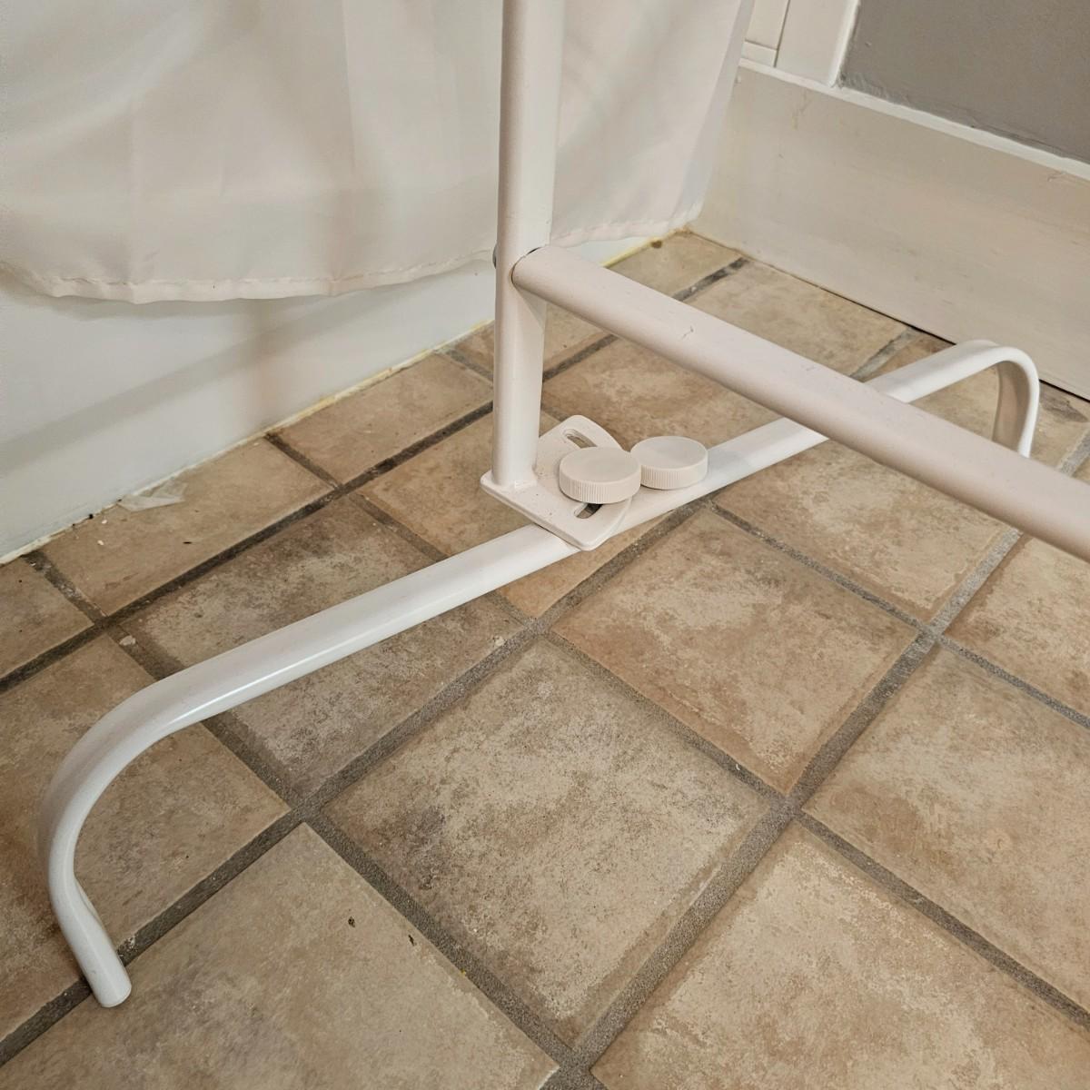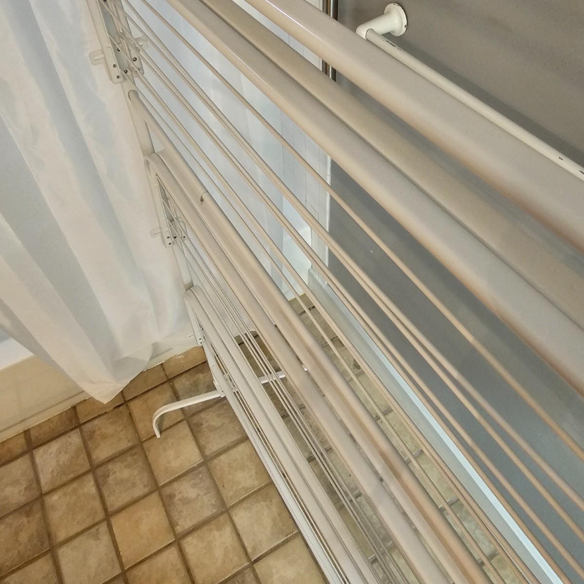 An adjustable, collapsible metal drying rack. Unit has six arms/shelves that fold out for use. Entire piece folds flat for easy storage: 39" x 23" x 61"H. See photos for details. Local pickup only.