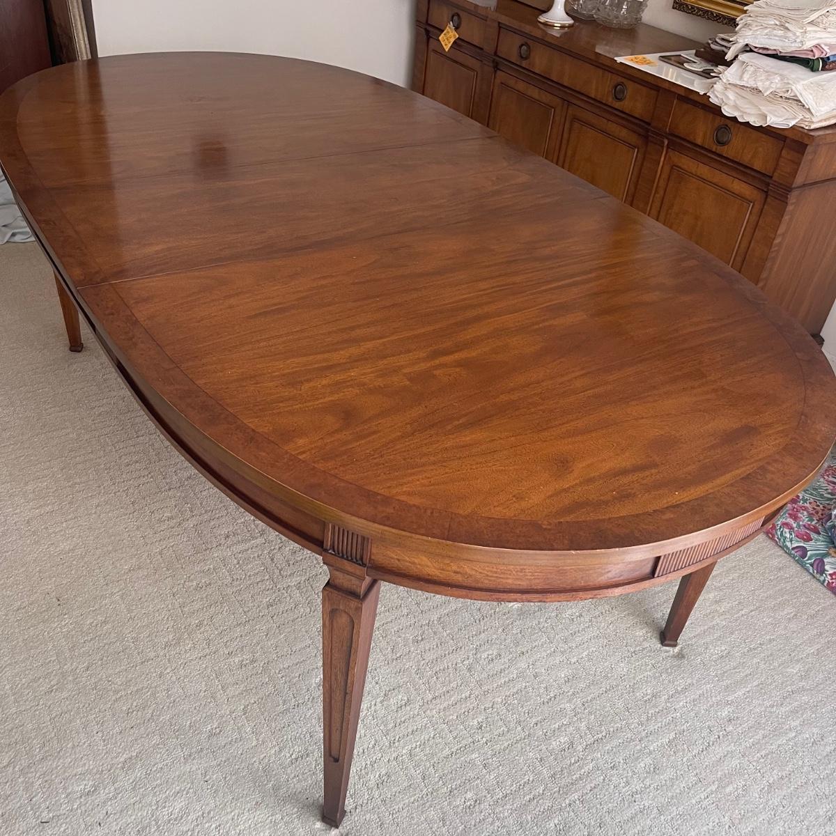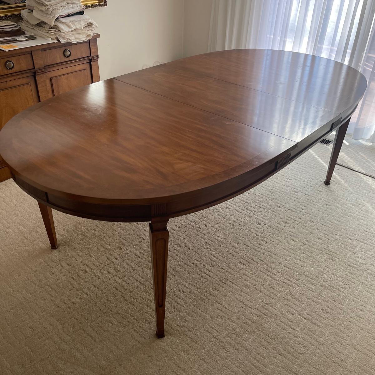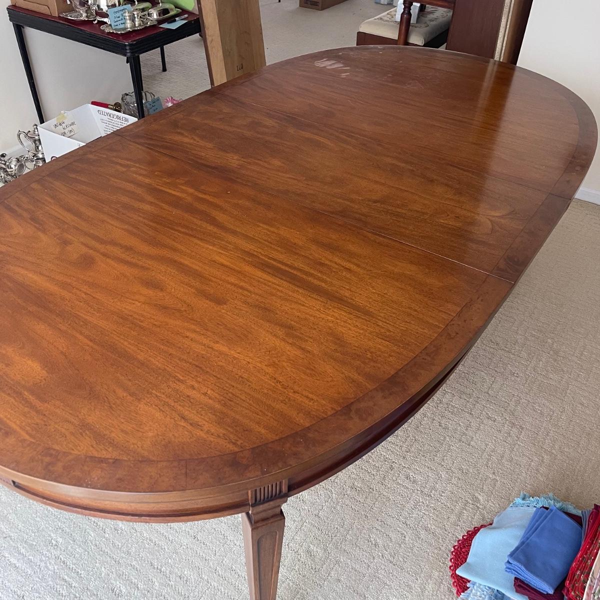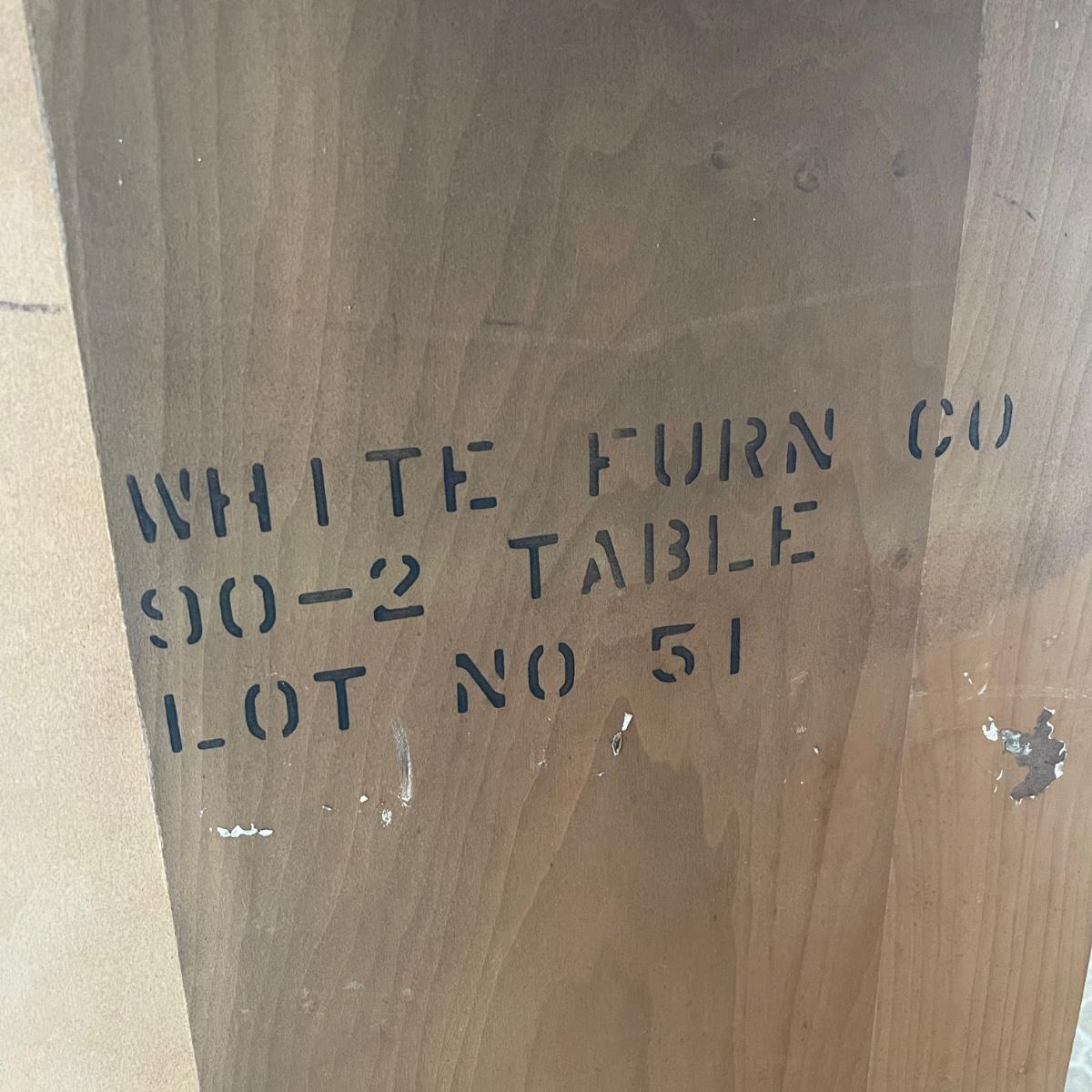 White Furniture Company dining room table with two leaf inserts. With both table leafs in, the table is 100 inches long, with no inserts the table is 68 inches long. It is 45 inches wide and 29 inches tall. There is a metal hook on the underside that hooks together when there are no inserts in so the table doesn’t pull apart. Table has not real blemishes and is beautiful wood grain.