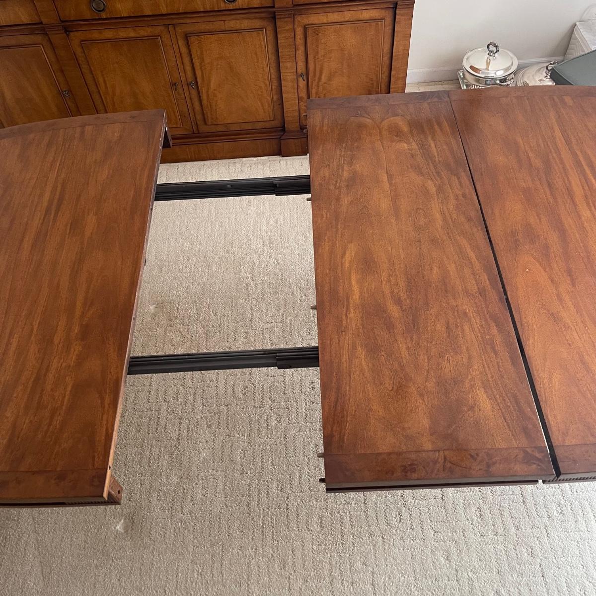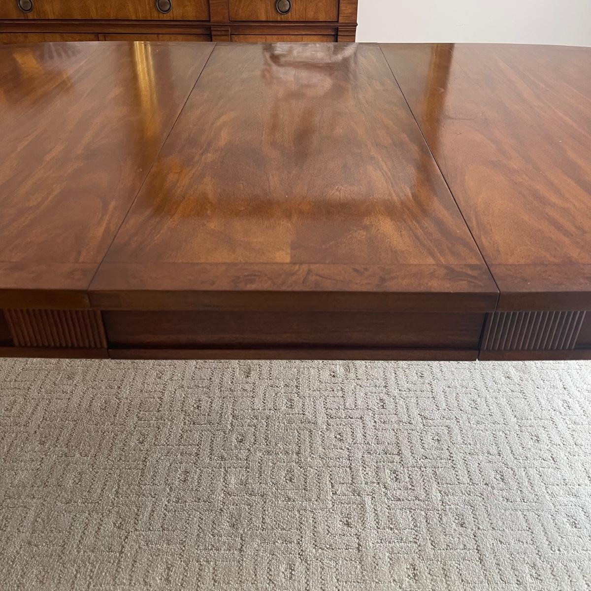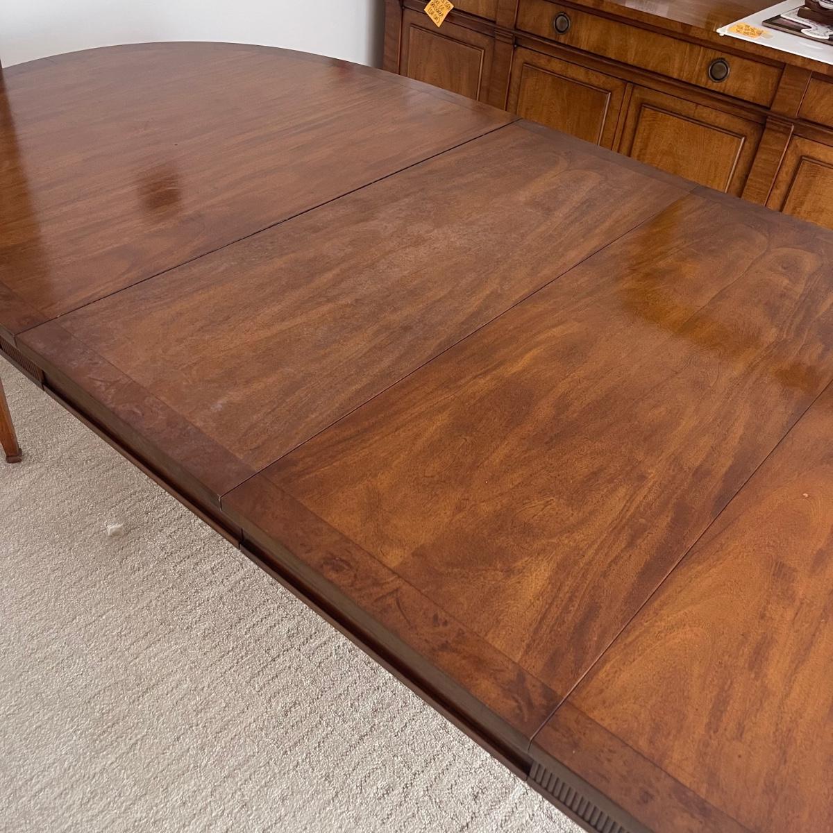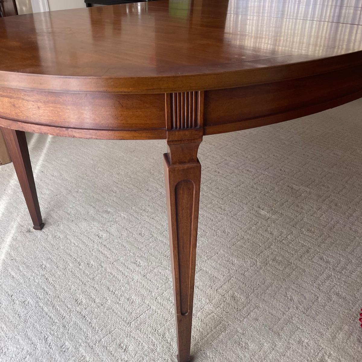 White Furniture Company dining room table with two leaf inserts. With both table leafs in, the table is 100 inches long, with no inserts the table is 68 inches long. It is 45 inches wide and 29 inches tall. There is a metal hook on the underside that hooks together when there are no inserts in so the table doesn’t pull apart. Table has not real blemishes and is beautiful wood grain.