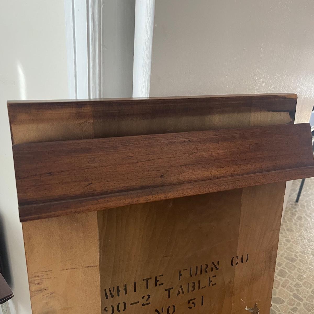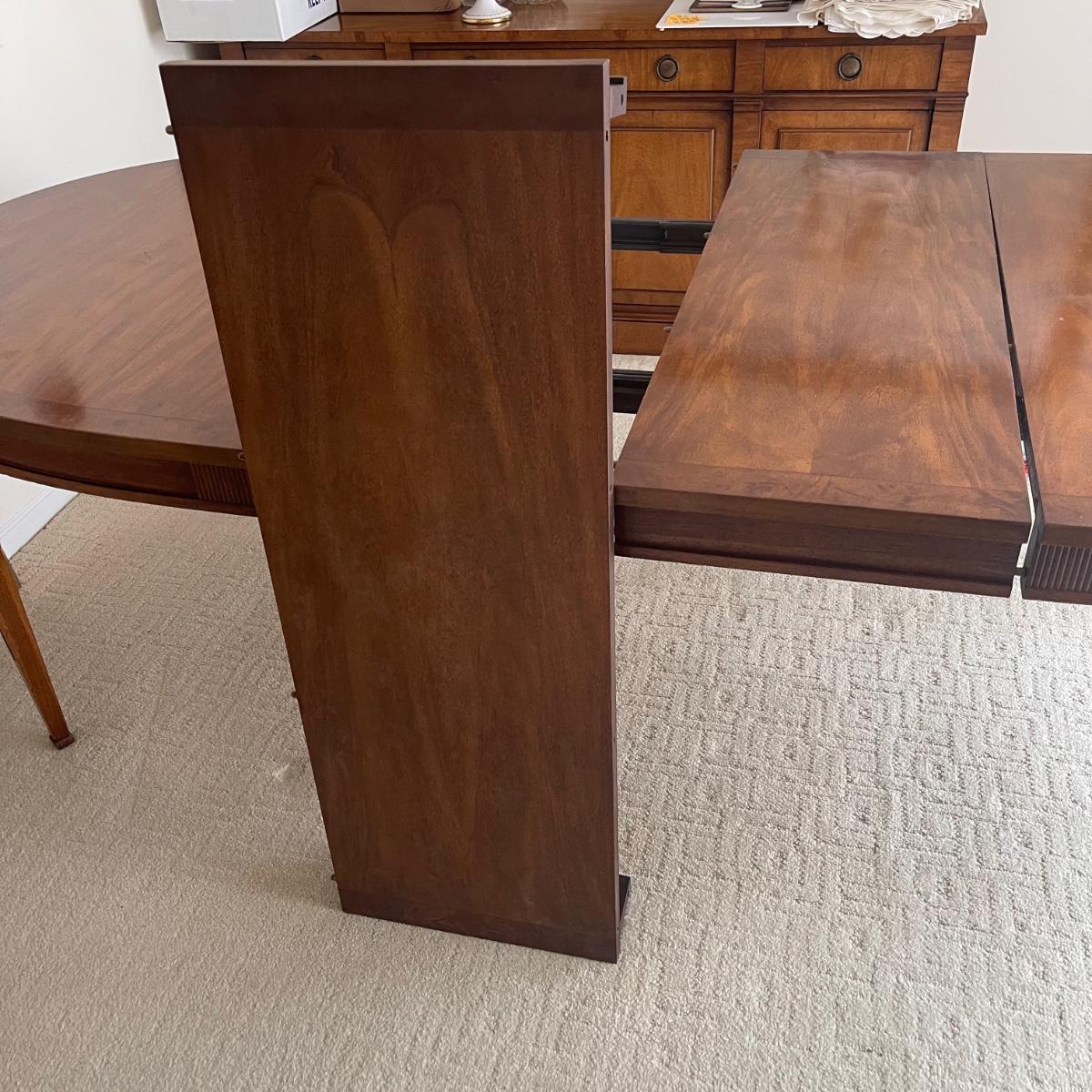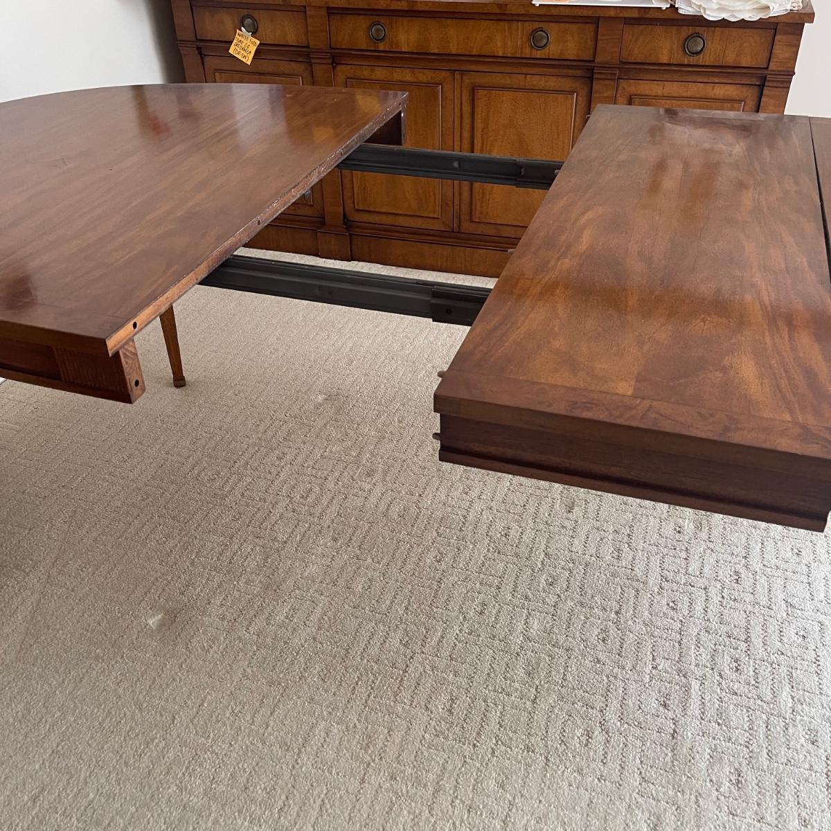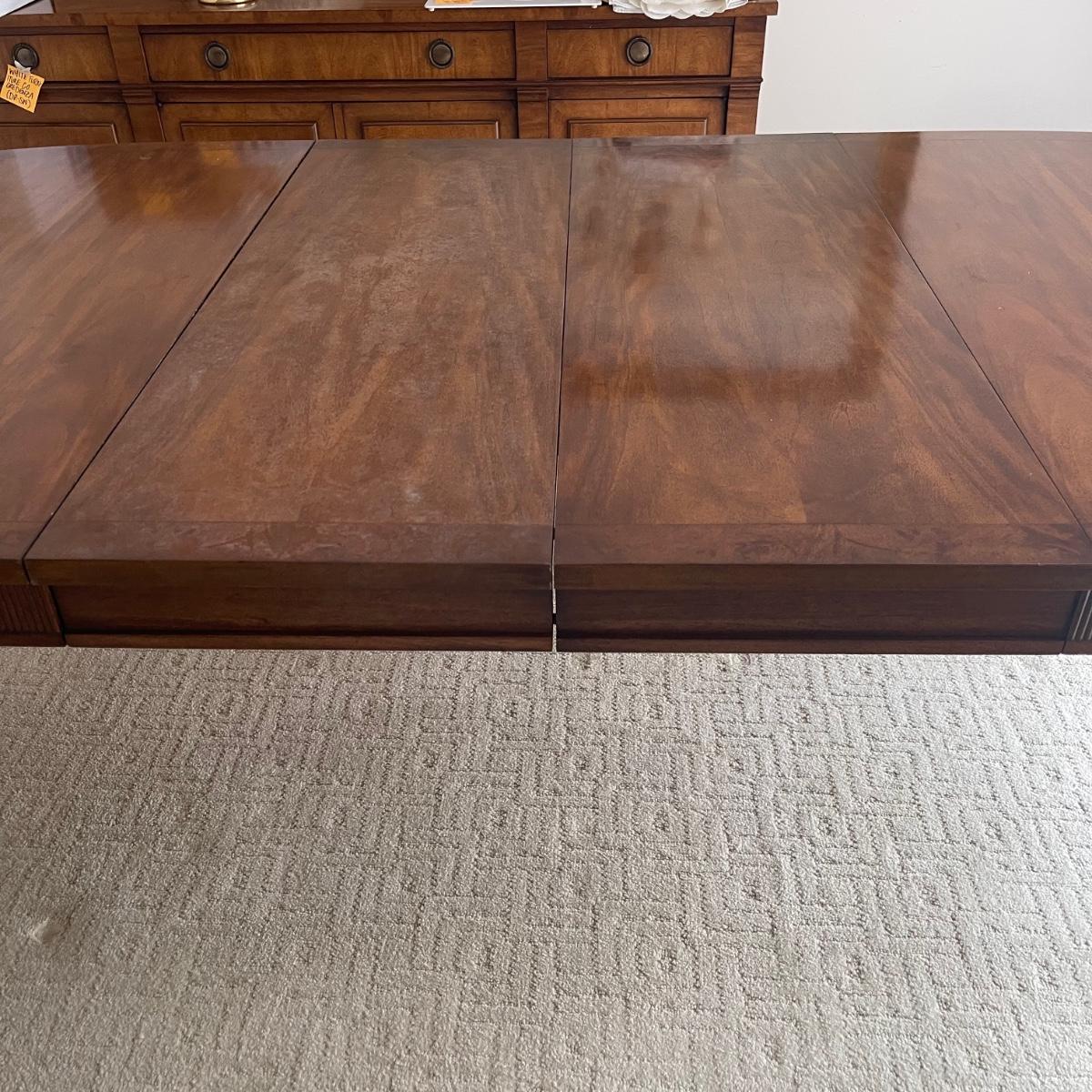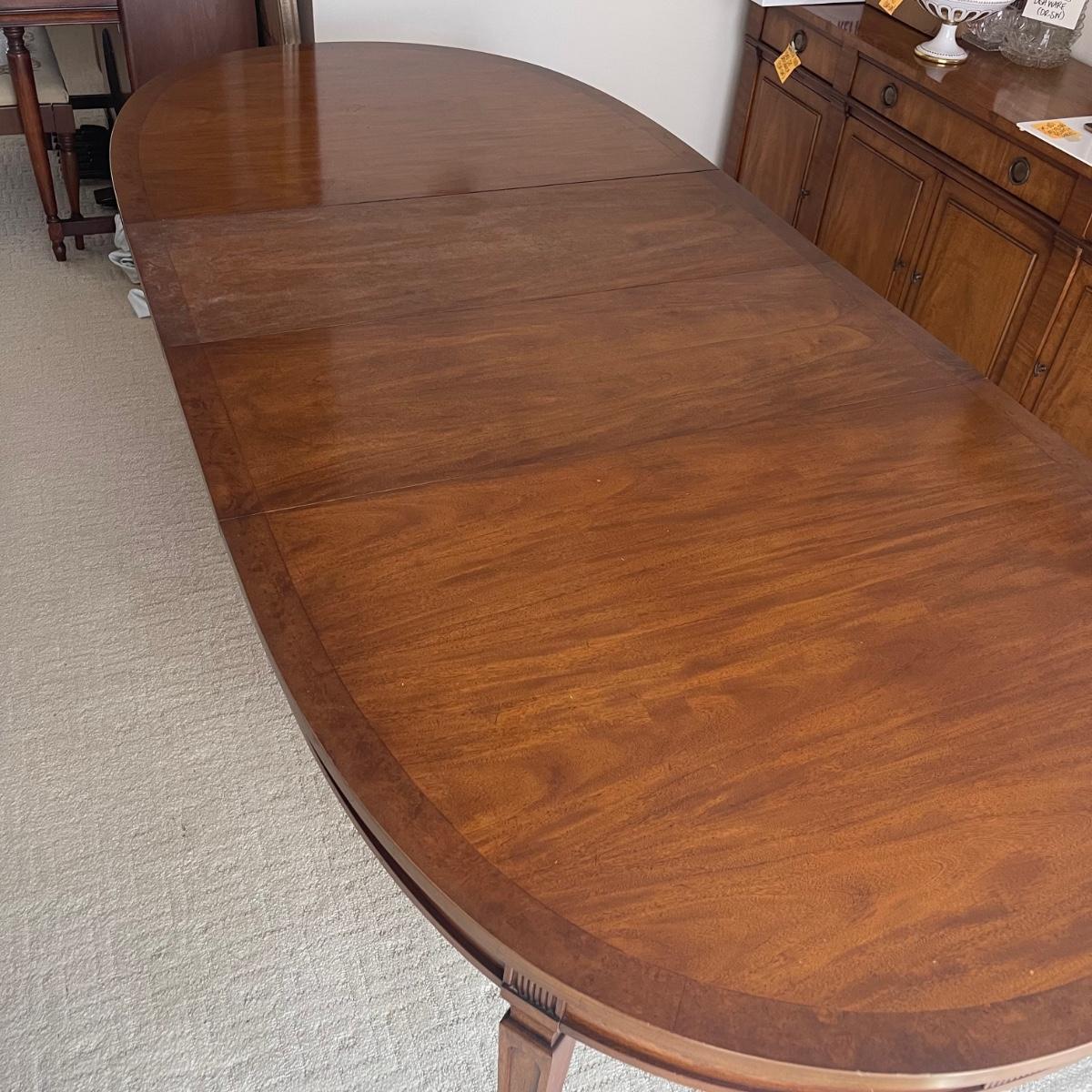 White Furniture Company dining room table with two leaf inserts. With both table leafs in, the table is 100 inches long, with no inserts the table is 68 inches long. It is 45 inches wide and 29 inches tall. There is a metal hook on the underside that hooks together when there are no inserts in so the table doesn’t pull apart. Table has not real blemishes and is beautiful wood grain.