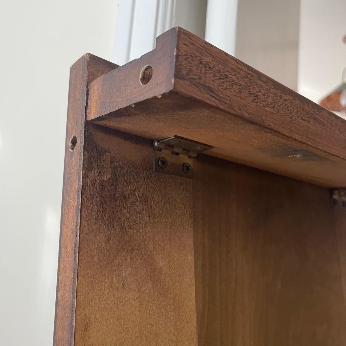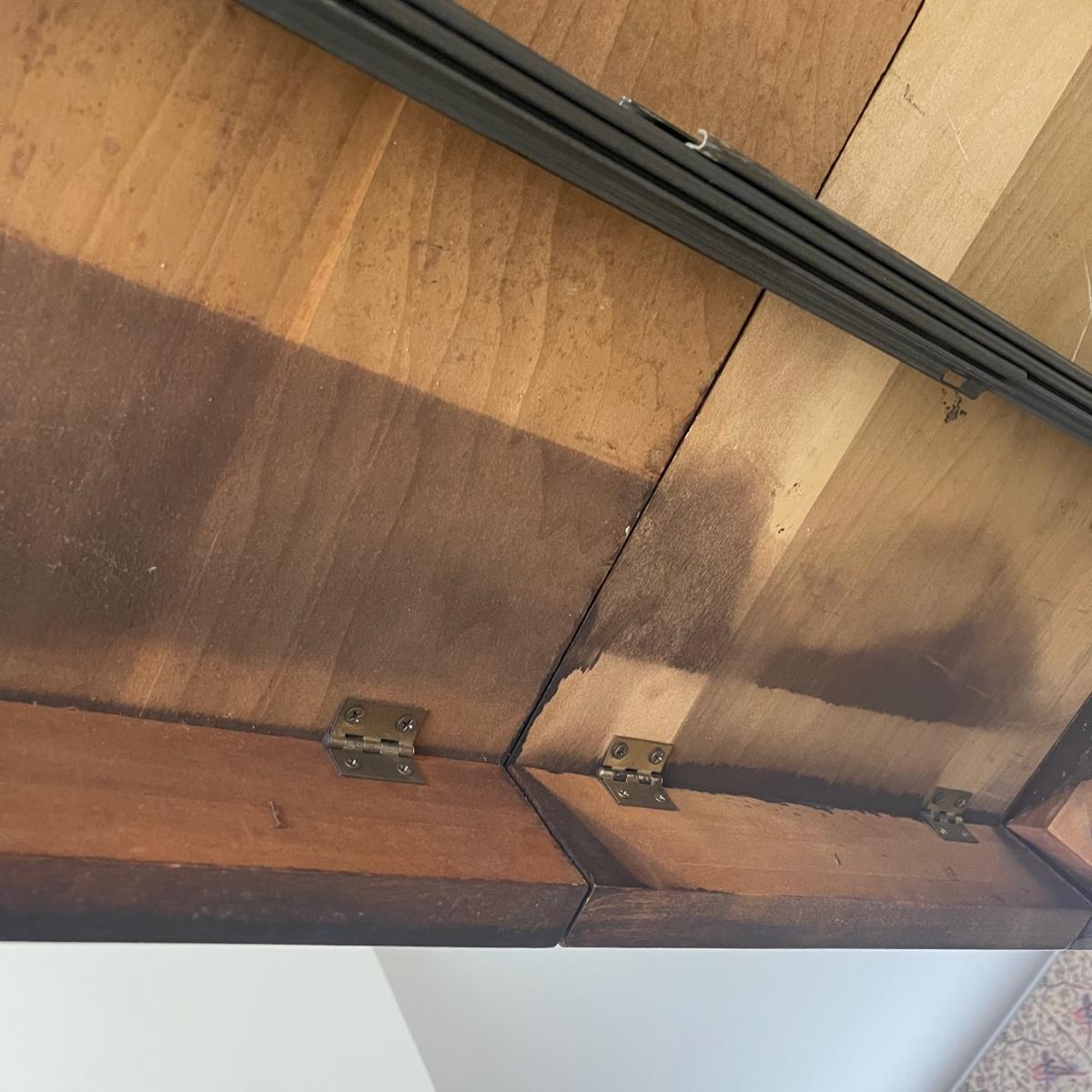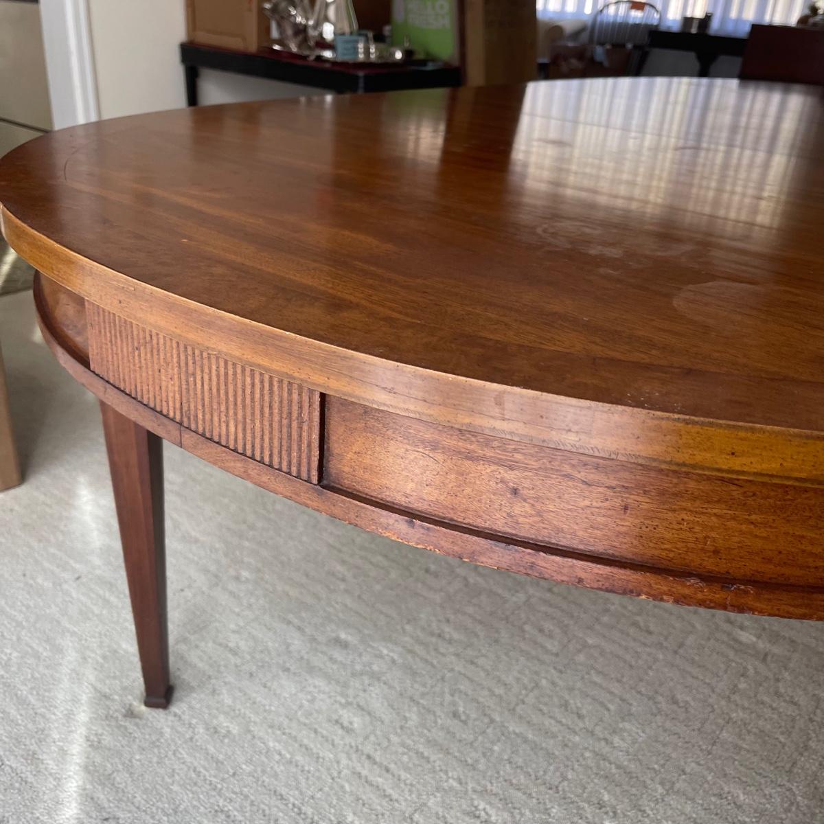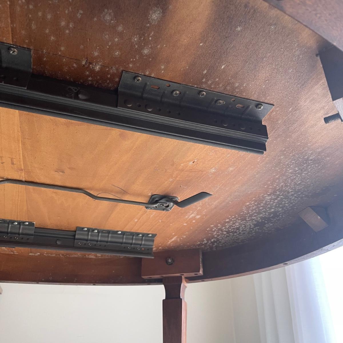 White Furniture Company dining room table with two leaf inserts. With both table leafs in, the table is 100 inches long, with no inserts the table is 68 inches long. It is 45 inches wide and 29 inches tall. There is a metal hook on the underside that hooks together when there are no inserts in so the table doesn’t pull apart. Table has not real blemishes and is beautiful wood grain.