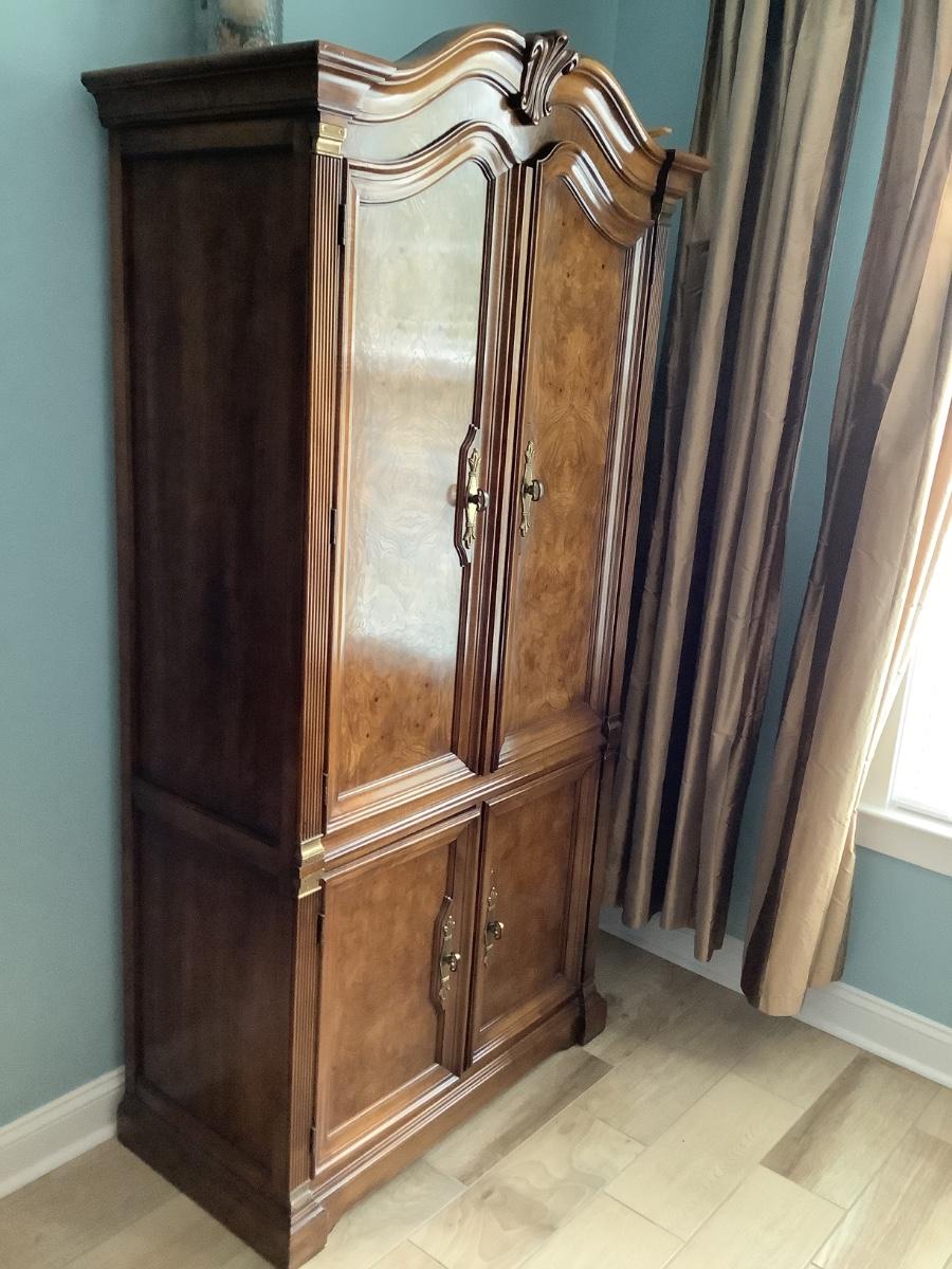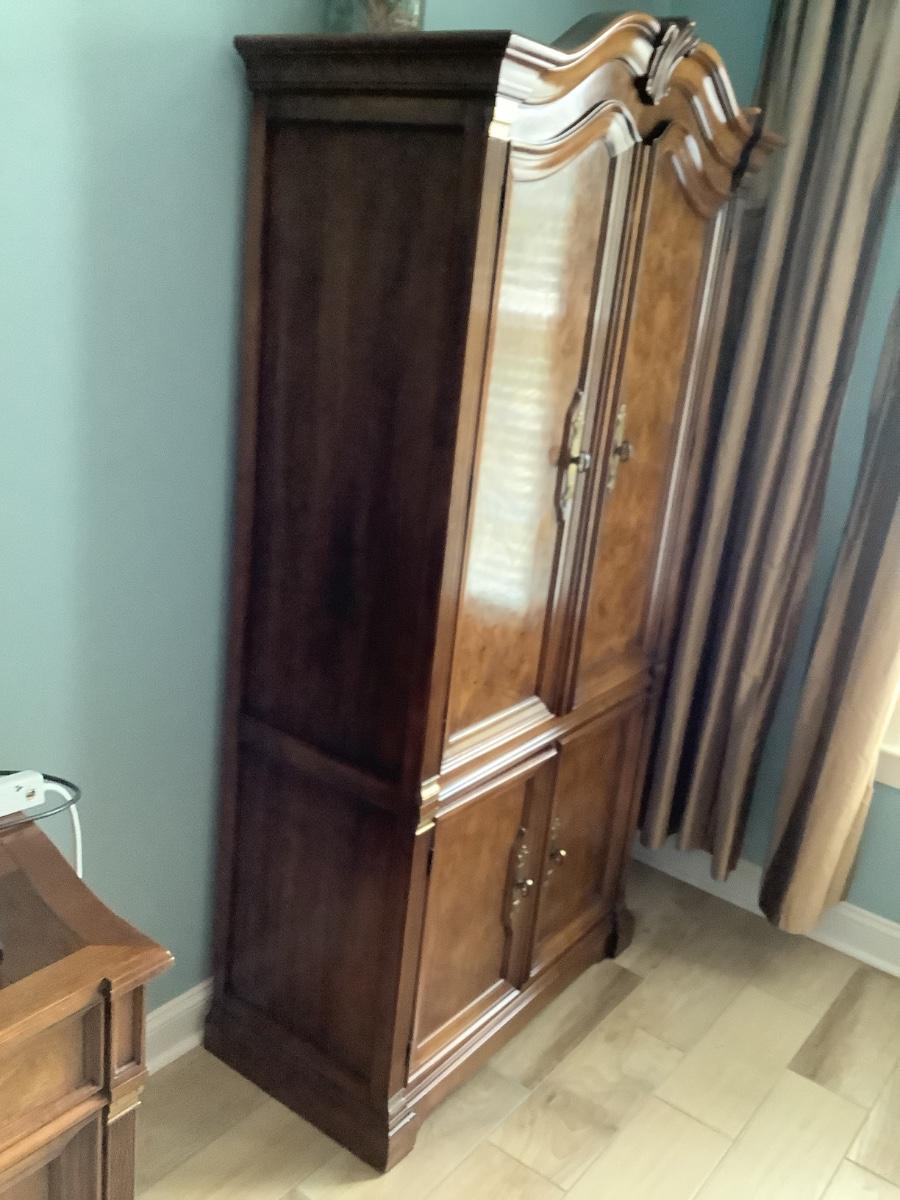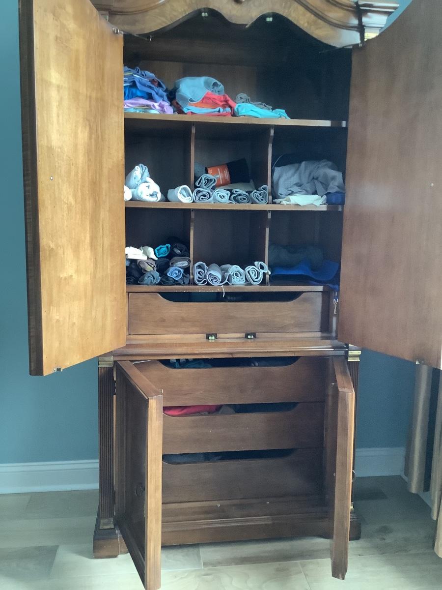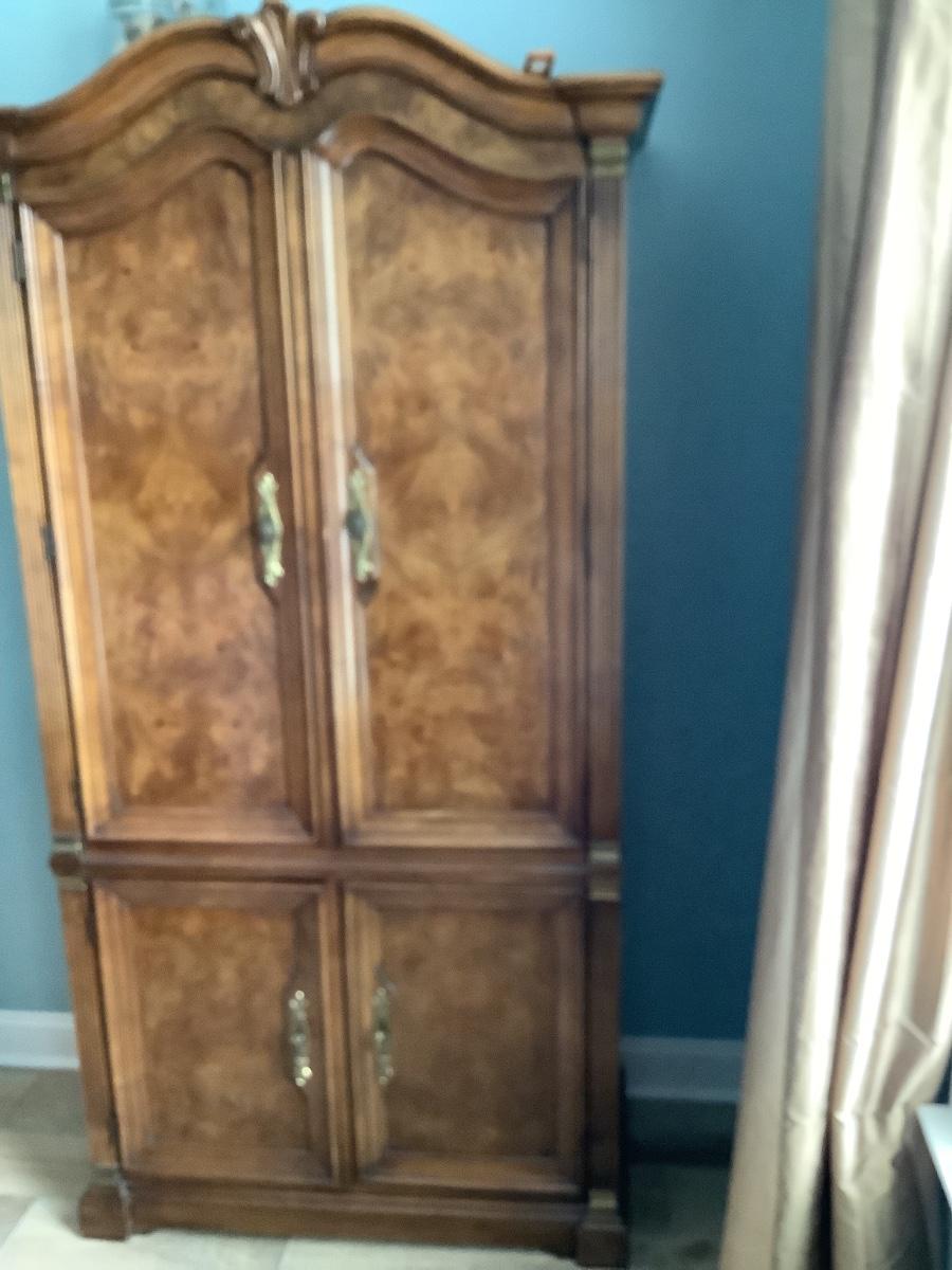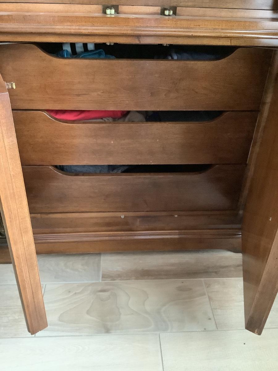 White furniture co wardrobe, 4 door, top shelf, 6 cubby, one divided drawer, 3 drawers on bottom, 78”H, 36”W, 18”depth