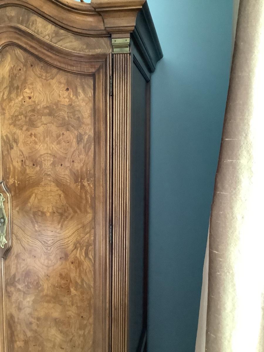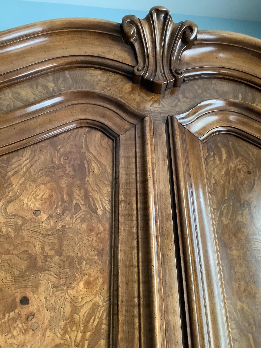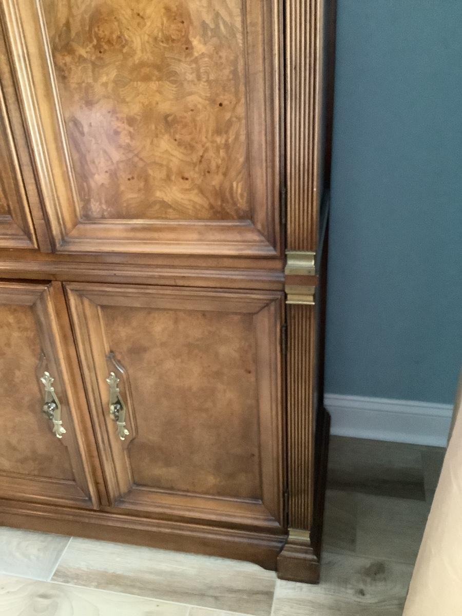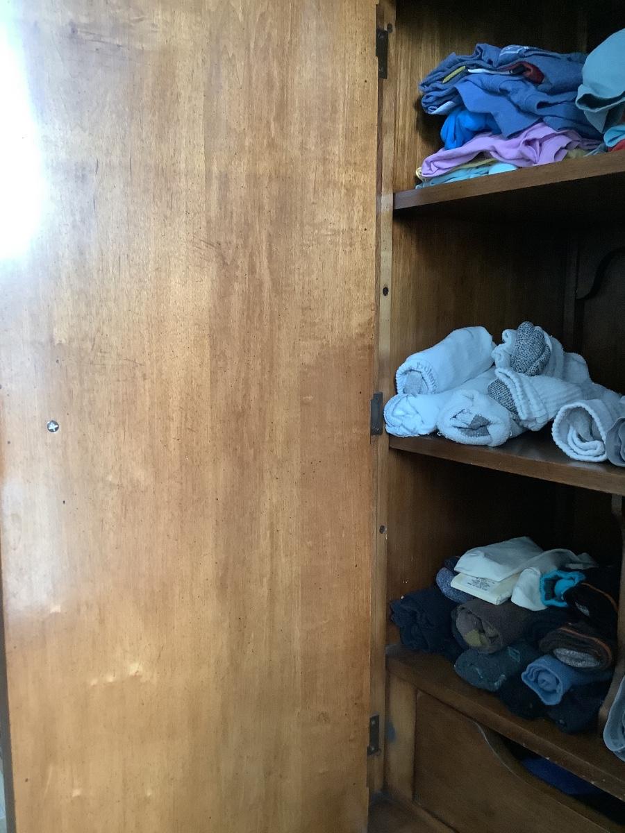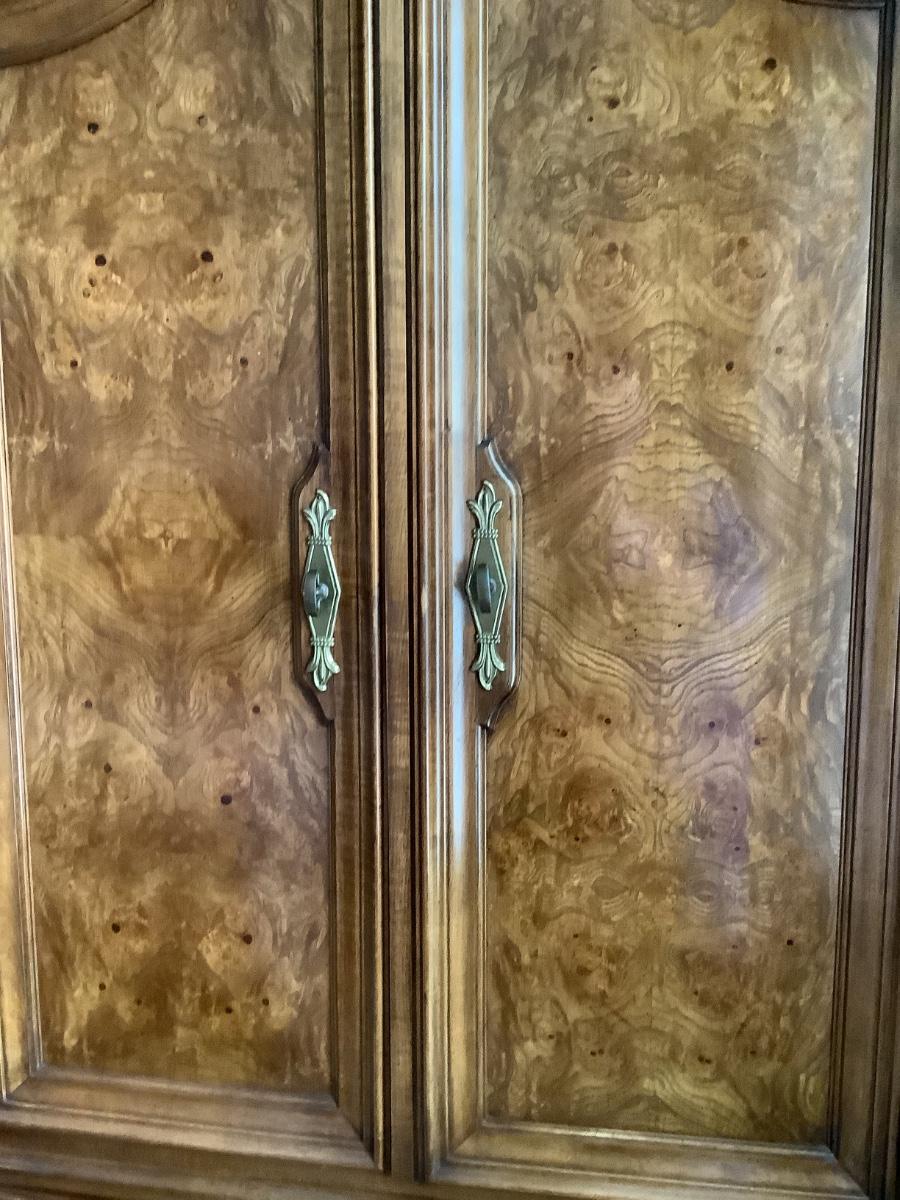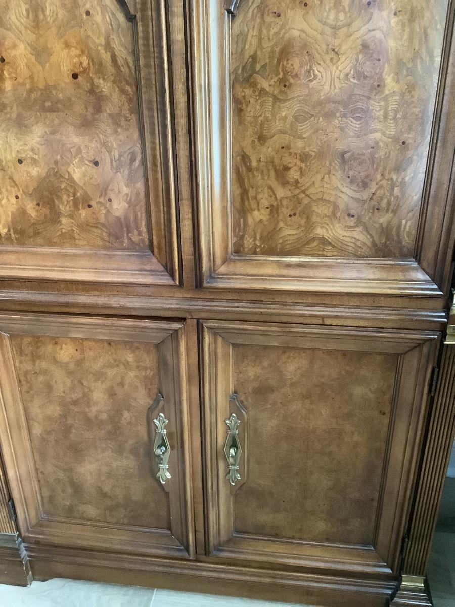 White furniture co wardrobe, 4 door, top shelf, 6 cubby, one divided drawer, 3 drawers on bottom, 78”H, 36”W, 18”depth