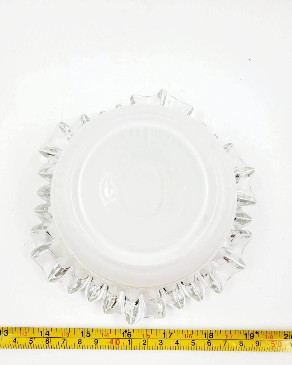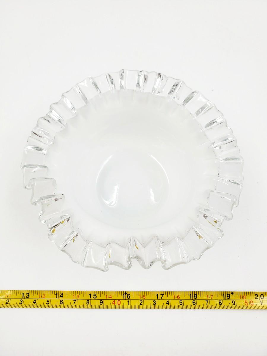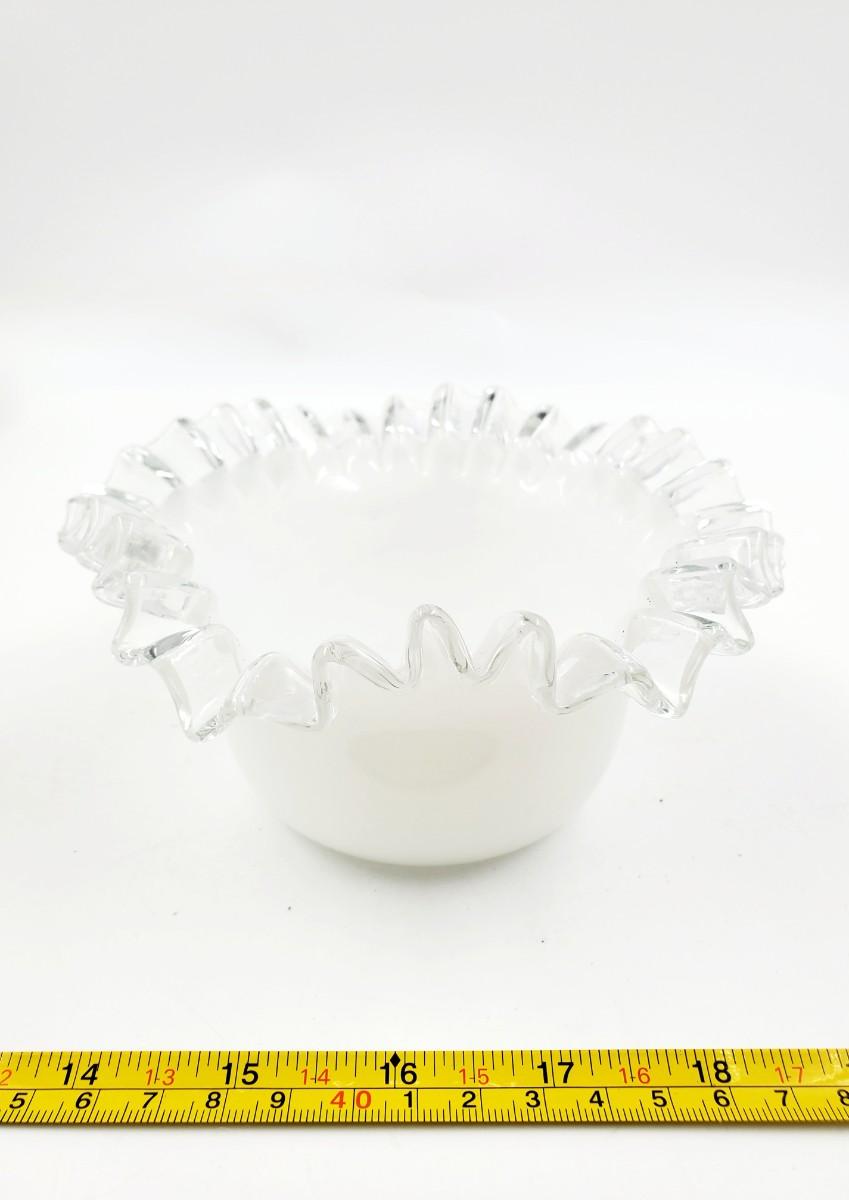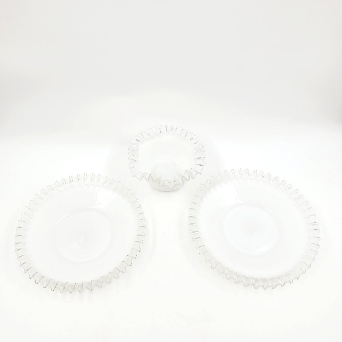 WHITE GLASS BOWL AND 2 PLATES WITH RUFFLED SILVER CRESTED EDGE