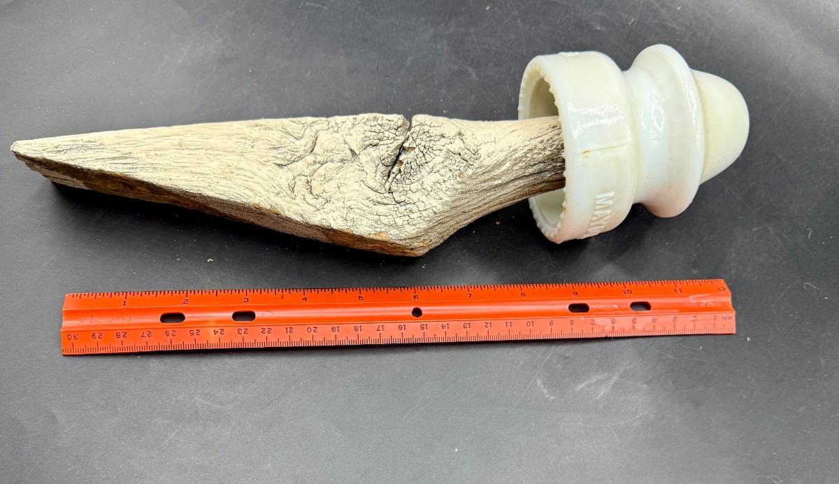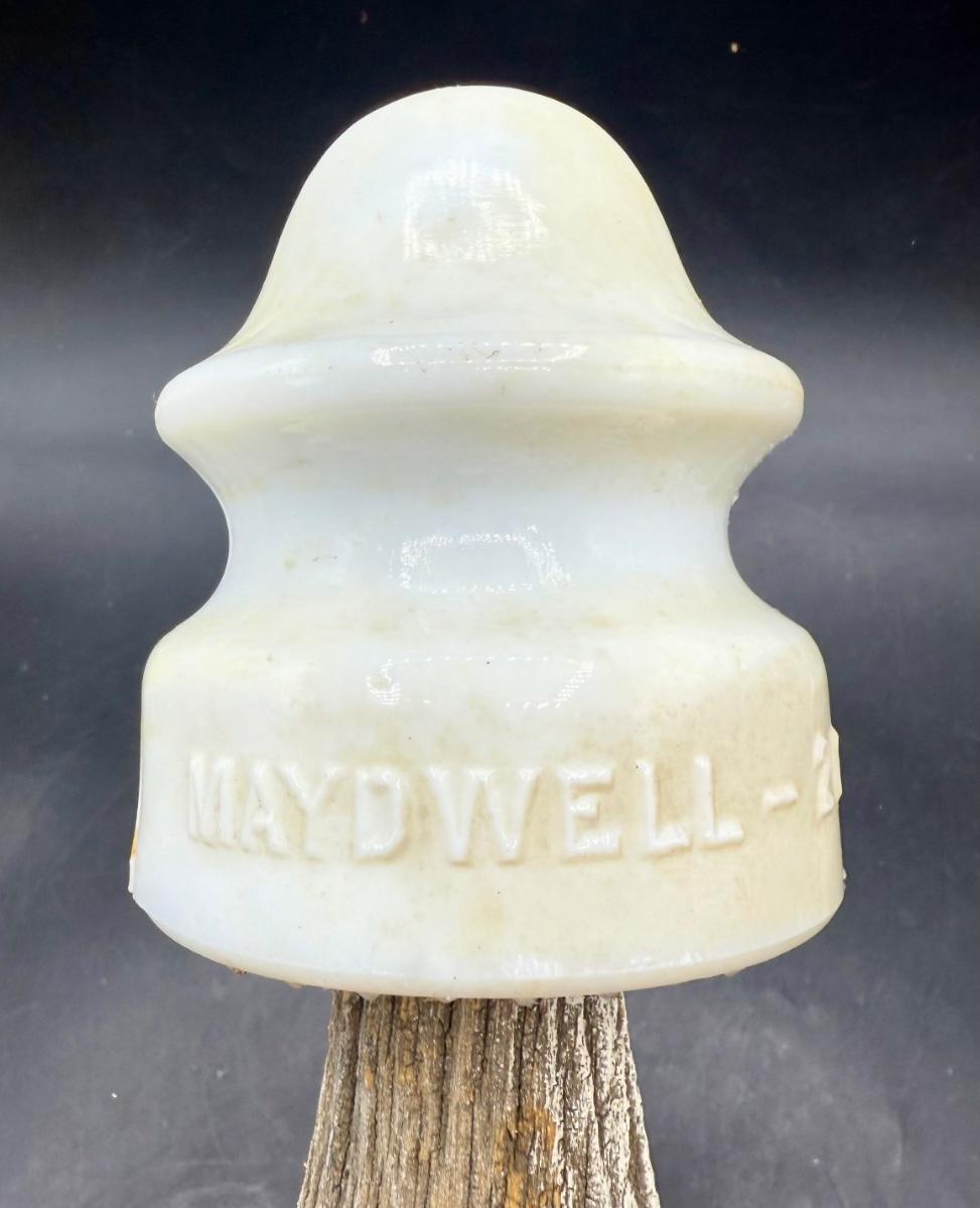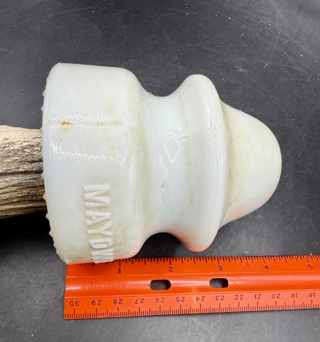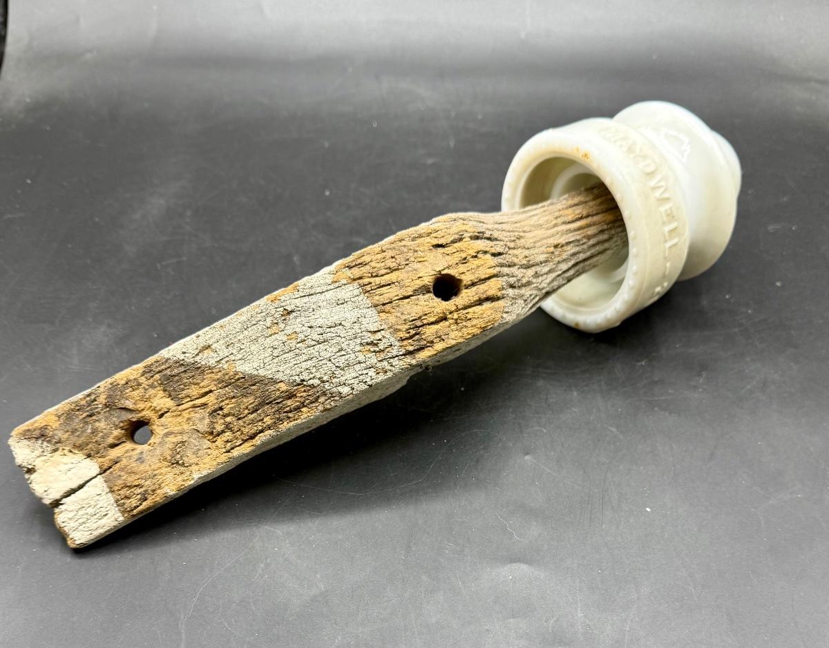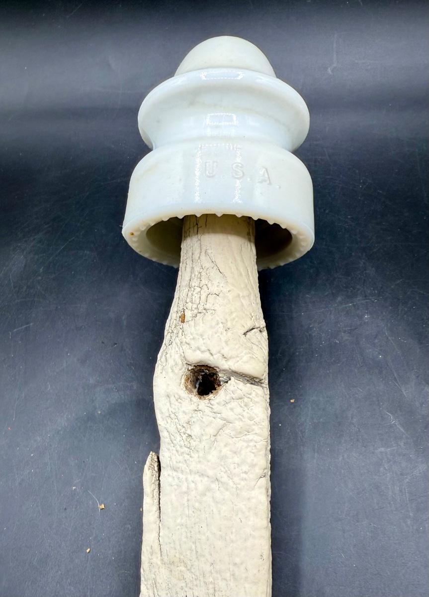 Fully intact, no chips or cracks. Mounted on a white painted wood bracket. Insulator is approx. 4" tall.