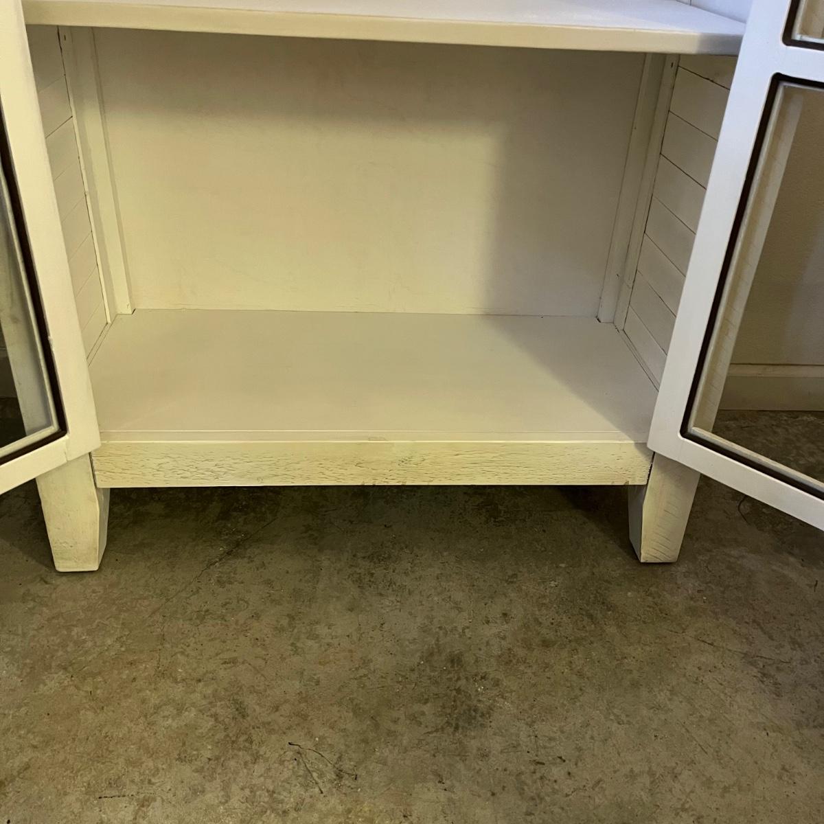 Lot includes white wooden and glass cabinet that measures 15” x 32” x 42.5”.