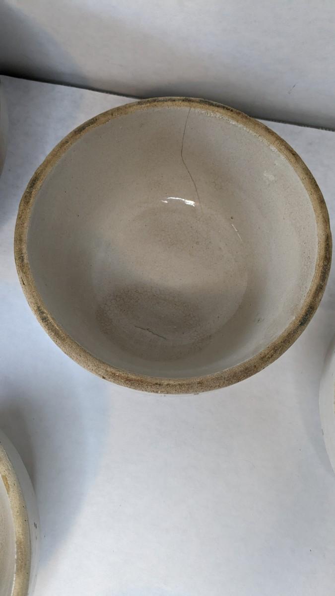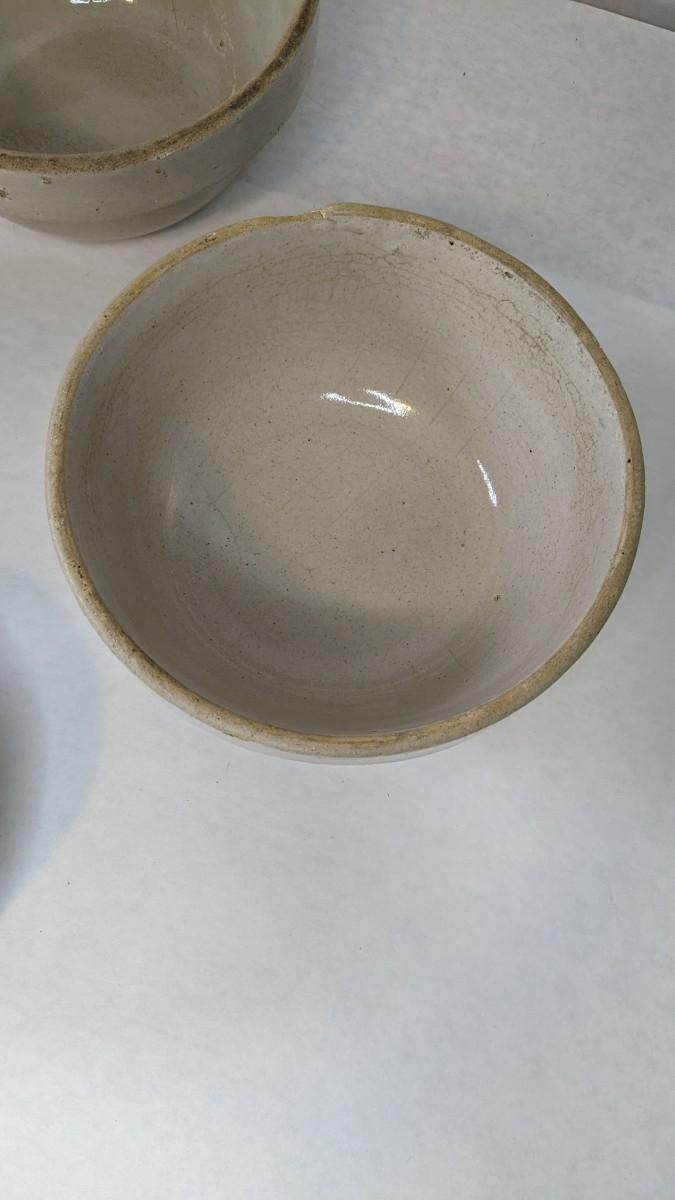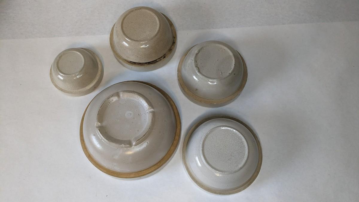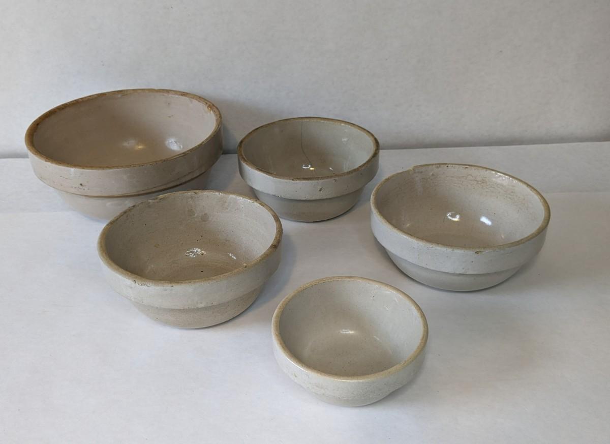 (5) Various size white glaze lipped crockware bowls, all unmarked with crazing and chips found to a couple pieces. These bowls nestle very nicely inside one another and make a lovely mated set. A rare and treasured find