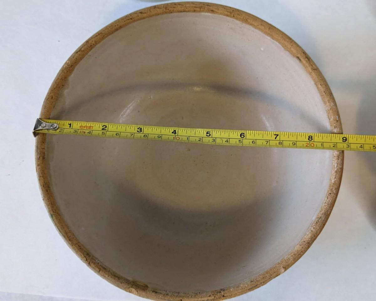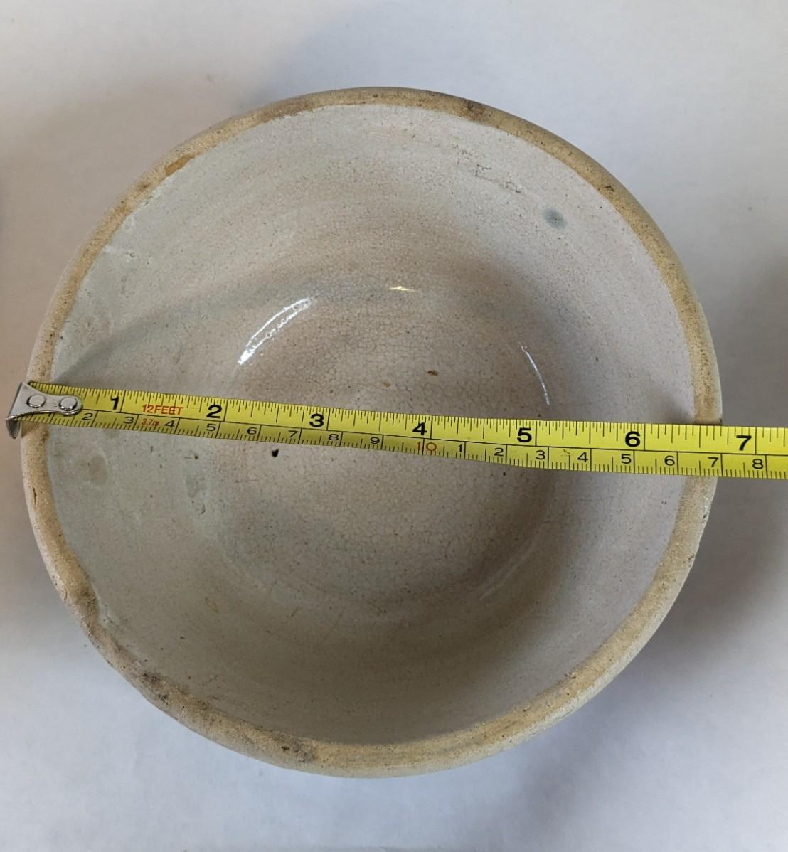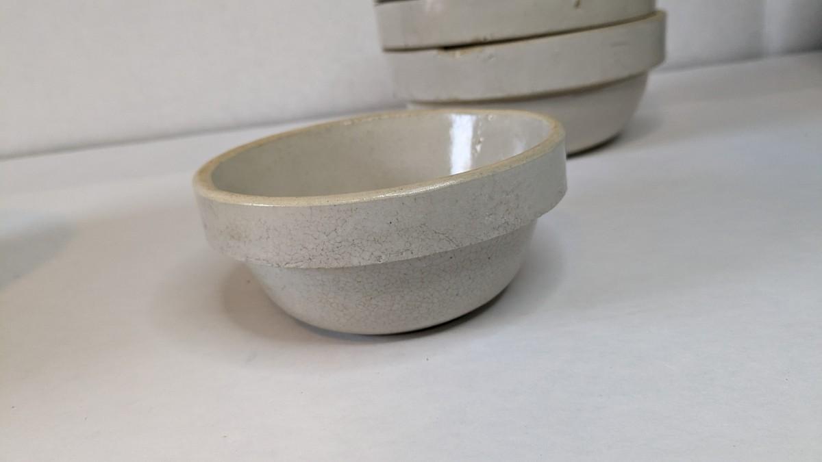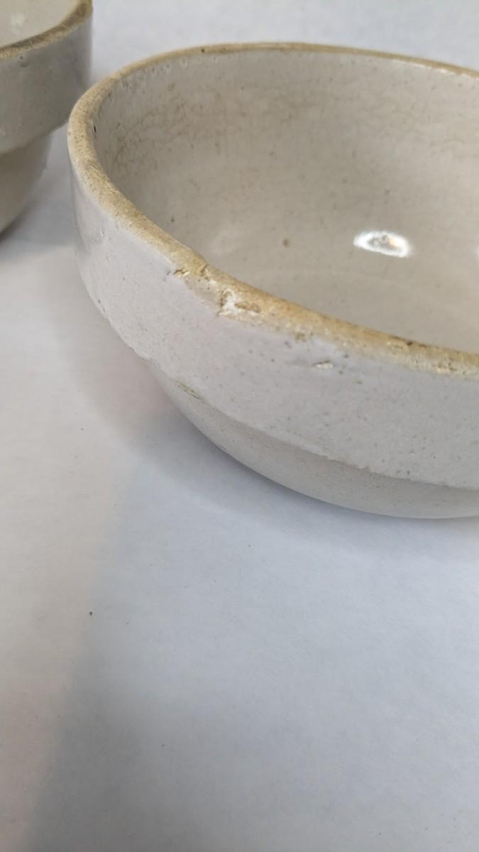 (5) Various size white glaze lipped crockware bowls, all unmarked with crazing and chips found to a couple pieces. These bowls nestle very nicely inside one another and make a lovely mated set. A rare and treasured find