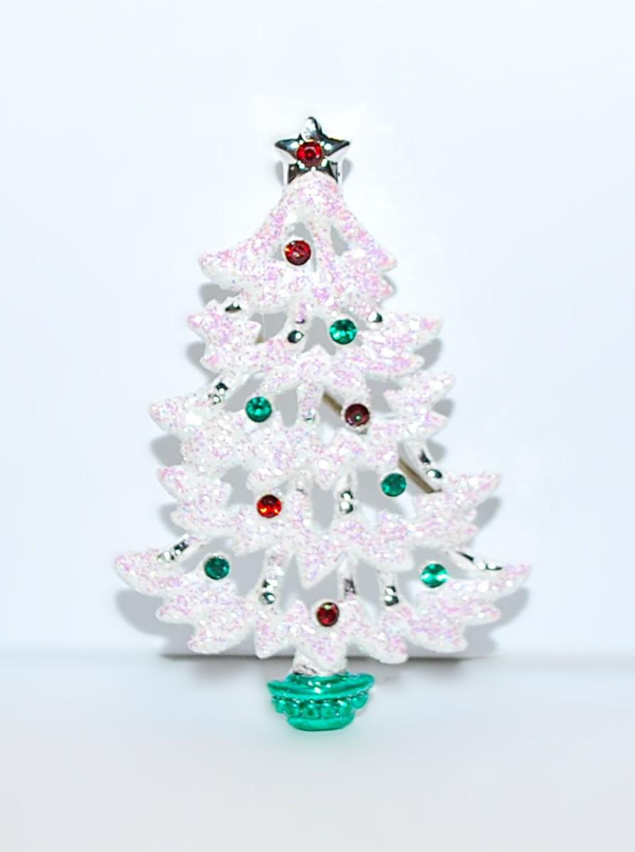 WHITE Glittery CHRISTMAS TREE BROOCH (2" x 1½") with Red & Green Ornament Accents and Silver Tone Setting