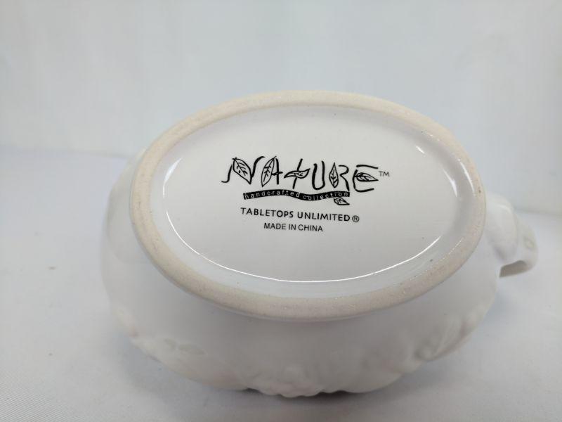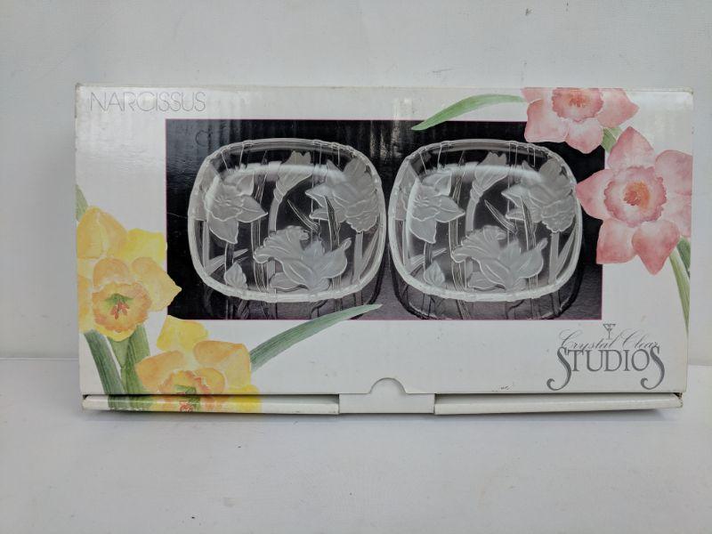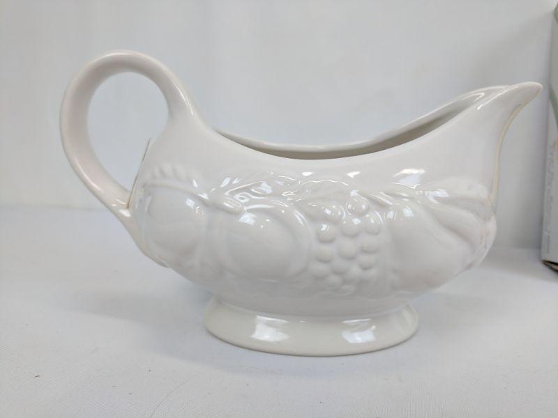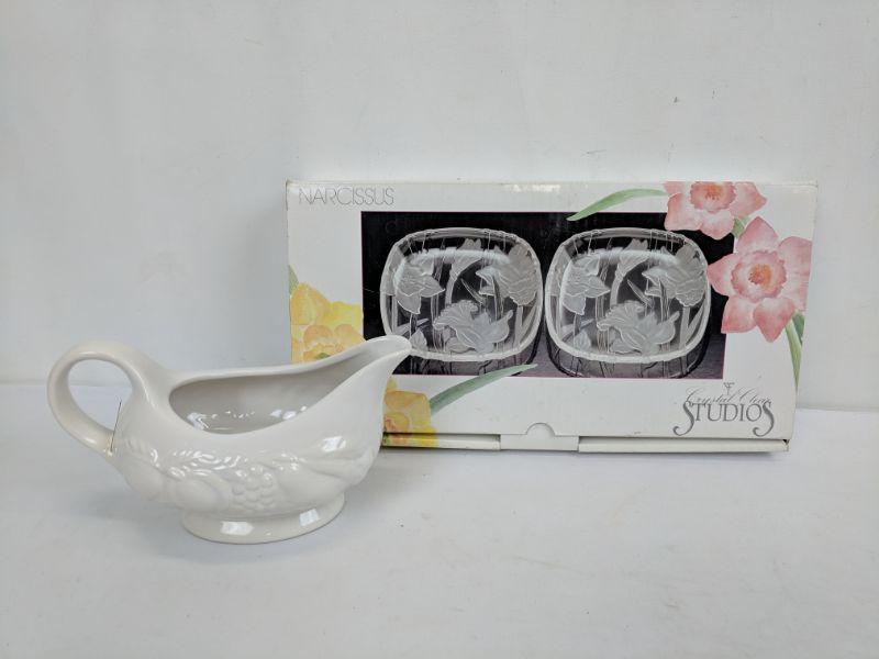 White Gravy Boat and 2 Clear Glass Narcissus Plates