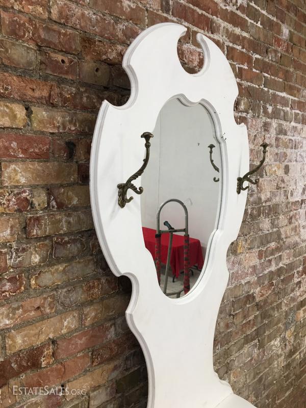 84" tall wood hall tree painted white some scraps to paint, nice brass coat hooks, mirror is in good condition. 30" wide, 13" deep.