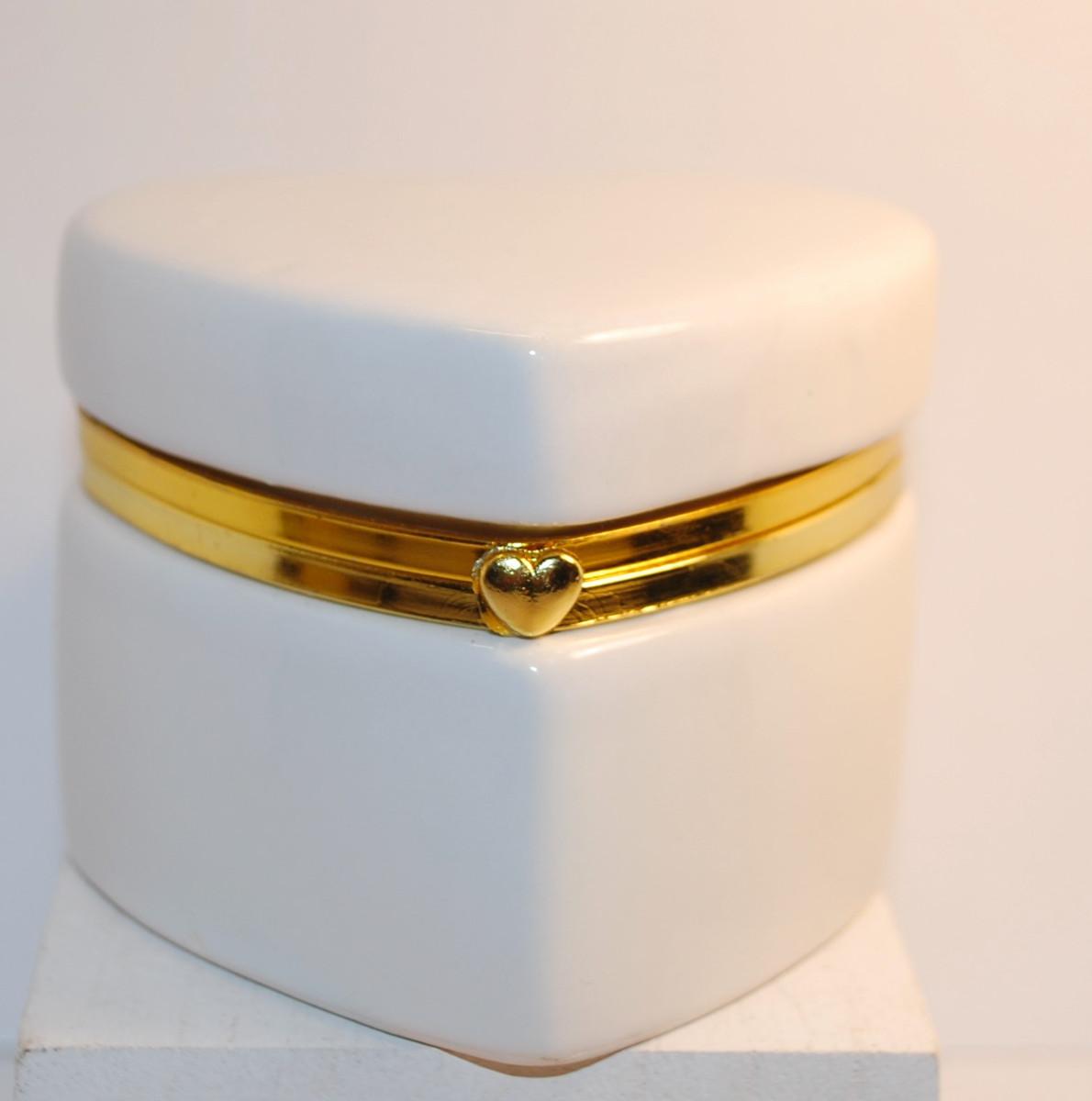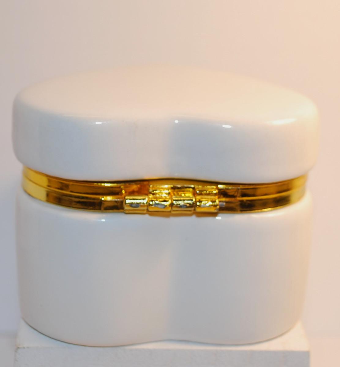 White Heart-Shaped Hinged Trinket Box with Gold Tone Trim 3" W x 2½" H