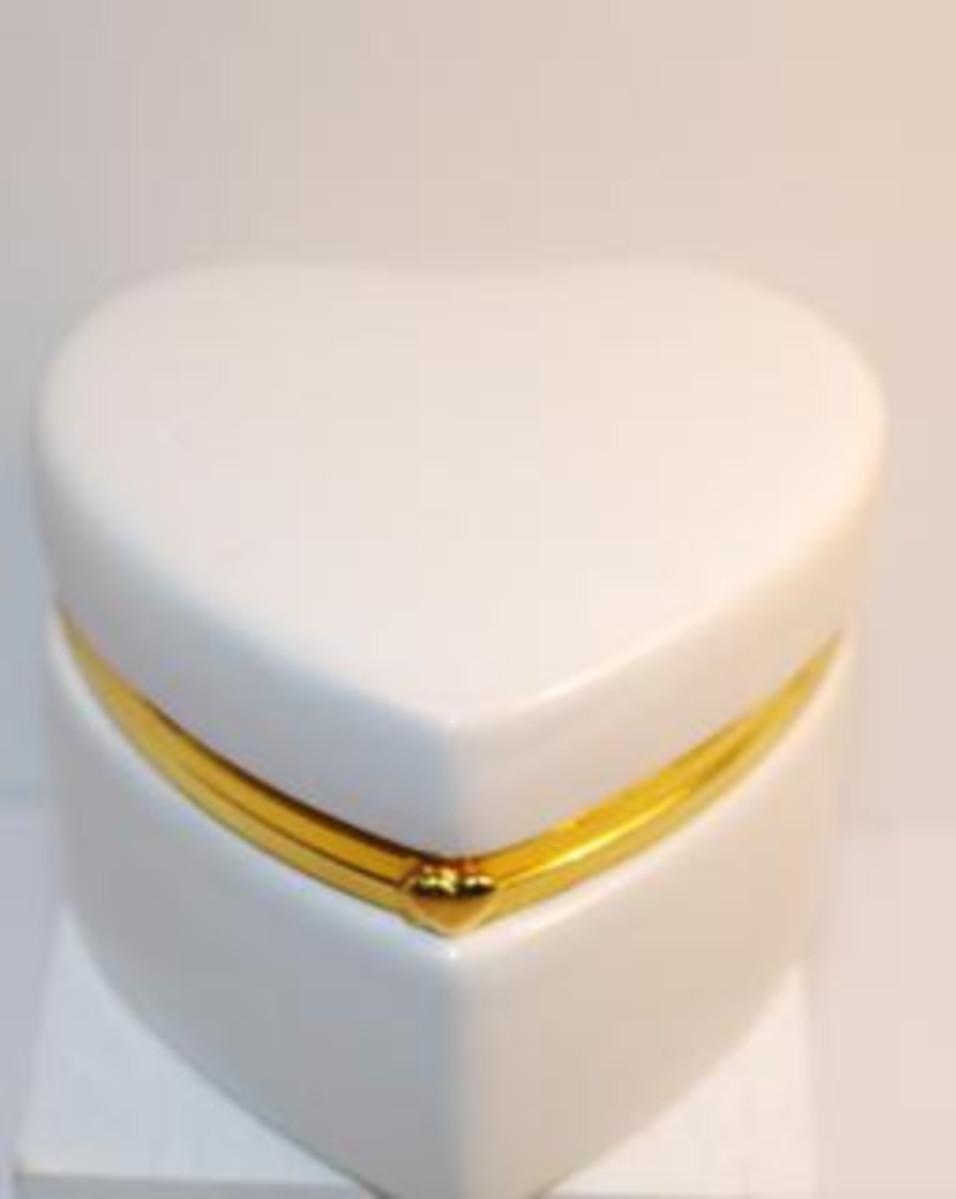 White Heart-Shaped Hinged Trinket Box with Gold Tone Trim 3" W x 2 1/2" H