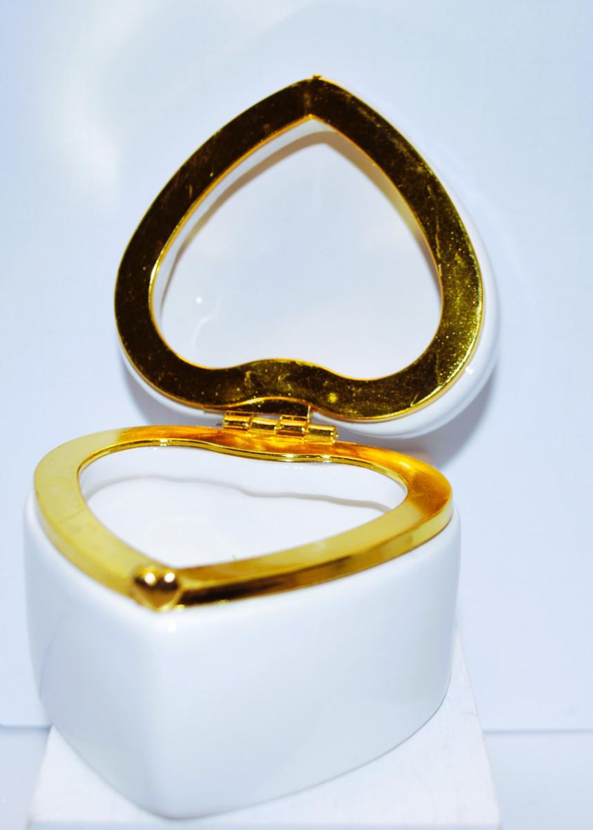 White Heart-Shaped Hinged Trinket Box with Gold Tone Trim 3" W x 2½" H