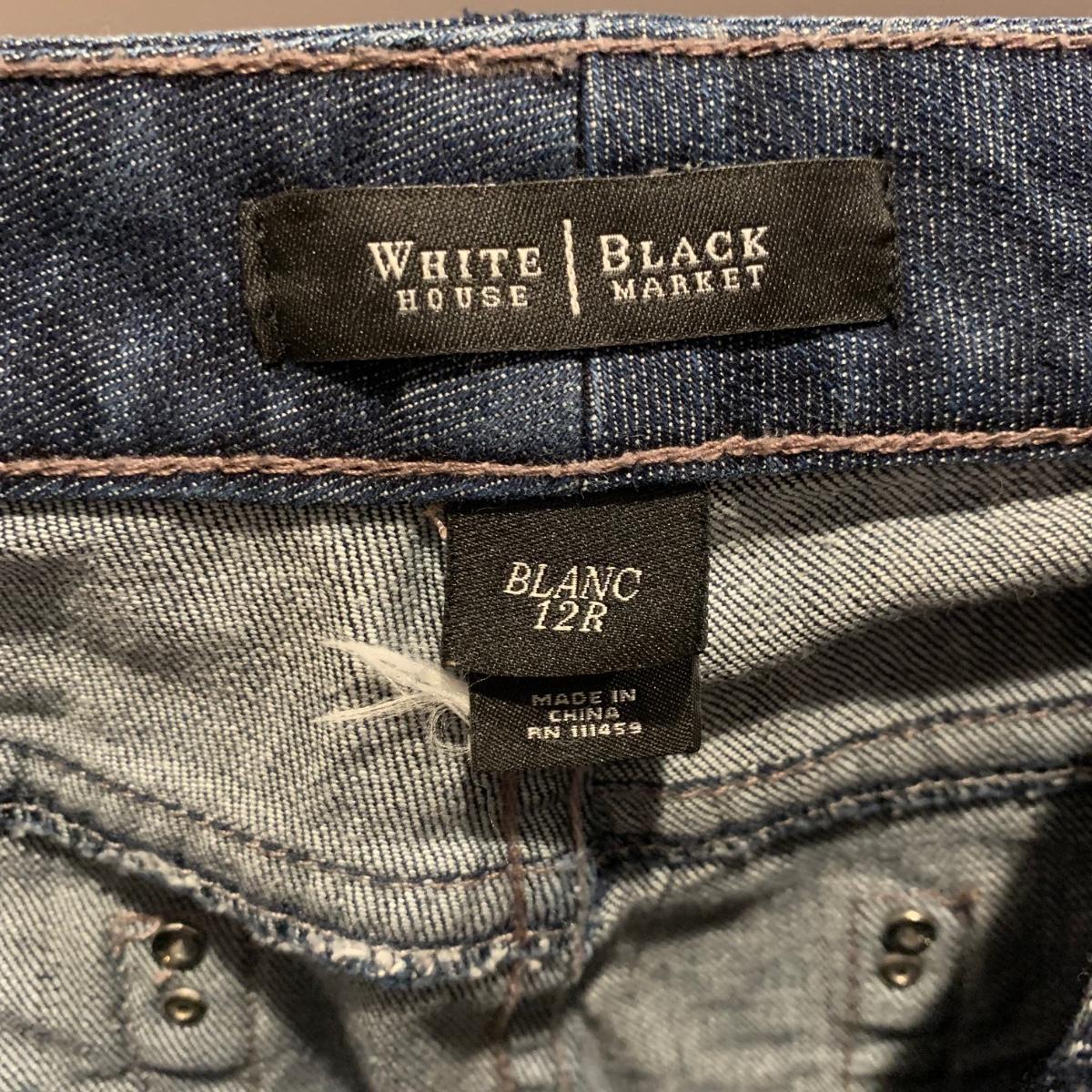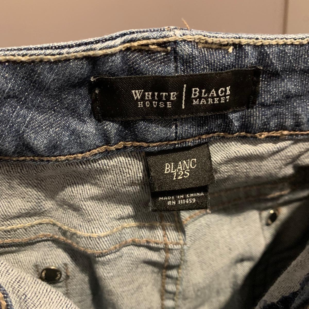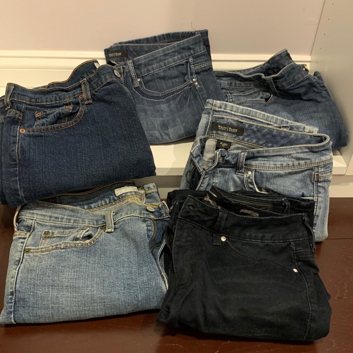 Six pairs of women’s jeans, two are size 10 and four are size 12. Jeans are by White House Black Market, Levis, and Seven Jeans.