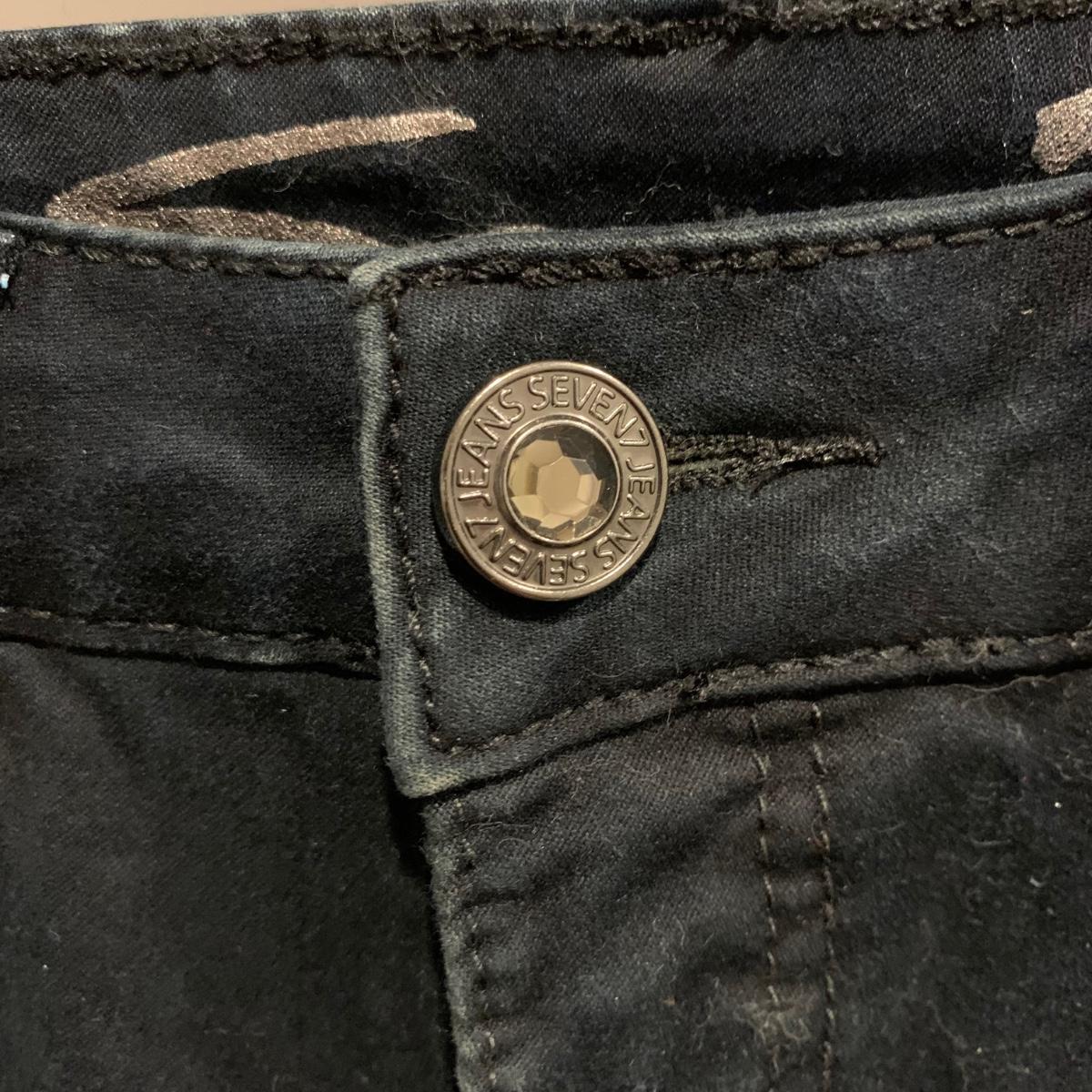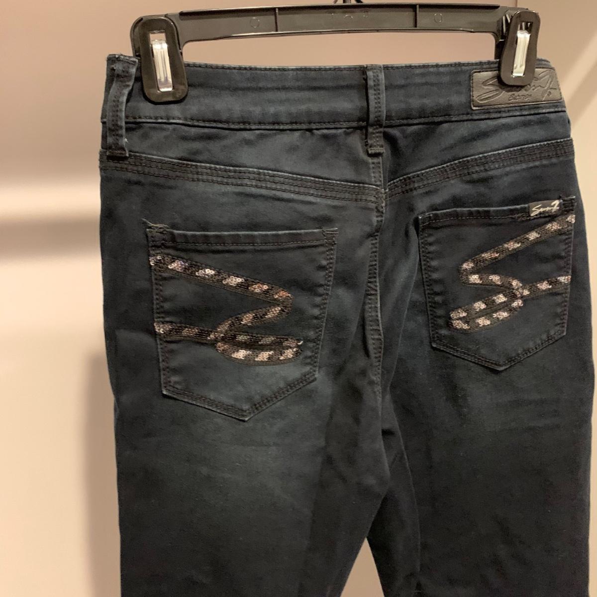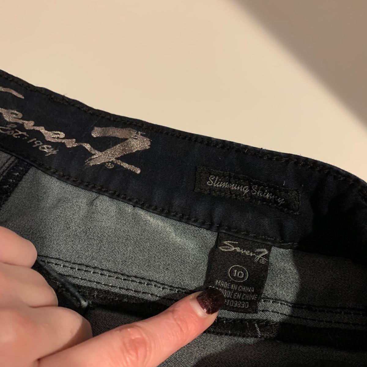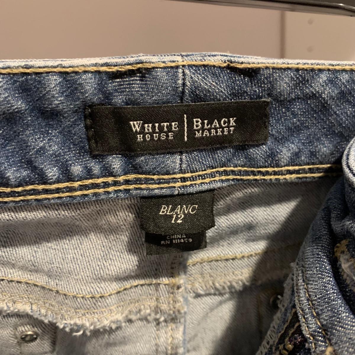 Six pairs of women’s jeans, two are size 10 and four are size 12. Jeans are by White House Black Market, Levis, and Seven Jeans.