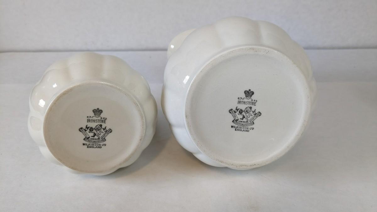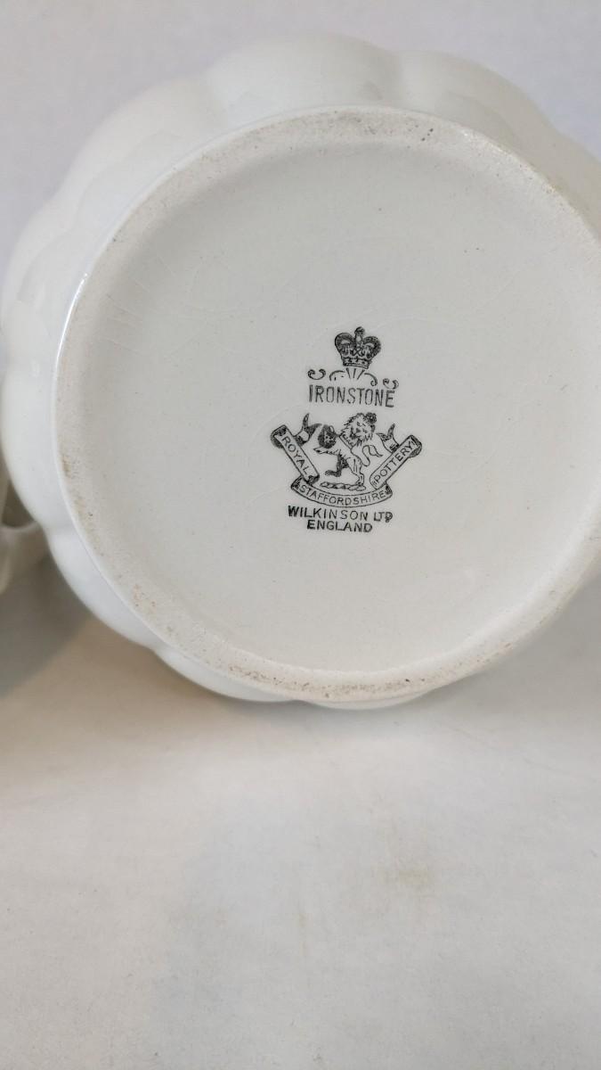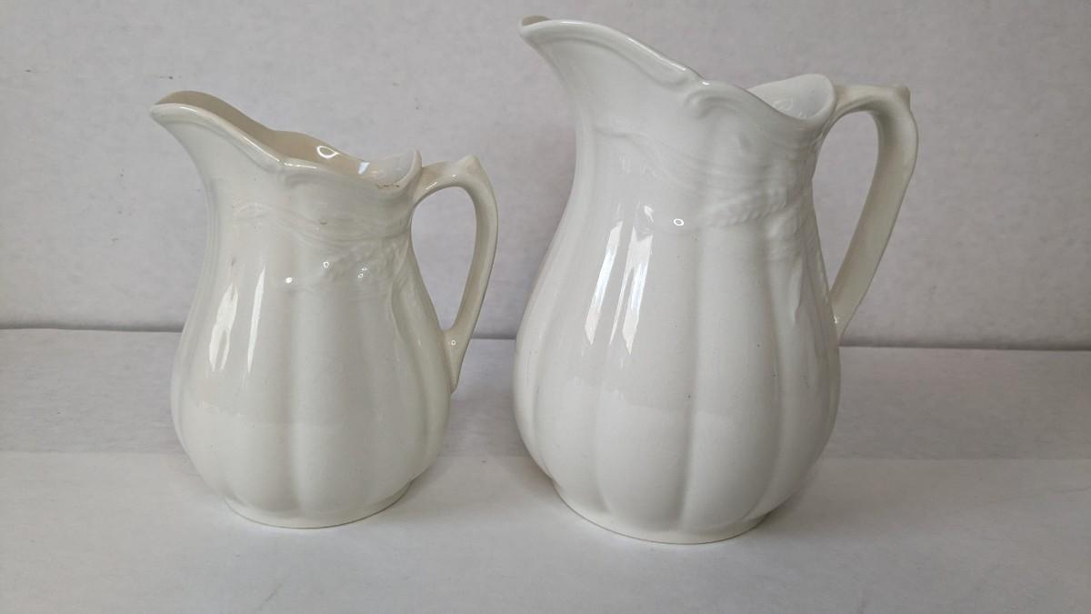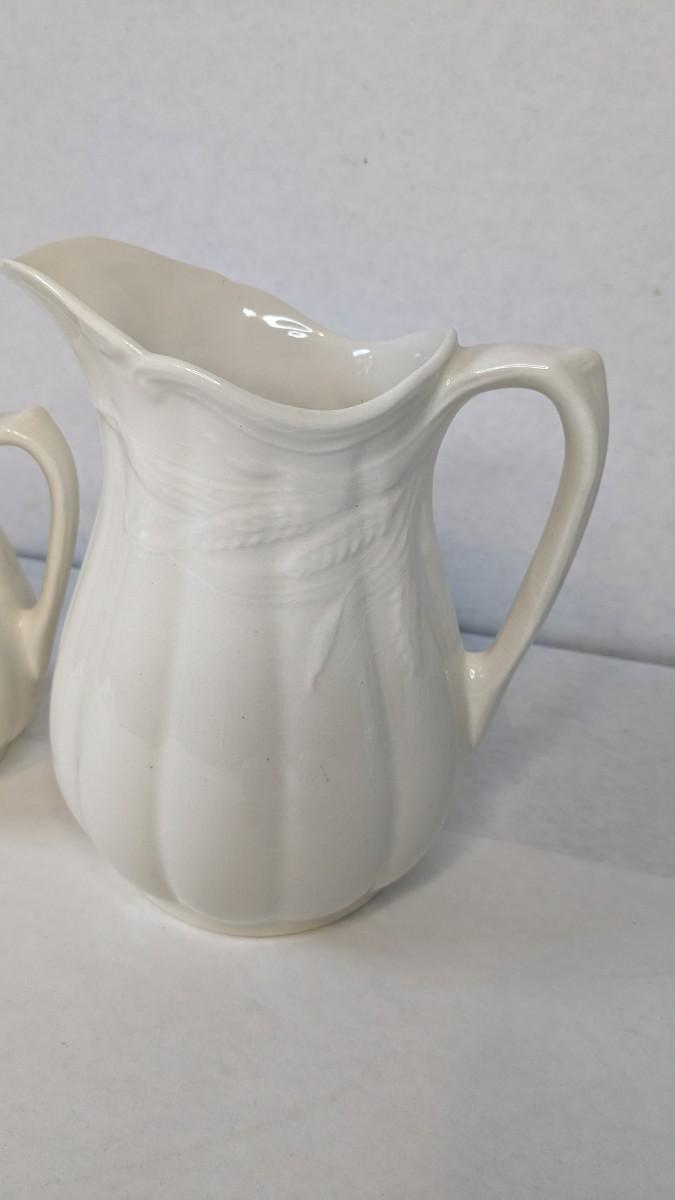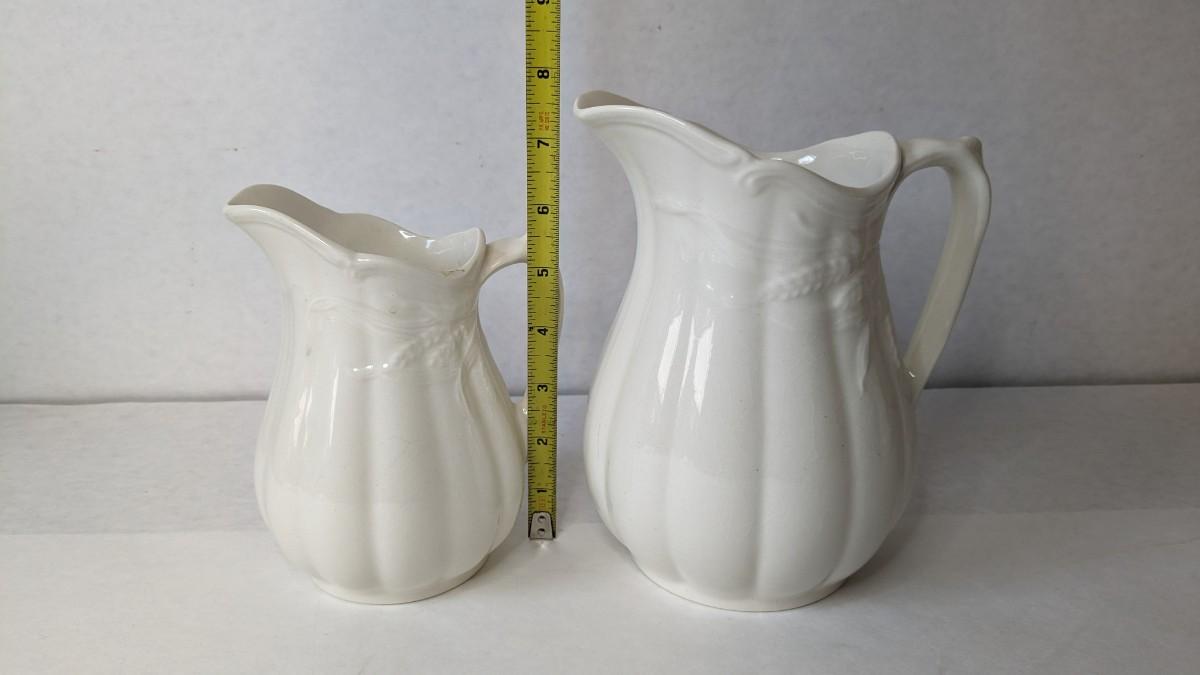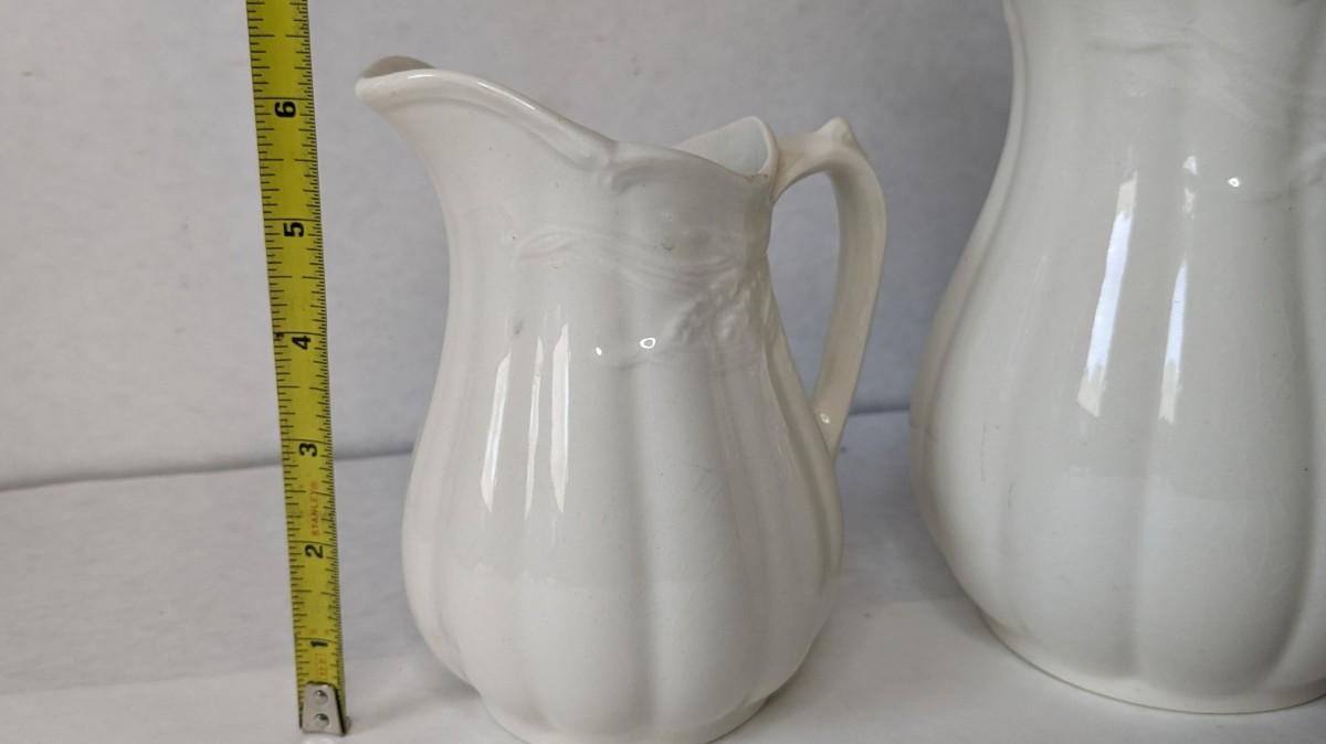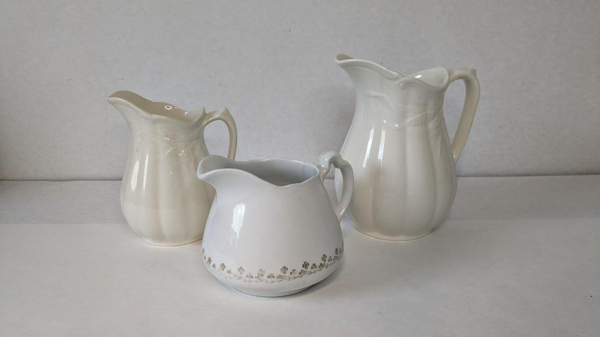 (3) varied size white pitchers. 2 are from Ironstone -England and 1 from Keystone. Each pitcher is in great condition with no chips or cracks noted, some light image wear on Keystone piece.